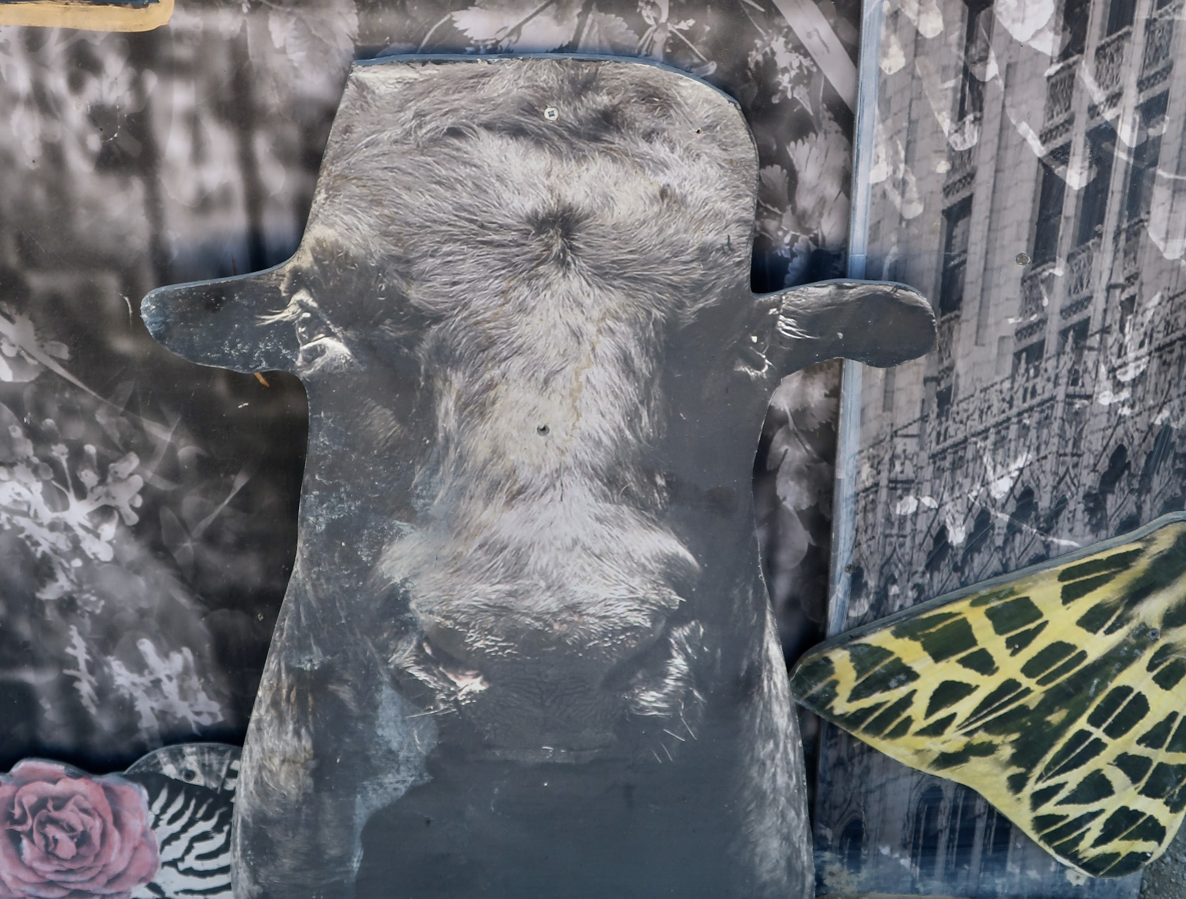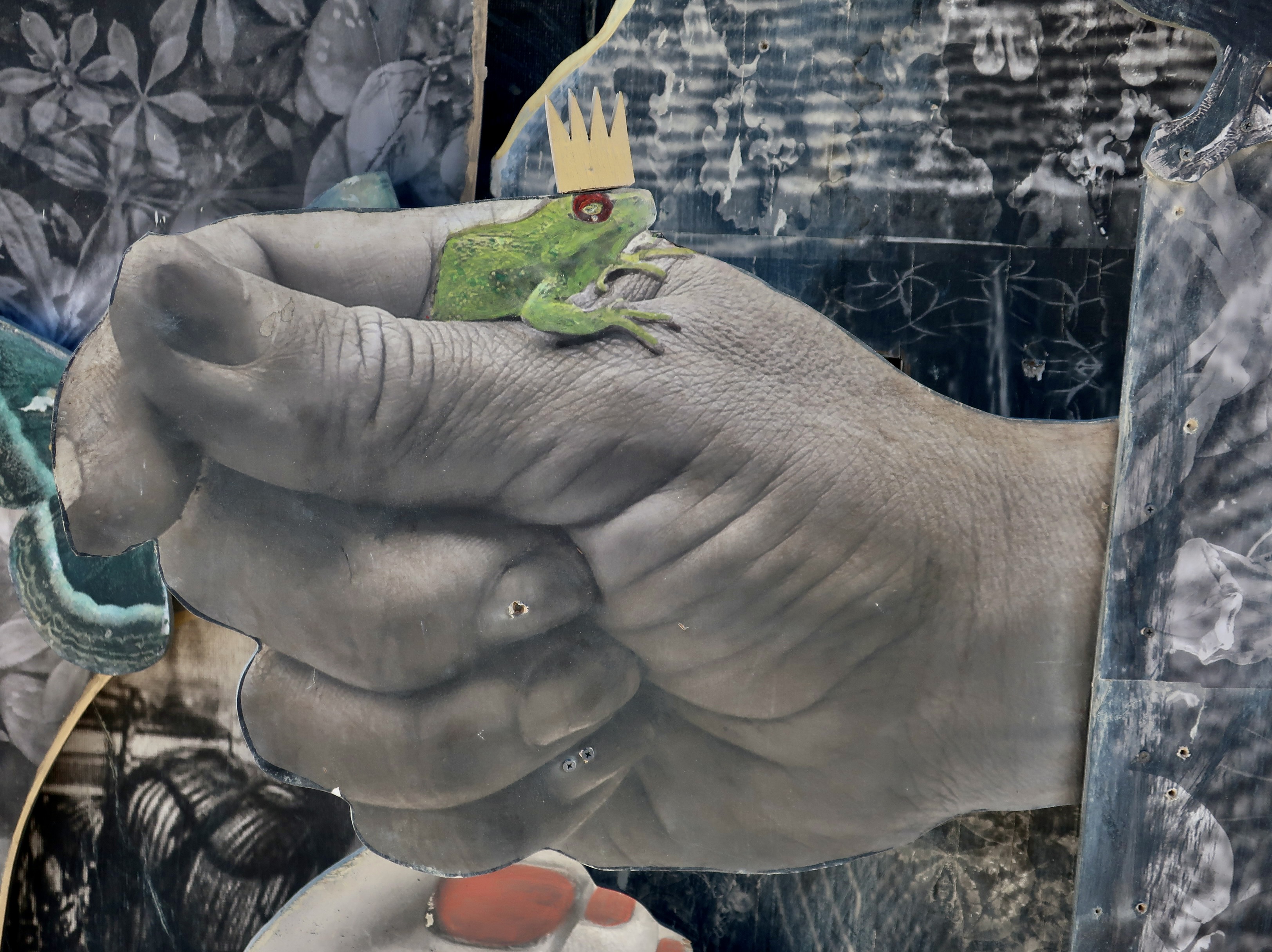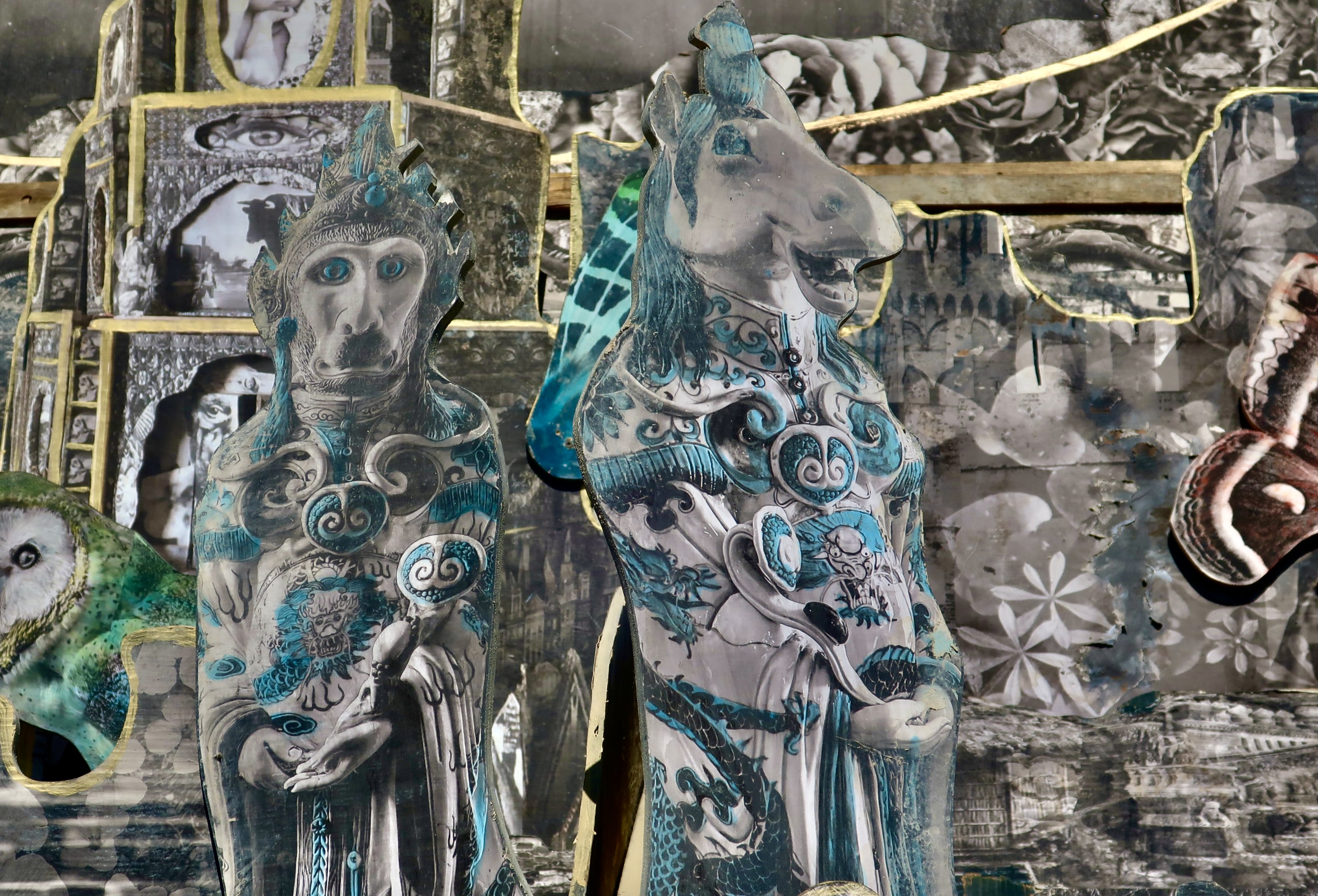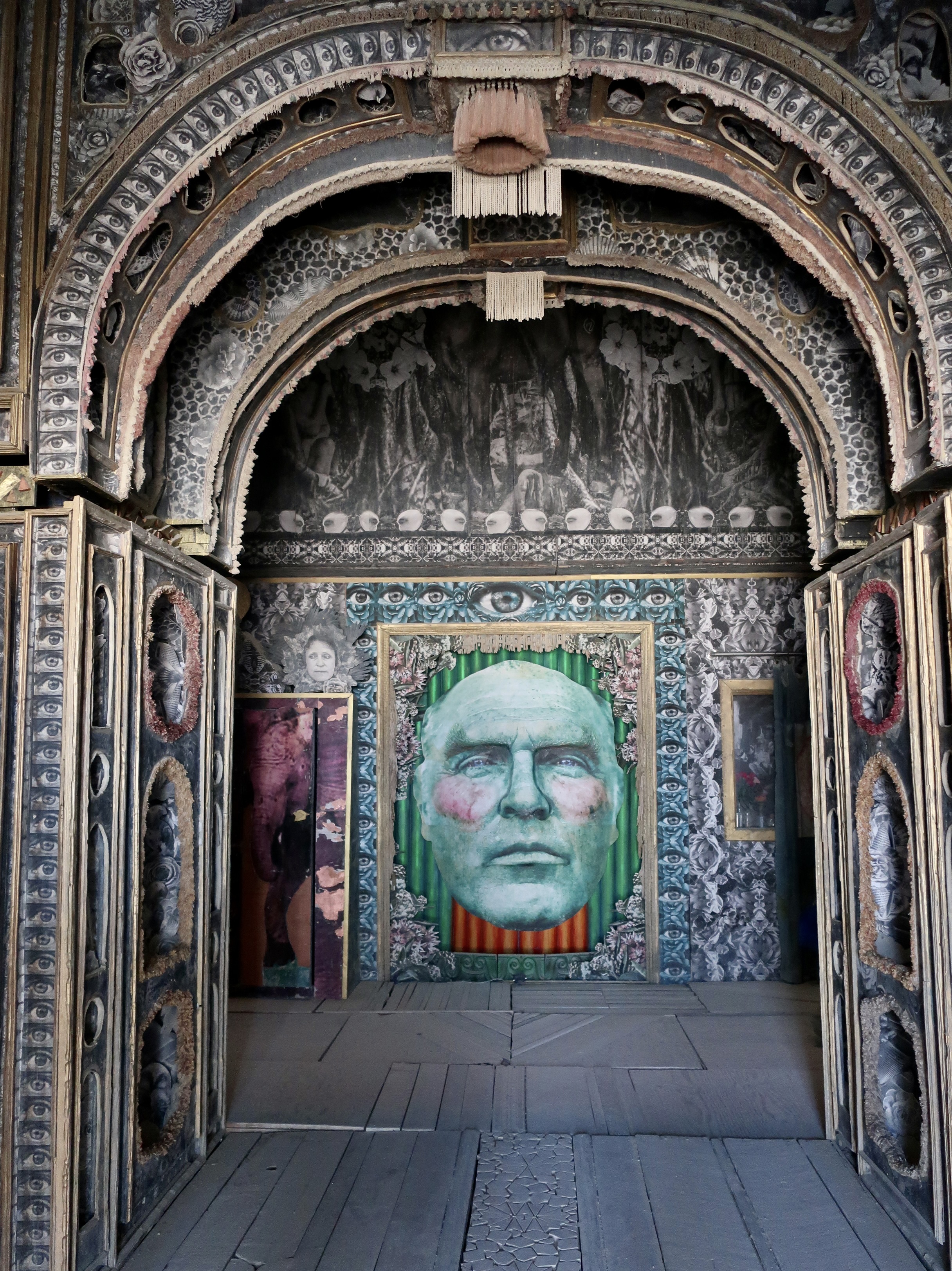 One could easily spend an hour checking out all of the photographs and images that were located on the Temple of Babel. And contemplate what they meant. It seemed to me that the two nudes and the cat were inviting you to crawl into the cave. Would you? Grin.Or was the cat the devil? And who is Paul? I’m guessing one of the volunteers who helped with the massive job of putting the structure together. All sorts of things here but the foot and the hand stand out.A small tree frog with a crown was emerging from the hand. Kiss it and you’d get a prince. Maybe.A cow. While the chickens may be long gone, there are still cattle ranches in the Petaluma area.A chimp and a horse monkeying around.Even El Pulpo Mechanico made it to the party.Inside, Garlington featured a photo of his father that he called the Wizard of Pa. (Mom is up on the left.)There was ever so much more to the Temple of Babel, but I think this is a good photo to wrap up this post. Garlington and Bertotti have stated that this is their last temple. Having escaped Burning Man because of the rains, Peggy and I weren’t around to see it burn but I read that Garlington urged Burners to help themselves to the art before it burned in a grand give-away gesture, worthy of him and Burning Man. We wish we could have been there.