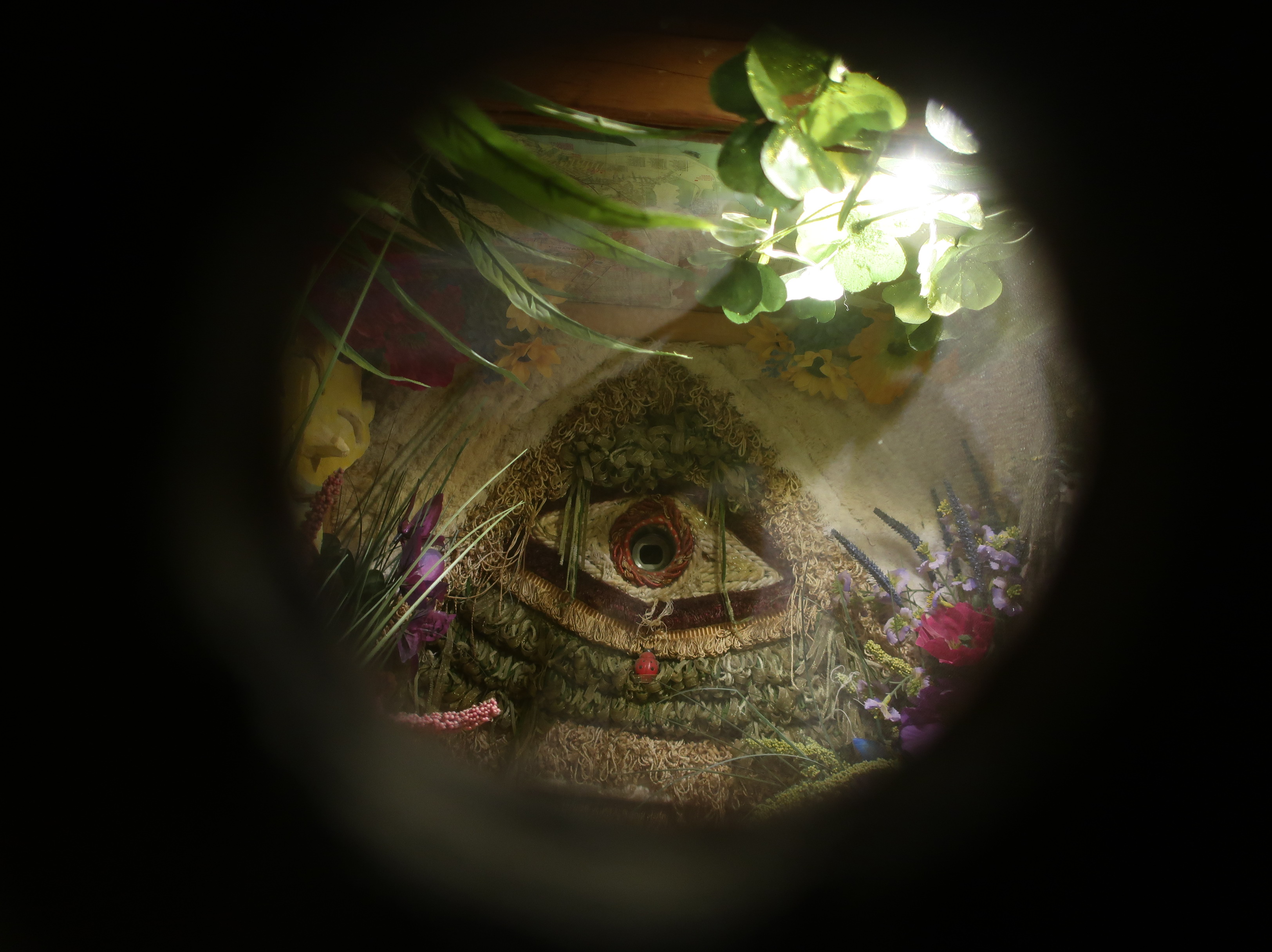 The creativity/ingenuity at Burning Man is unending. Previous Garlington/Bertotti works at Burning Man have taught me to look in peepholes to discover miniature worlds. This one in the Chapel of Babel was just big enough to accommodate the lens on my small Canon Power-Shot. An eye was staring back at me. A lady bug and an aphid were having a stand-off on the eyelid!