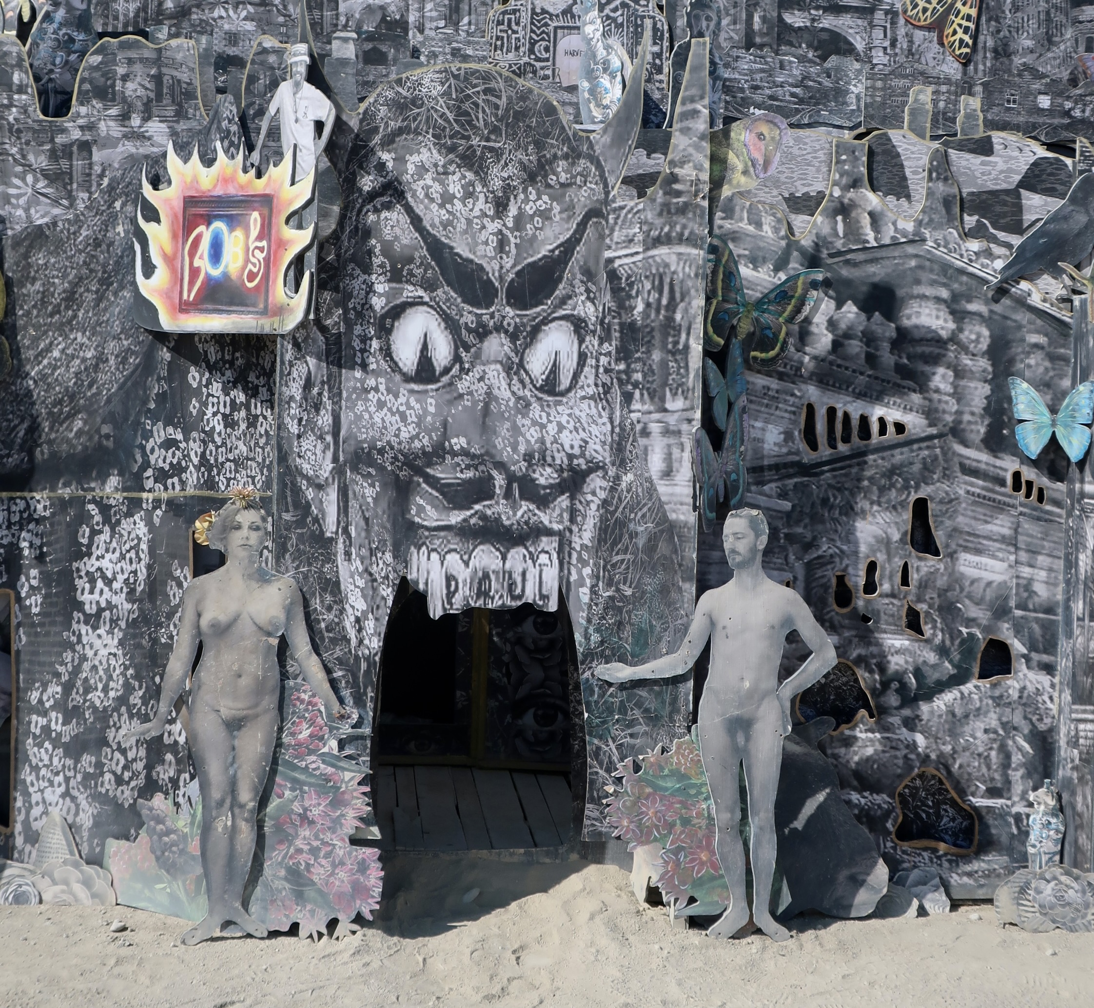 Michael Garlington and Nancy Bertotti from Petaluma California brought another one of their creative, photo-covered structures to Burning Man 2023, the Chapel of Babel.