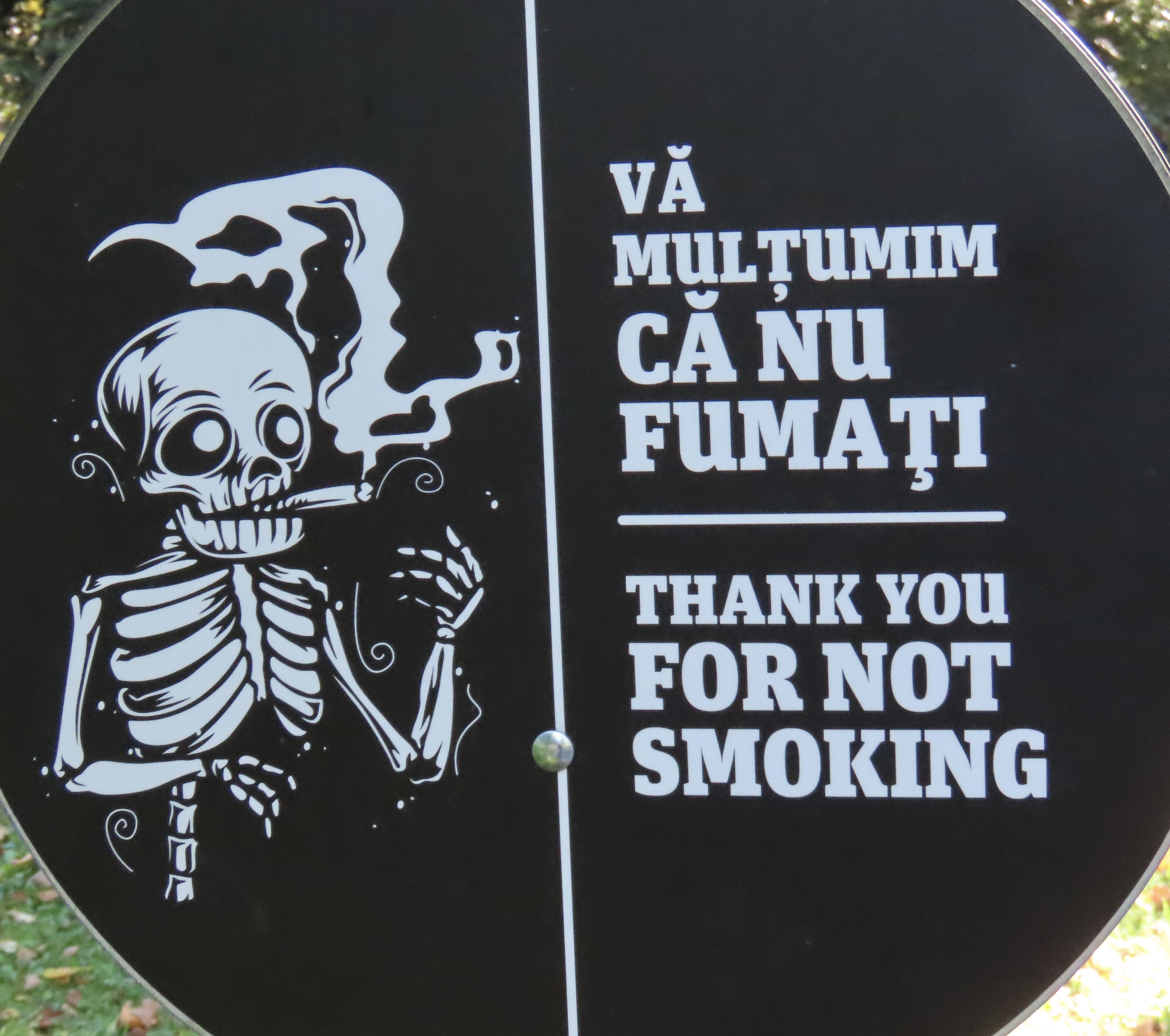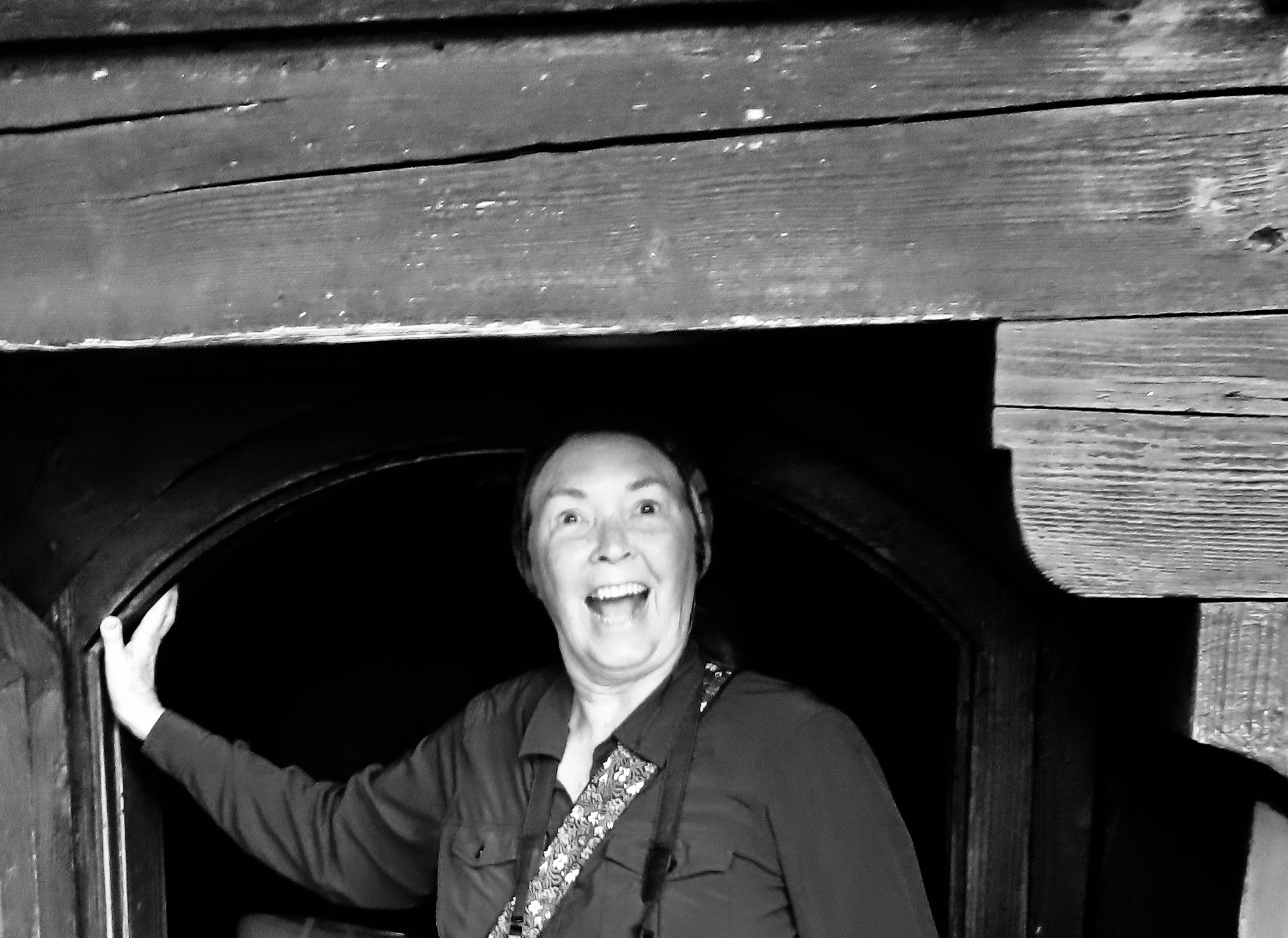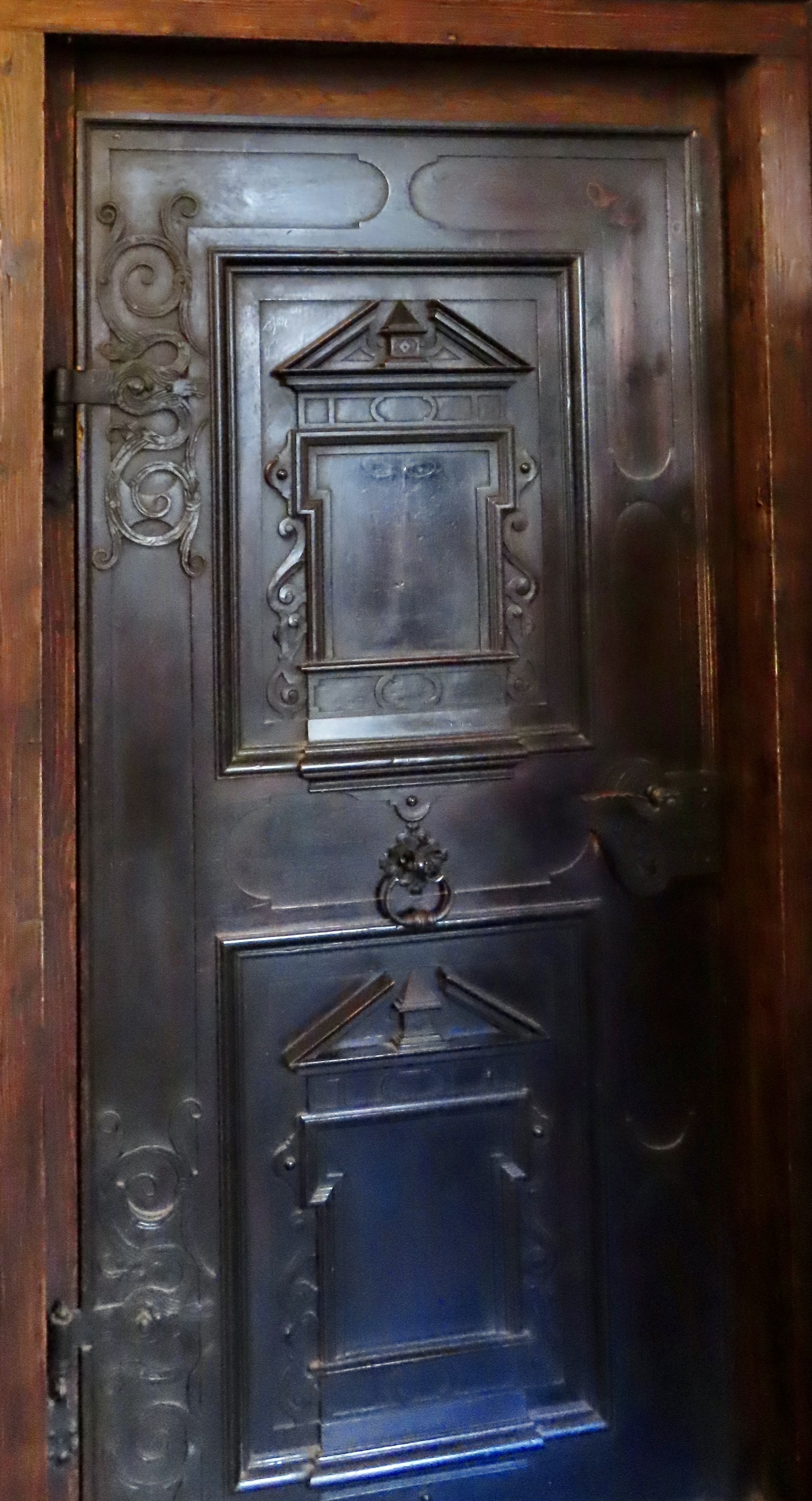 Peggy and I never expected to visit Dracula’s Castle in Transylvania but there it was on our Danube River trip itinerary. How could we resist? Halloween was only 2 1/2 weeks away.I felt right at home.There were even places for naps.And to sit.Or stand if you preferred…There was a danger of being tied up, however.And ghosts. This scary fellow was floating back and forth in a dark room, like a caged wild animal. Optical illusion? Perhaps…A wild lion with vampire sharp teeth peered out from a table…A lioness with frightening sliced eyes was hidden among scroll-like decorations.Looking closely, other evil creatures seemingly appeared out of nowhere, like this satan goat with dead eyes and his companion, a horned dragon.Even door knockers were threatening. “Beware!” rather than “Welcome” was the message. Monsters’ heads peered out from the medallion. Two snakes slithered out, wound around the knocker, and became a second set of massive horns on a cruel face with pursed lips.Strange metal doors invited opening. Dare we? What dark secrets does the room hide? Eyes stared out from the top panel. Halloween scary for sure.Peggy entered a dark room and came out screaming. Had her hair fallen out? (Our guide had hidden behind a curtain and jumped out yelling.)And there were lots of dark, narrow, ancient stairs to climb that led to mysterious heights. Was this damsel in distress wearing a nervous smile about to become Dracula’s latest victim? (We were traveling with Peggy’s brother John and his wife Frances. This is Frances negotiating the ‘dark, narrow stairs,’ with a smile.)Even the castle’s no-smoking sign had a bit of Halloween-type humor, which brings me to something much more scary than Bram Stoker’s Dracula, the real, historical Dracula, son of Dracul…Vlad the Impaler.