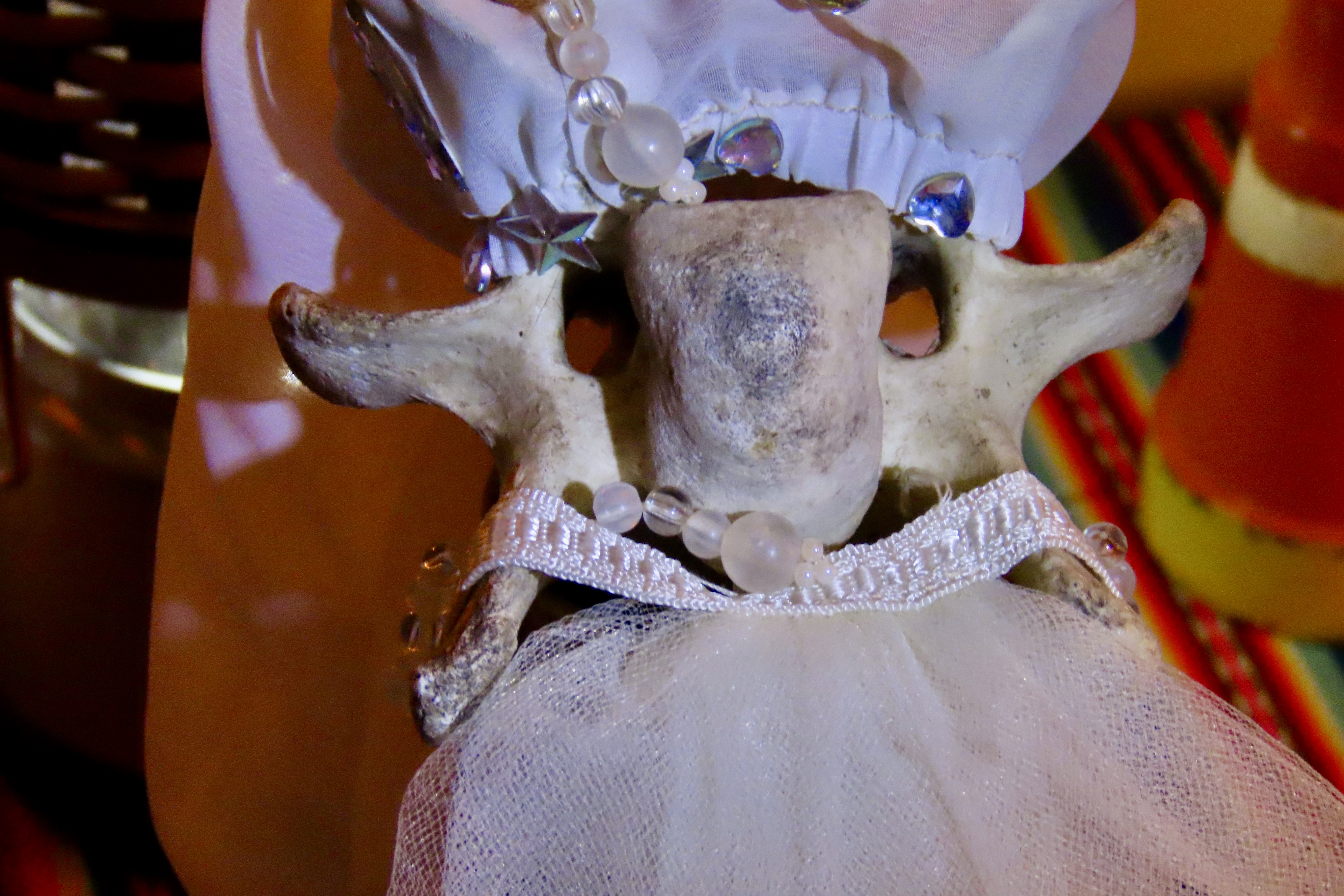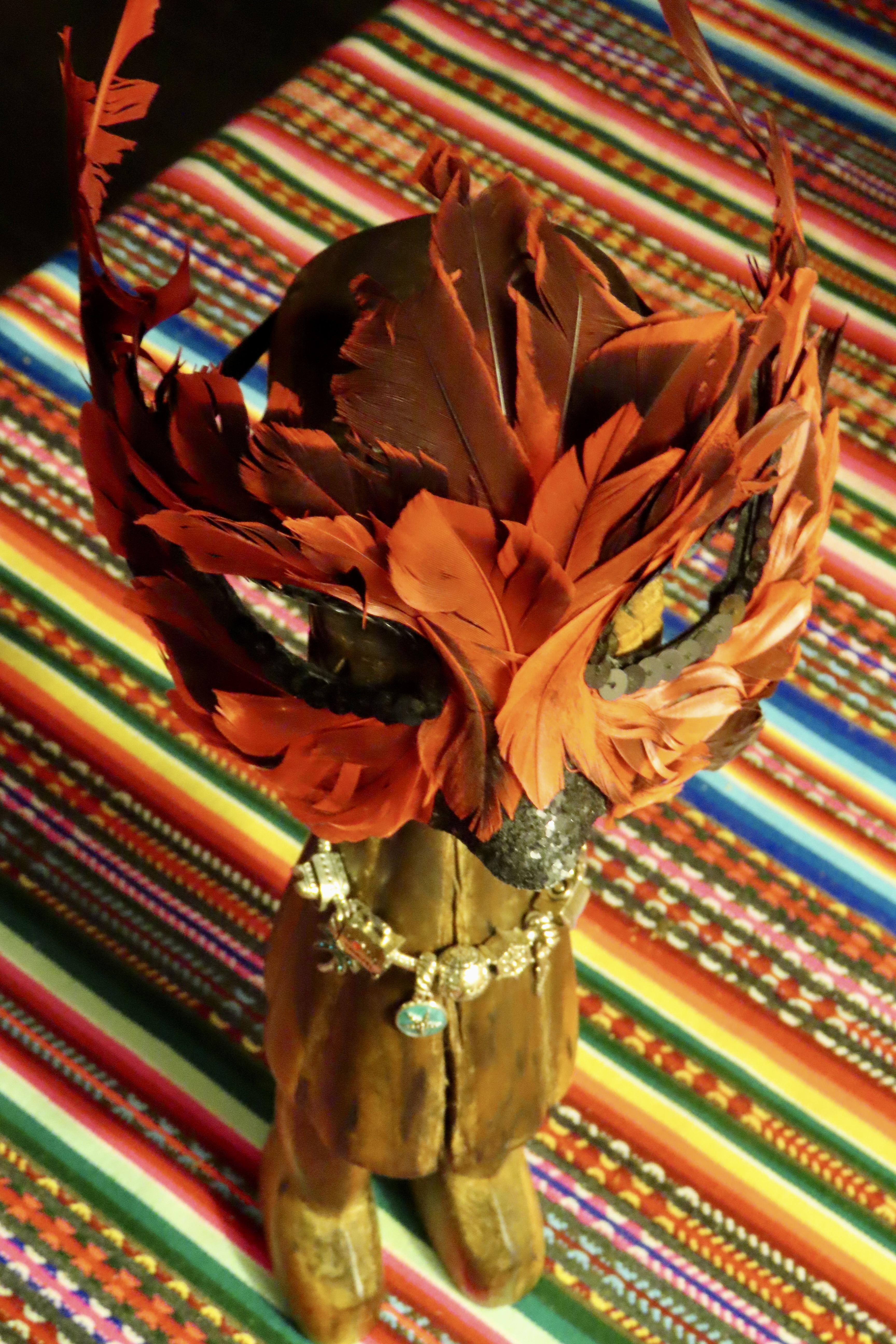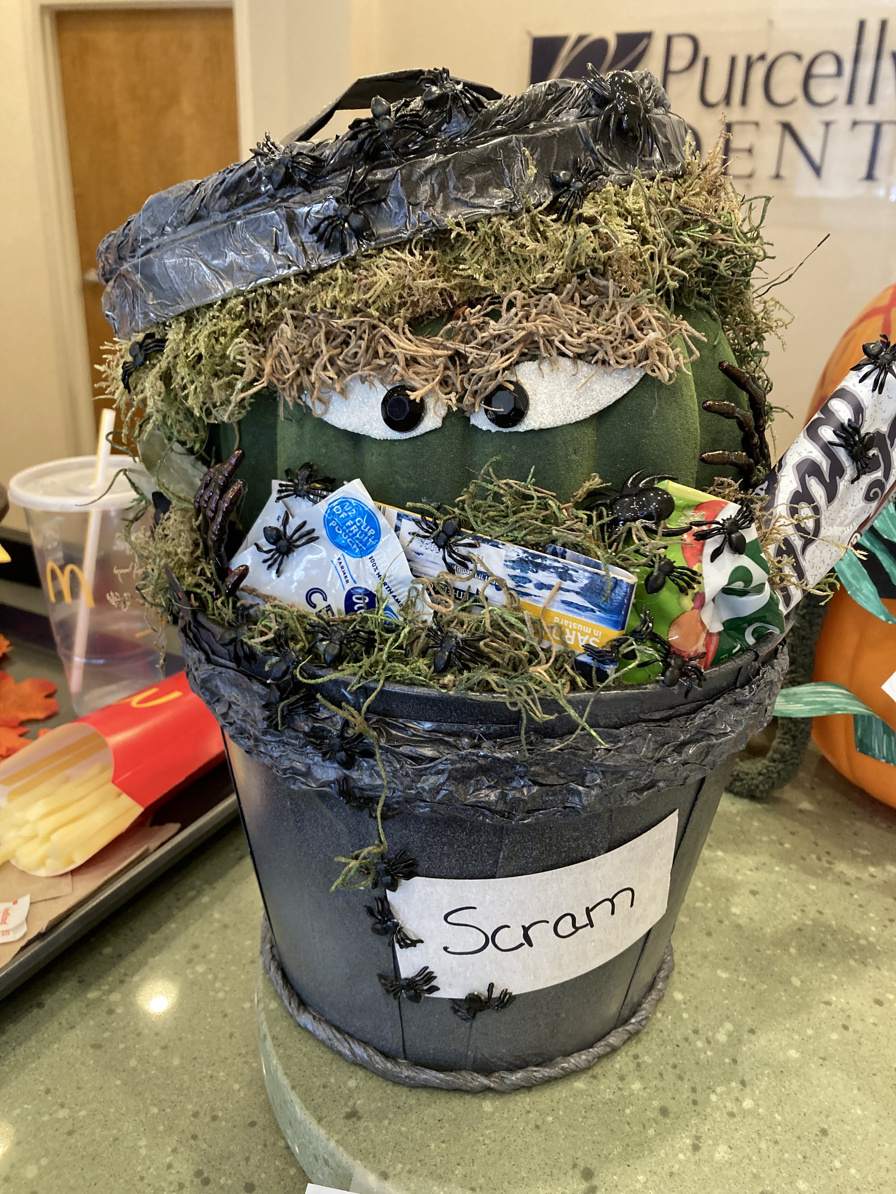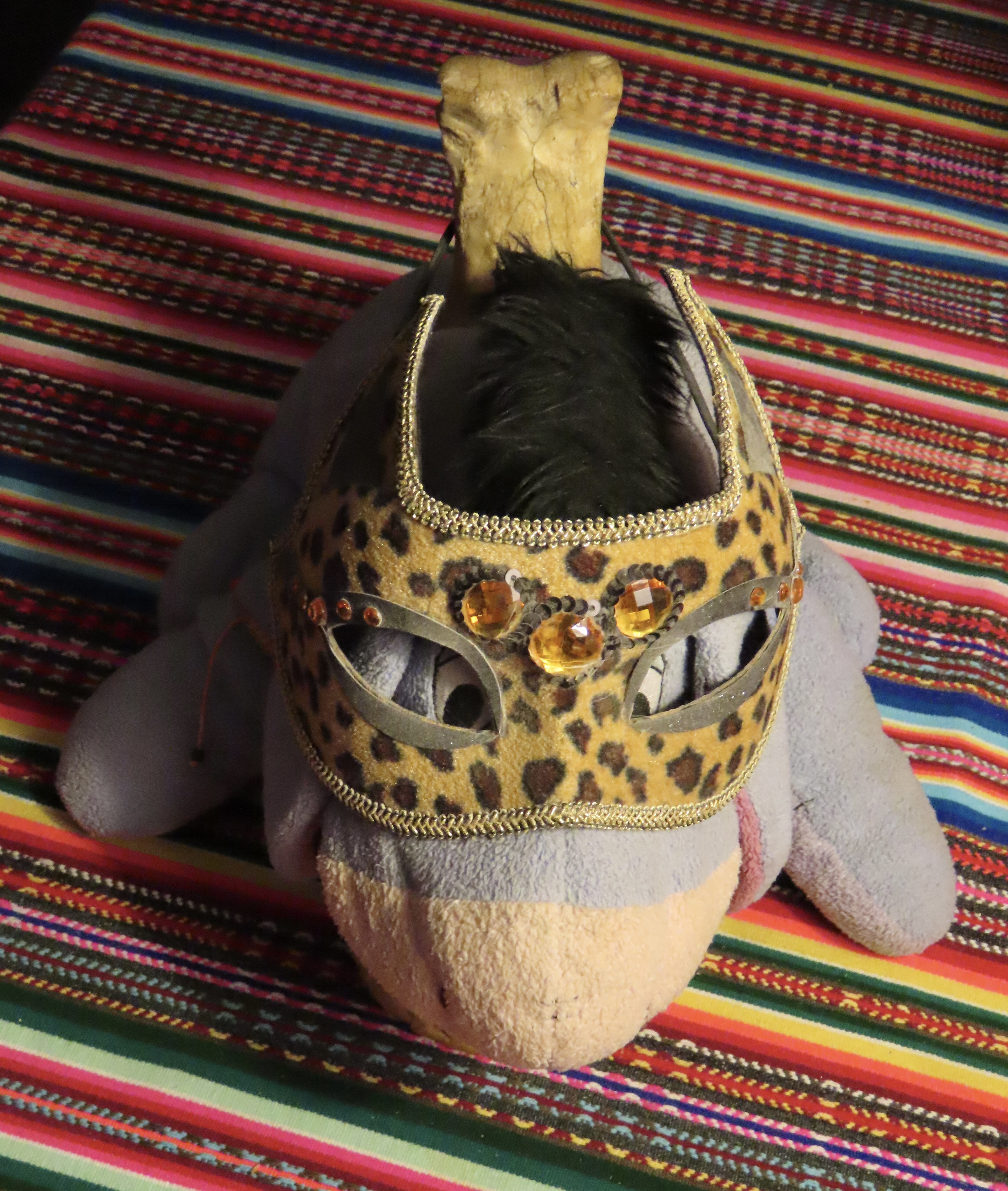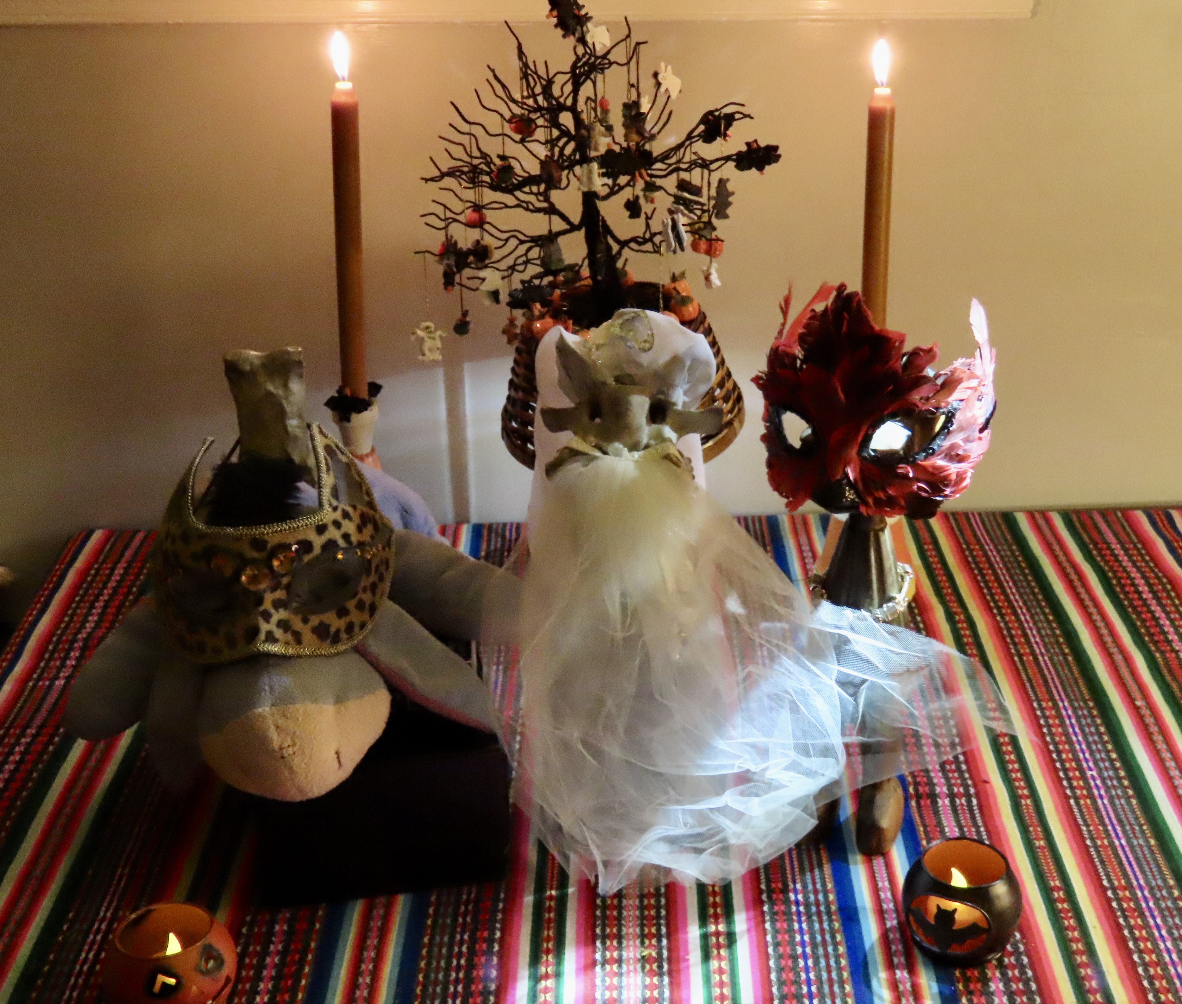 If you’ve been around this blog for a while, you know Bone, Eeyore, Bonetta, and George, the African Bush Devil. Bone has been wandering the world for 47 years, ever since Tom Lovering and I found him while backpacking south of Lake Tahoe; Eeyore has been his traveling companion for 25 of those years; Bone found Bonetta in a Florida swamp and married her at Burning Man; George came home with me from Africa in 1967 and is on the front of my book about my Peace Corps experience: The Bush Devil Ate Sam. They dressed up for Halloween— and you— using their Burning Man costumes.Eeyore and Bone have been wandering around North America together for 25 years. Bone gets Eeyore into trouble and Eeyore gets Bone out of trouble. Eeyore is wearing his leopard mask. Bone, BTW, is naked, which is his Burning Man costume. If Eeyore appears a bit bedraggled, it may be because he served as an elementary school mascot before joining Bone.The gorgeous Bonetta put on her Burning Man wedding dress to appear as the Bride of Frankenstein. (Baby Bone was sleeping in his coffin and no one wanted to hear him scream if he woke up.)George is wearing his dramatic Red Hawk mask. He was carved by a leper in Ganta, Liberia.And finally, the Mekemson and Cox Family Pumpkins. Clay’s lurks threatening in the background. Tasha’s is a First Grade Monster with eyes peeking out on the side. Ethan’s is an AI Robot (scary as a category five hurricane). Cody’s large mouth pumpkin is throwing up his innards. Peggy’s is the Castle of Dracula, and mine is Dracula’s Teeth. (I have a dental appointment this week and all I could think of was teeth. How much scarier can it get than trip to the dentist?)Actually, my dentist, Dr. Tim Smith, and his staff at Purcellville Dental are excellent. And have a great sense of humor! Their annual “Decorate for Halloween Contest” was underway. Each staff member creates a ‘Jack-o-lantern’ and patients are invited to vote for their favorite. This was mine.