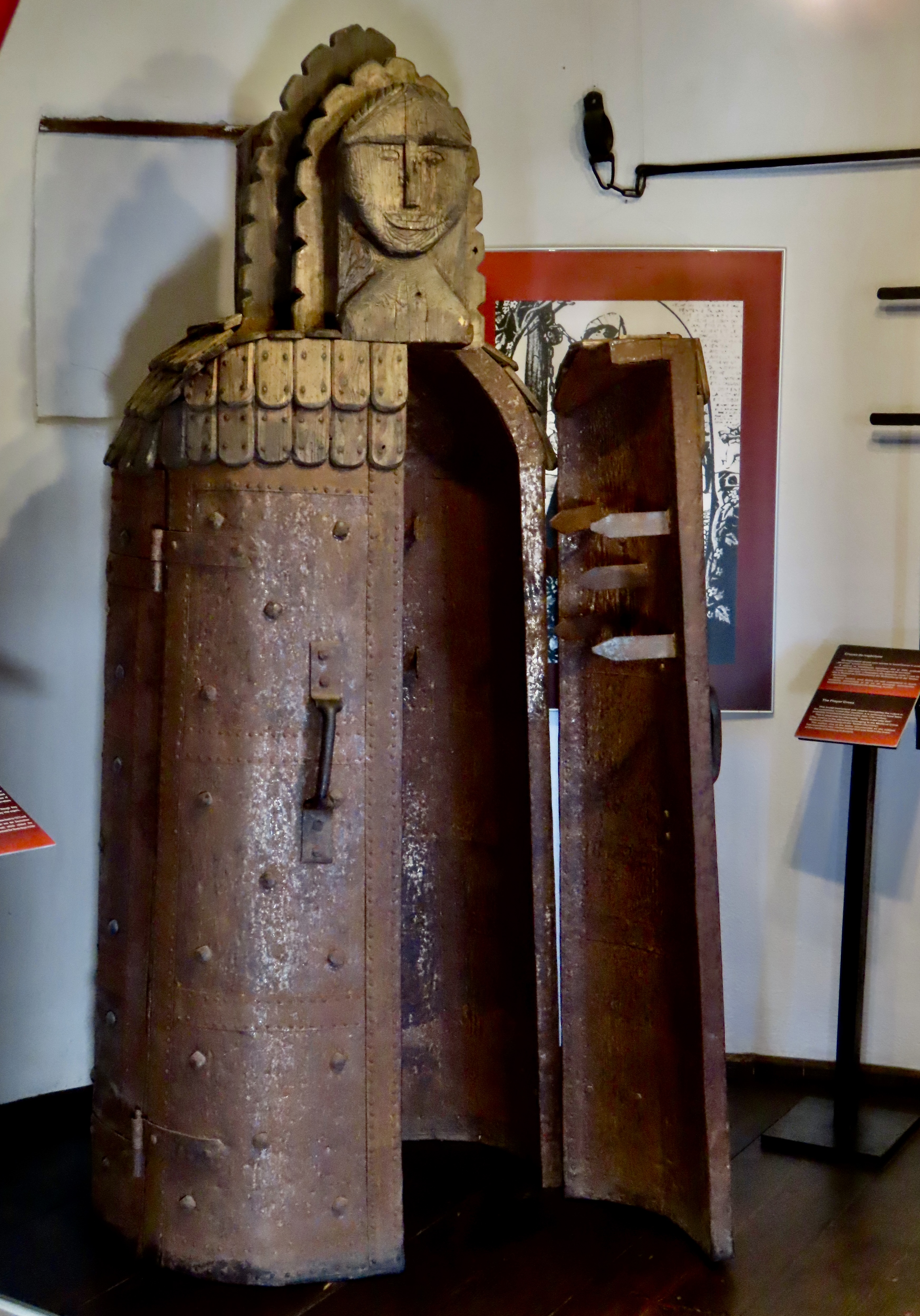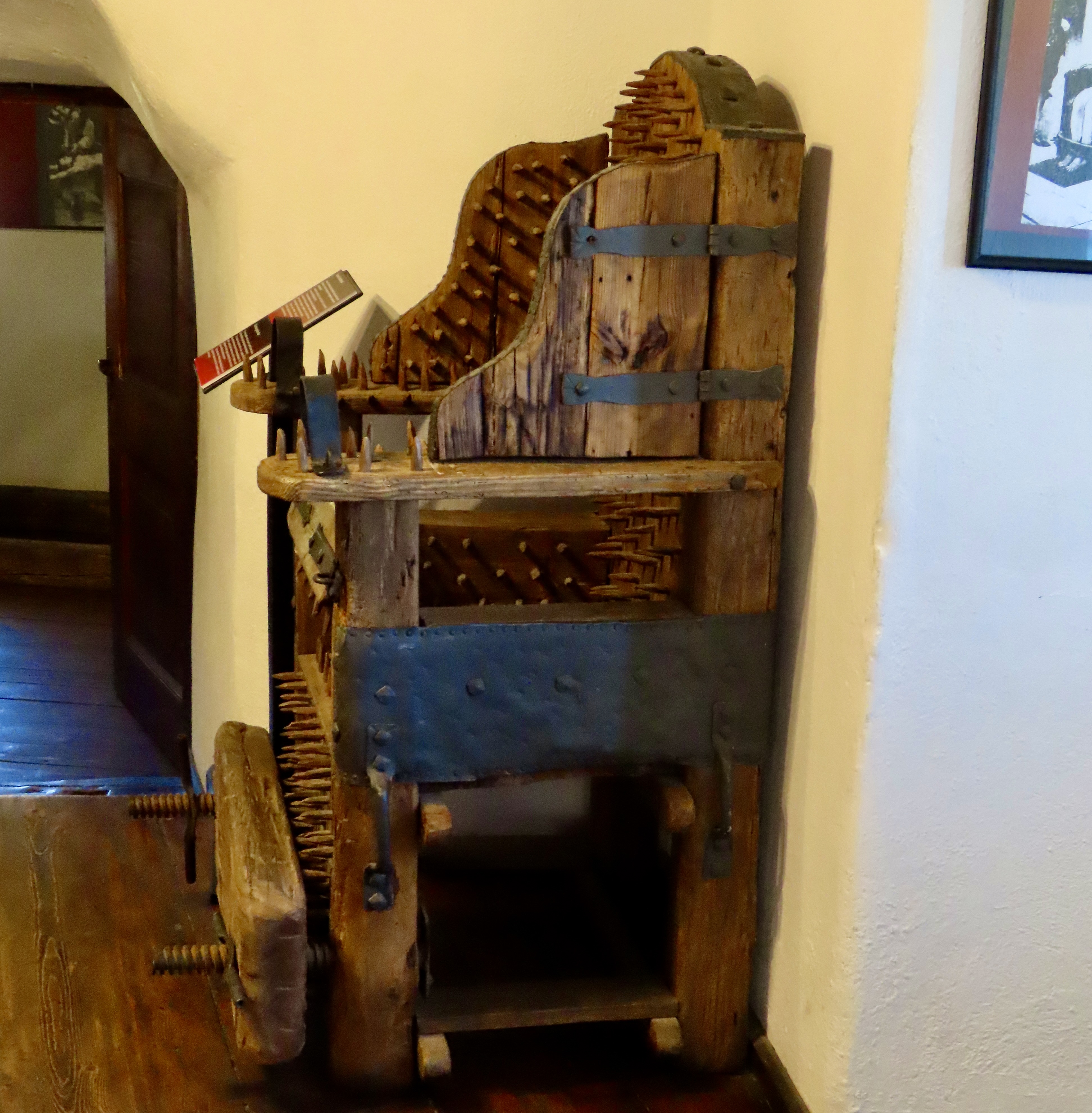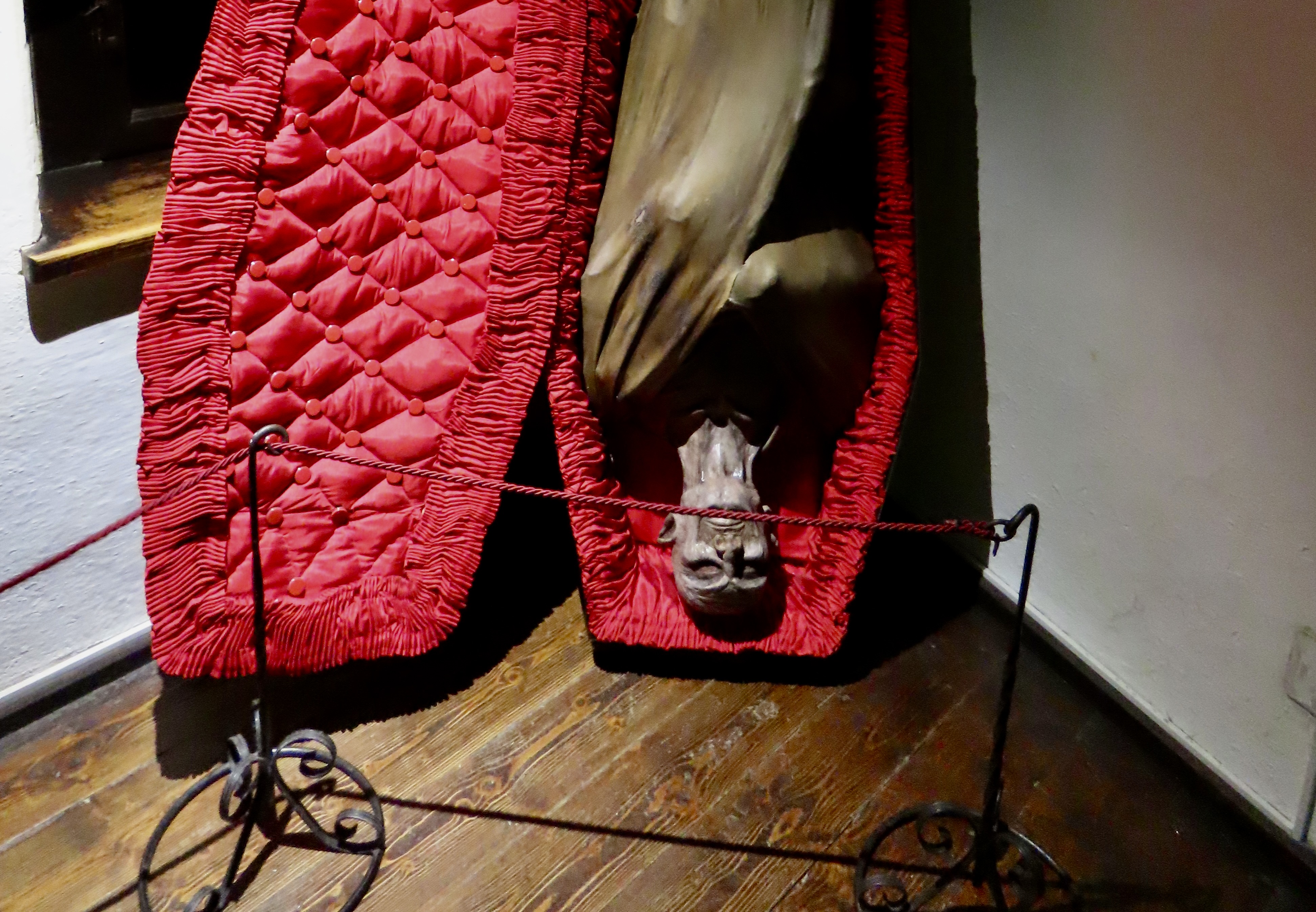Stoker never visited Dracula’s Castle but he based his book partially on folk tales, legends, and the actual historical Dracula/Vlad the Impaler. Compared to him, Stoker’s Dracula was a wimp, a woozy, a rank amateur. Born in 1431, Vlad would be responsible for some 80,000 deaths throughout his 45 years of life, utilizing various means including torture— the worst of which was impaling. Not to get too graphic, but imagine sitting down on a yard long, pointed, narrow pole. Ouch. He once did in 20,000 Ottoman Turks using that method. The rest of the army turned and ran home. Even Pope Pius II was impressed. The gruesome chair and standing tomb above are other examples of torture implements he might have used. Once a delegation of diplomats visited Vlad and refused to take off their hats in respect. He had their heads cut off and their hats nailed to their heads. So, if you want scary, Vlad is your man.