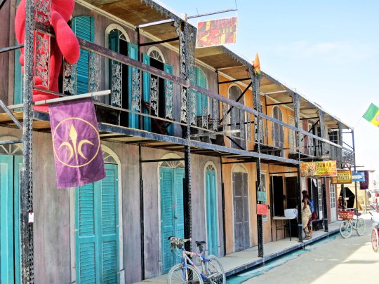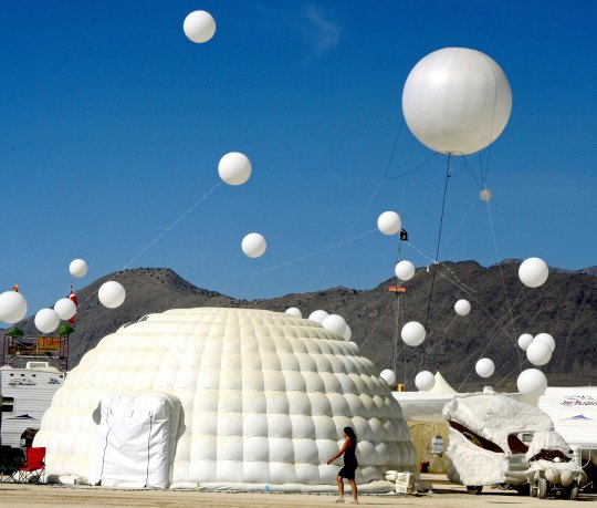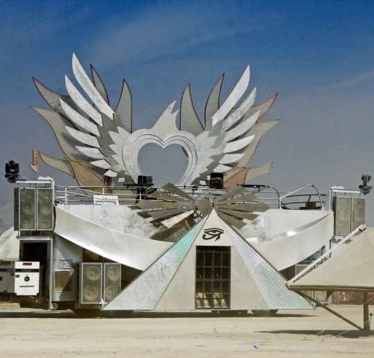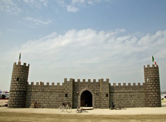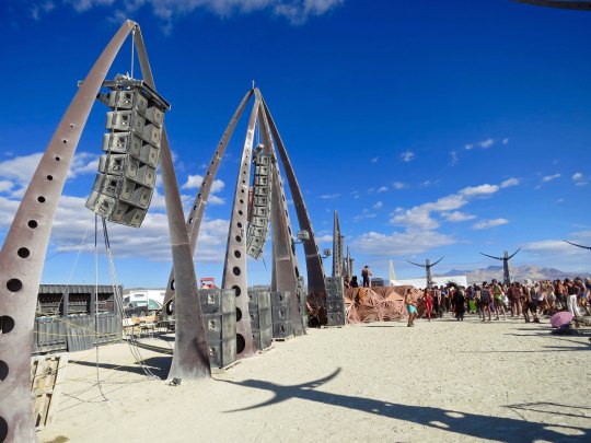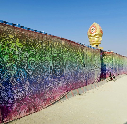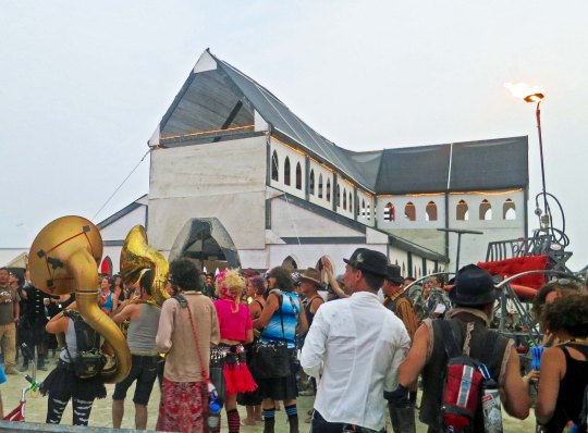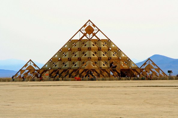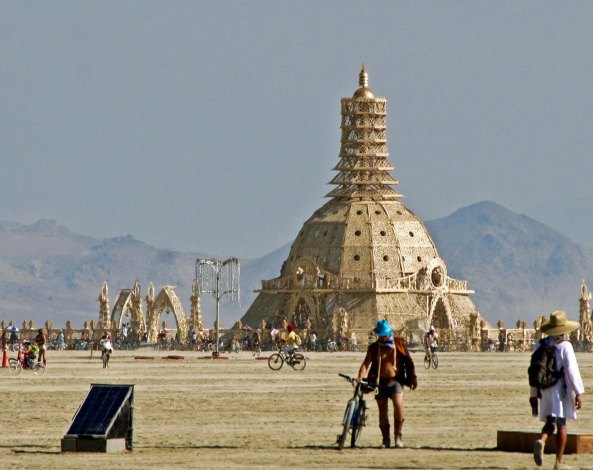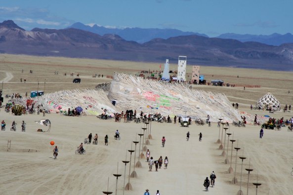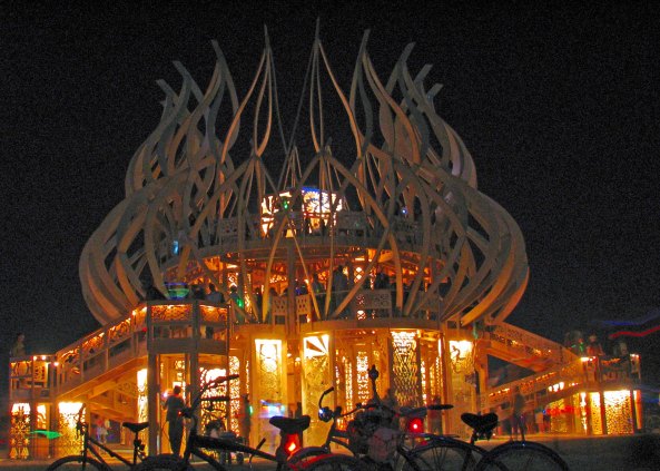 The Temple of Flux represented the constant change we experience in life. It can be seen as waves or as sand dunes. This photo was taken from the Man. The Center Camp Cafe, the Man, and the Temple are always in a direct line. The buildings on the other side represented a city.