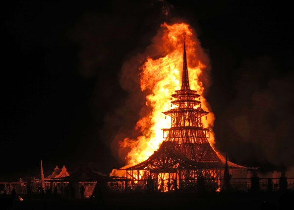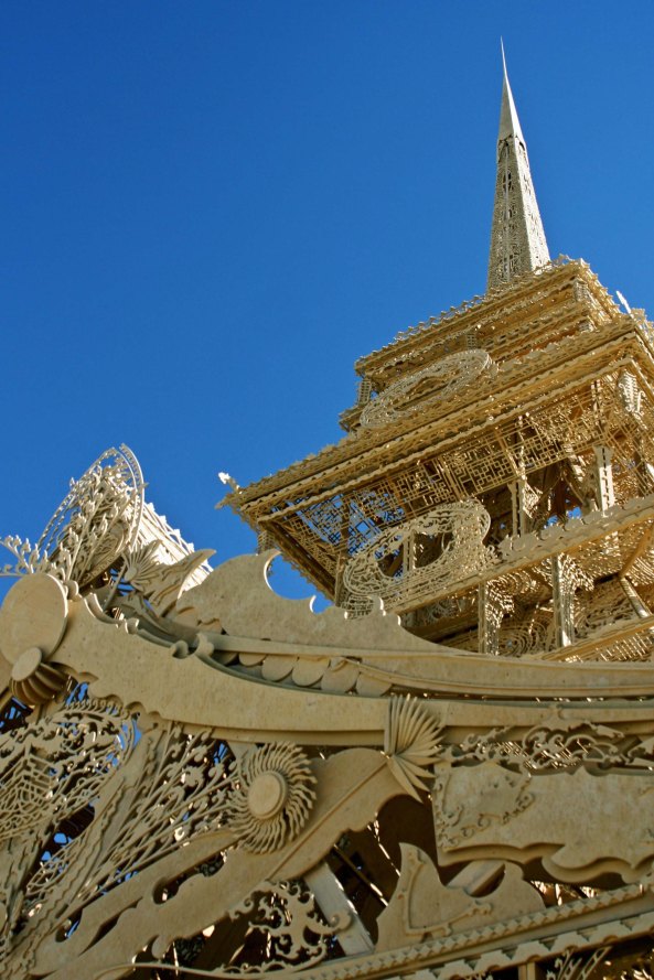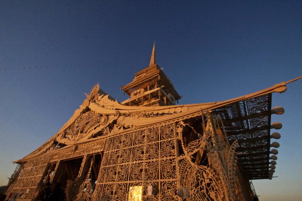 The Temples are always burned on Sunday night, the last night at Burning Man, in a solemn and moving ceremony with the thousands of messages sent skyward. This is the Temple of Juno.