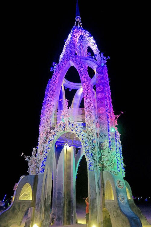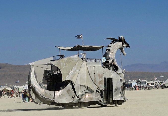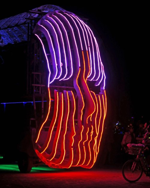 I parked my bike at the Center Camp Café this year and walked out to the Man, following the Dixie Land band, stilt walkers and fire cart. Monitors made sure I kept my distance. I arrived well before the fire dancers started, so I strolled the promenade, walking in a full circle around the Man, and taking photos. Noise ruled. Dozens of mutant vehicles blasted music and fire into the night. Hundreds, if not thousands of people danced. Others scrambled for seats or simply walked the circle like me, checking out the elaborate costumes that Burners wore and the brightly lit mutant vehicles. I stopped to watch people dance and moved a bit myself, before moving on. A young man hit on me, emphasizing how he liked the company of older men. I made a not so graceful exit. By the time I had completed my walk, the fire dancers were strutting their stuff. It was too late to sit, but I found a good location to stand and watch the show. The dancers finished, the fireworks filled the night sky, and the fired burned. I left before the last of the structure came tumbling down.