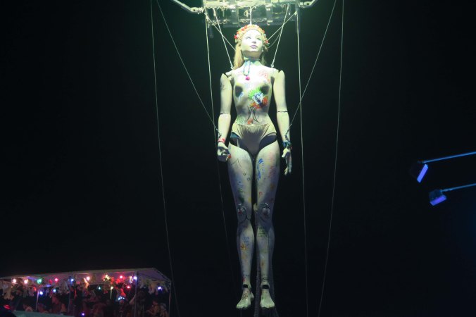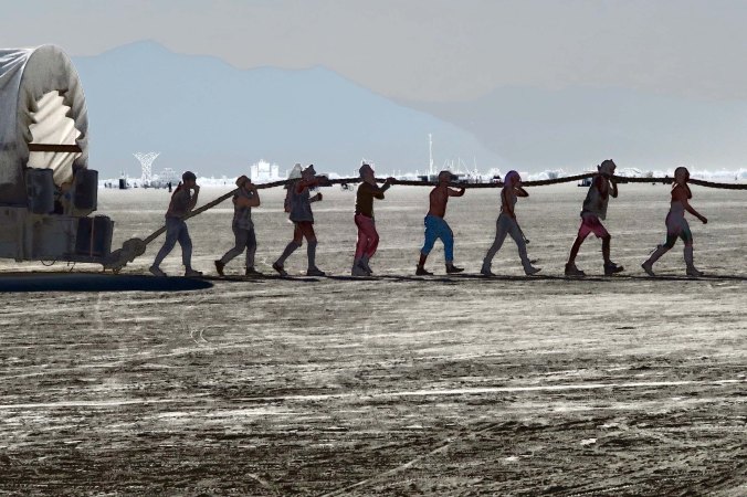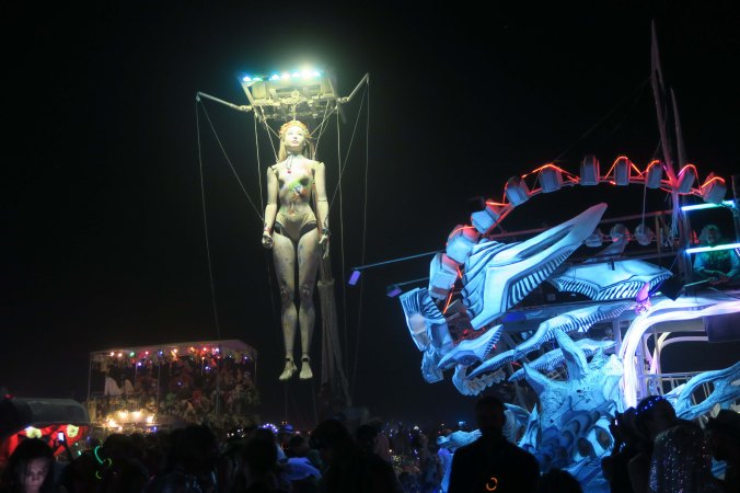 People on stilts are part of the parade that takes the fire out to the Man. It’s a long walk.