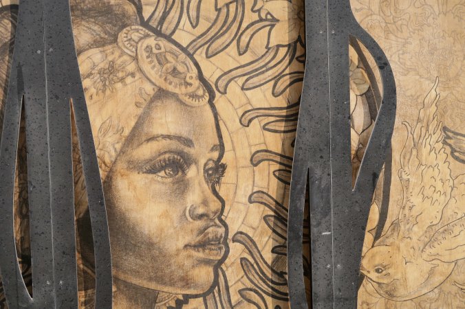 The fire to light the Man is carried in a cart. The Man looks on from inside the Temple of the Golden Spike.