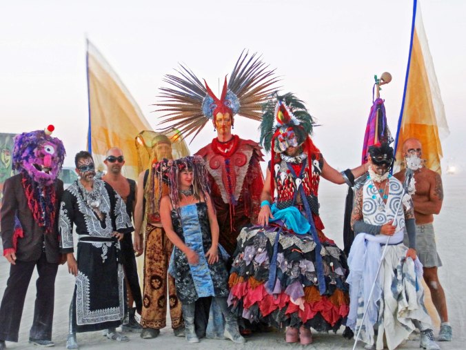 Bone and Big Nose Bonetta are married at Burning Man 2013. Bone’s kilt was made for him by an 80-plus year old woman from Kansas. Bonetta is wearing a designer wedding dress with very expensive plastic jewelry to match.