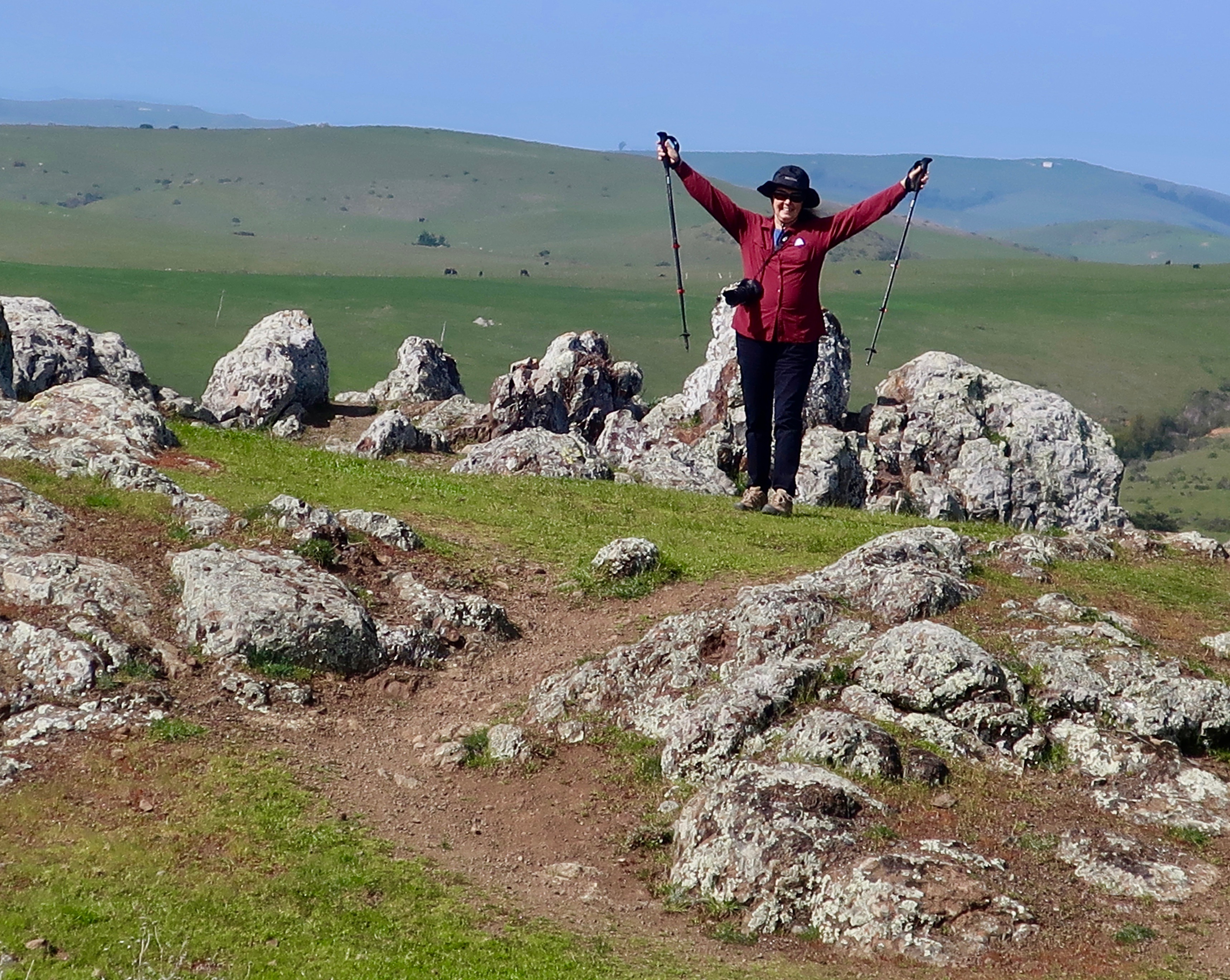 I didn’t know the name of this striking early bloomer, but fortunately Peggy and I had just loaded iNaturalist on our iPhone. I took a photo from my screen and voila! it’s Footsteps of Spring (Sanicula arctopoides). I absolutely love the new app.Another flower I had to lookup on our new app, Suncup Primrose (Taraxia ovata).This beauty was another one that our new iNaturalist app identified. Unfortunately, it’s an invasive species, Rosy Sand Crocus (Romula rose).And then we found an old friend, a solitary California poppy growing in the rocks along the trail. (Photo by Peggy Mekemson.)Cow sentry. If we didn’t have the feeling we were constantly being watched, we should have.I wanted to capture a photo of Peggy on a flat hilltop that was surrounded by rocks that struck me as a great place for a full moon Wiccan ceremony. I’m not sure how Peggy’s pose fit in, but then I hadn’t told her to look like a witch. The poppy shown above was growing in these rocks. An old fence was nearby…Tha ancient barbed wire and lichens spoke to a bygone era of ranching in the Pt. Reyes area. We were glad that the cattle were still there. Another shot of the fence.The tail-end of a cow tale. “I’m out of here” Ferdinand grumpily stated after one too many photos. Look at his face! I get the same feeling at family photo sessions. On next Friday’s Pt. Reyes travel blog, Peggy and I are off to visit an elk herd that roars down to see us. And, we watch a pair coyotes eating sushi.