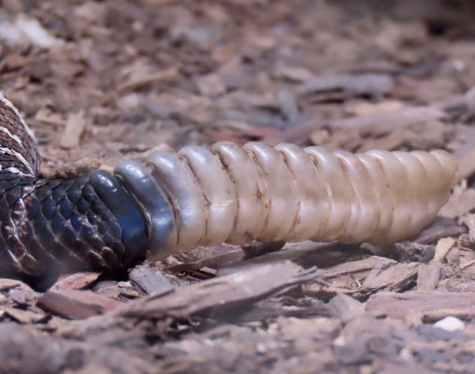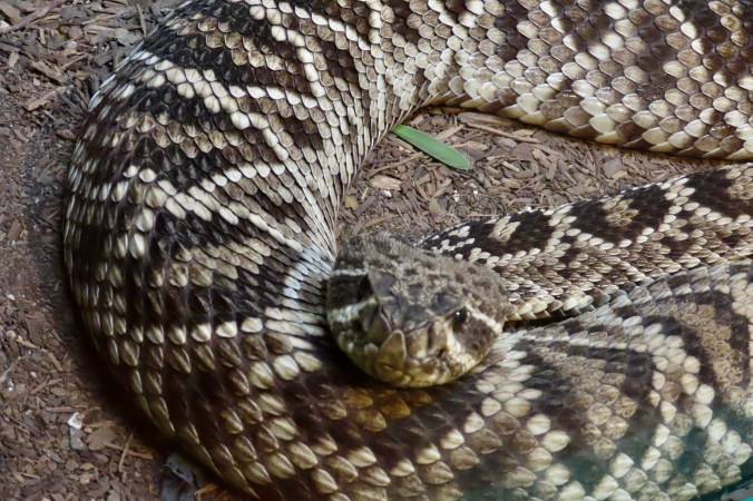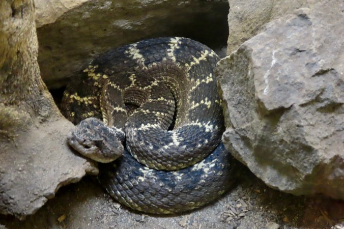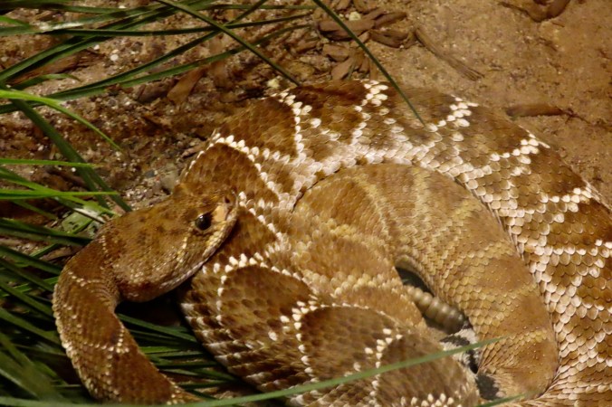 Fortunately, rattlesnakes come with an early warning system. They rattle. The rattles are made up of keratin, that’s the same thing your fingernails are made of. When irritated, the snake vibrates its tail, knocking its rattles together. It makes a very distinctive sound, one you never forget, one guaranteed to shoot your heart rate up faster that a skyrocket on the 4th of July.