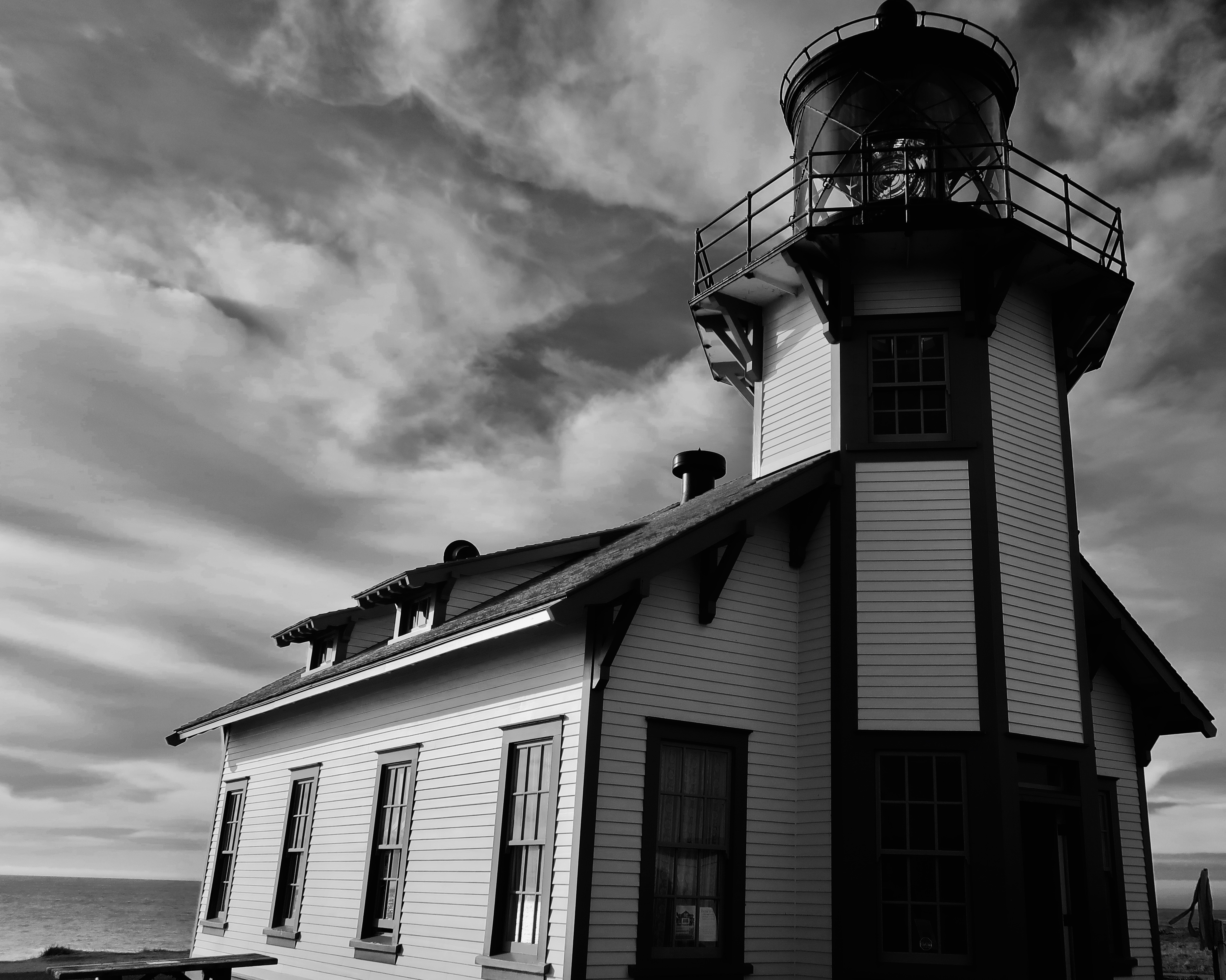 Today, many of the original lighthouses have been turned into museums. That’s the situation with the Point Cabrillo Lighthouse which is now part of the California State Park system. The lighthouse got its official start with a party in 1909. The head lighthouse keeper invited all of the neighbors within a mile over for its official opening at midnight. It was a pea soup night with the fog so thick that the light couldn’t escape. That wasn’t a problem for the loud new fog horns that started blasting out their warning on the dot at 12, probably waking up everyone who lived further away and wasn’t invited to the party. The lighthouse operated happily until 1961 when one of the towering waves I mentioned above rolled over the top. The third order Fresnel lens wasn’t damaged, however, and the lighthouse was returned to working order until 1973 when the US Coast Guard replaced it with a rotating beacon on a metal stand and the original lens was covered.