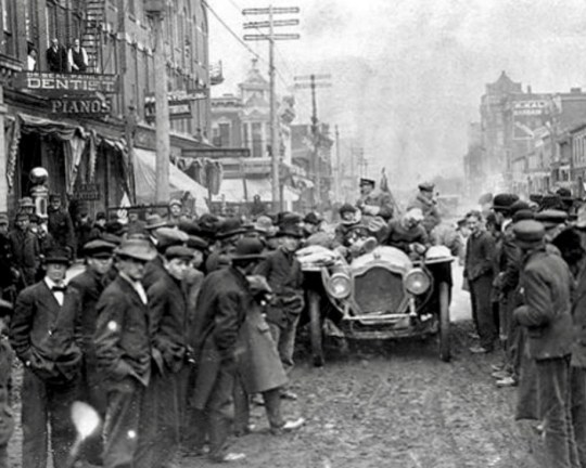 I ended my first post on the 1908 Great Race from New York City to Paris with the six competitors zooming down Broadway on their way out of New York City as a crowd of 250,000 roared them on. Their original route had already been changed by the organizers. Instead of driving half way across the US and then up though Canada to the Bering Strait, they would work their way across the nation and then take a boat up to Valdez where they would continue the Alaska portion of the race over dog sled trails and ice-covered rivers.