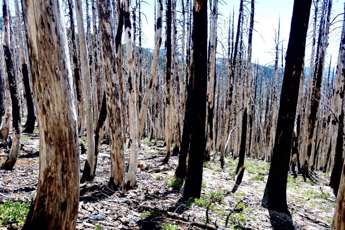 Not too far from Beardog Springs where we met up with Strawdog and camped the night, we began to hike through areas that had been ravaged by forest fires. This was the same series of fires that had forced Peggy and me to evacuate our home last fall. (I’ve rendered it in black and white.) A through-hiker commented to us how ugly it was— I think it was Road Runner who hikes 40 miles a day. Peggy replied she found it interesting and got a strange look. But forest fires are a part of the natural process. A combination of us doing everything to prevent forest fires for the last 70 years and drought/global warming has created the situation where the whole west seems to be burning. (More on this in later blogs.)