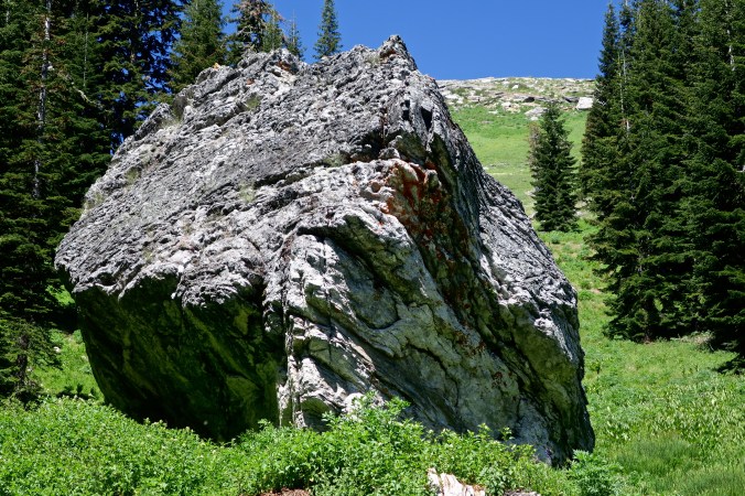 My next landmark is Big Rock , a huge chunk of Marble that resides near the PCT giving both a creek and campsite its name. I wonder if it rolled down from a nearby mountain or was deposited here by a glacier.