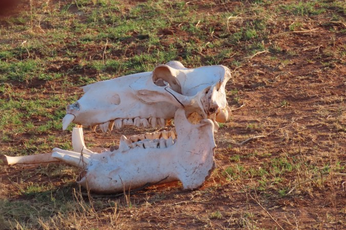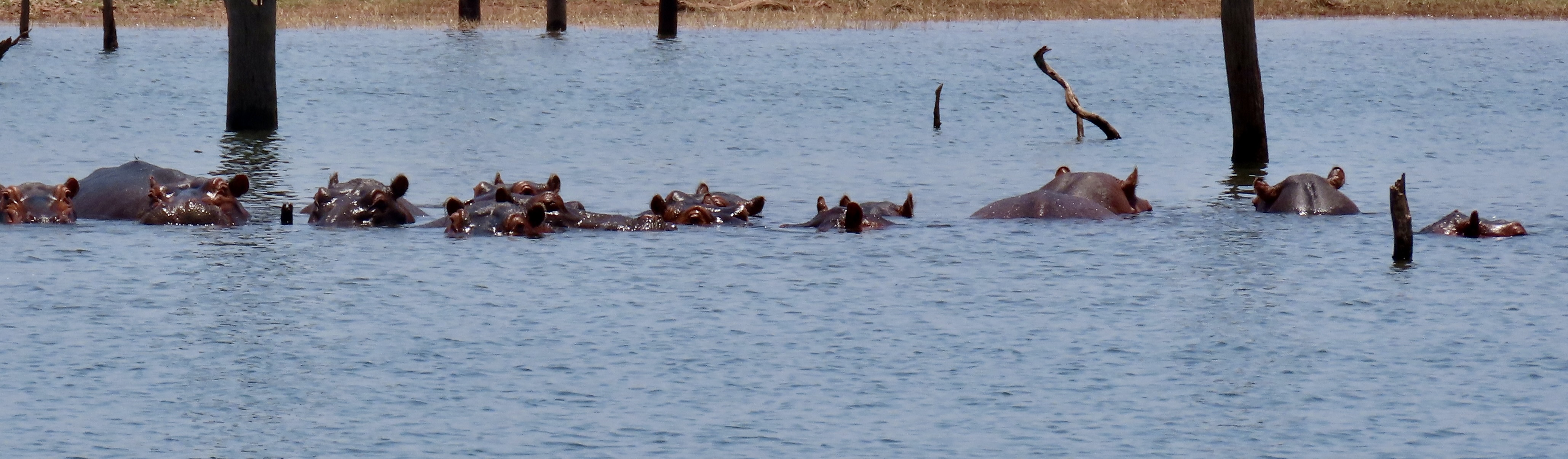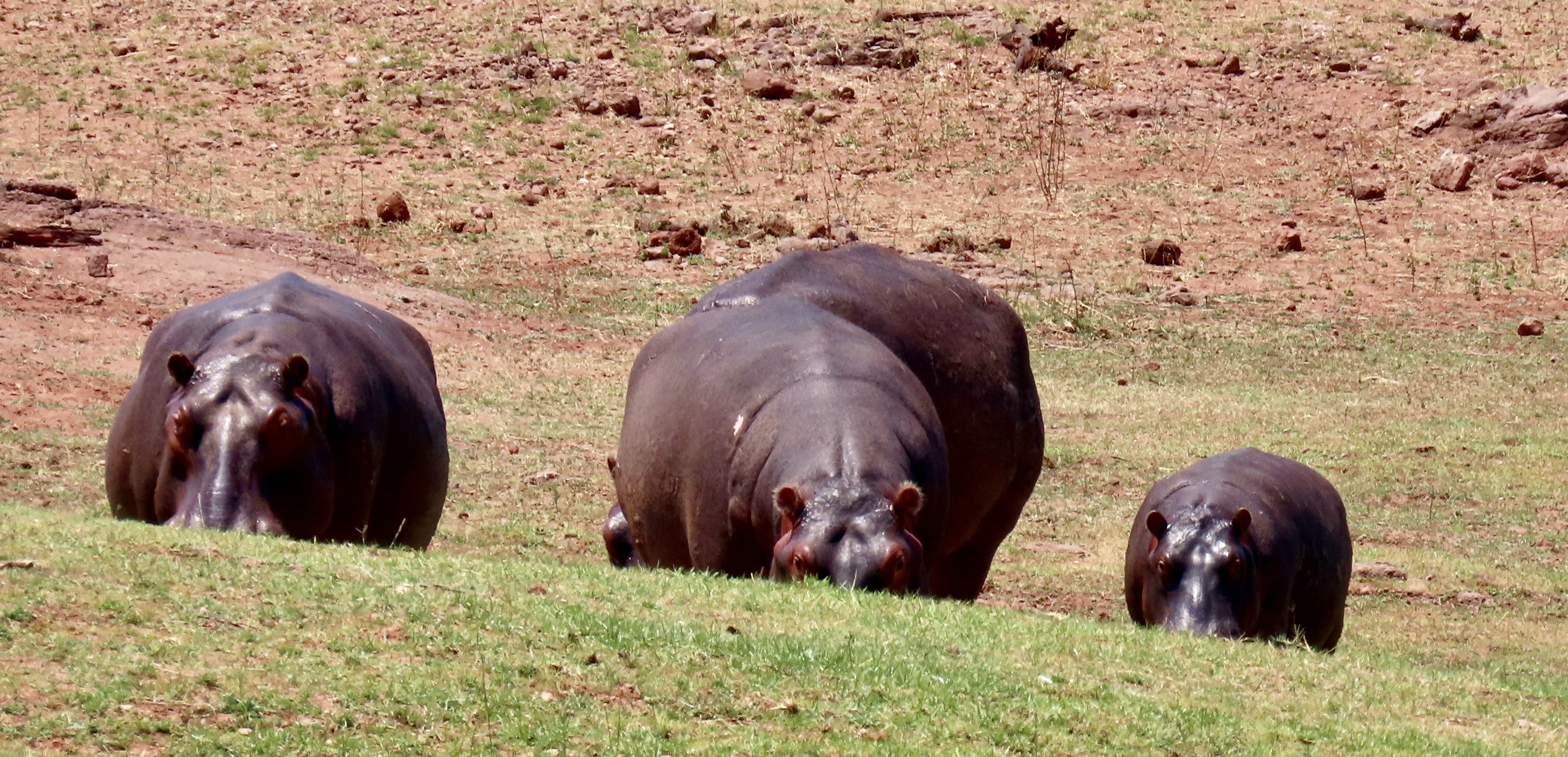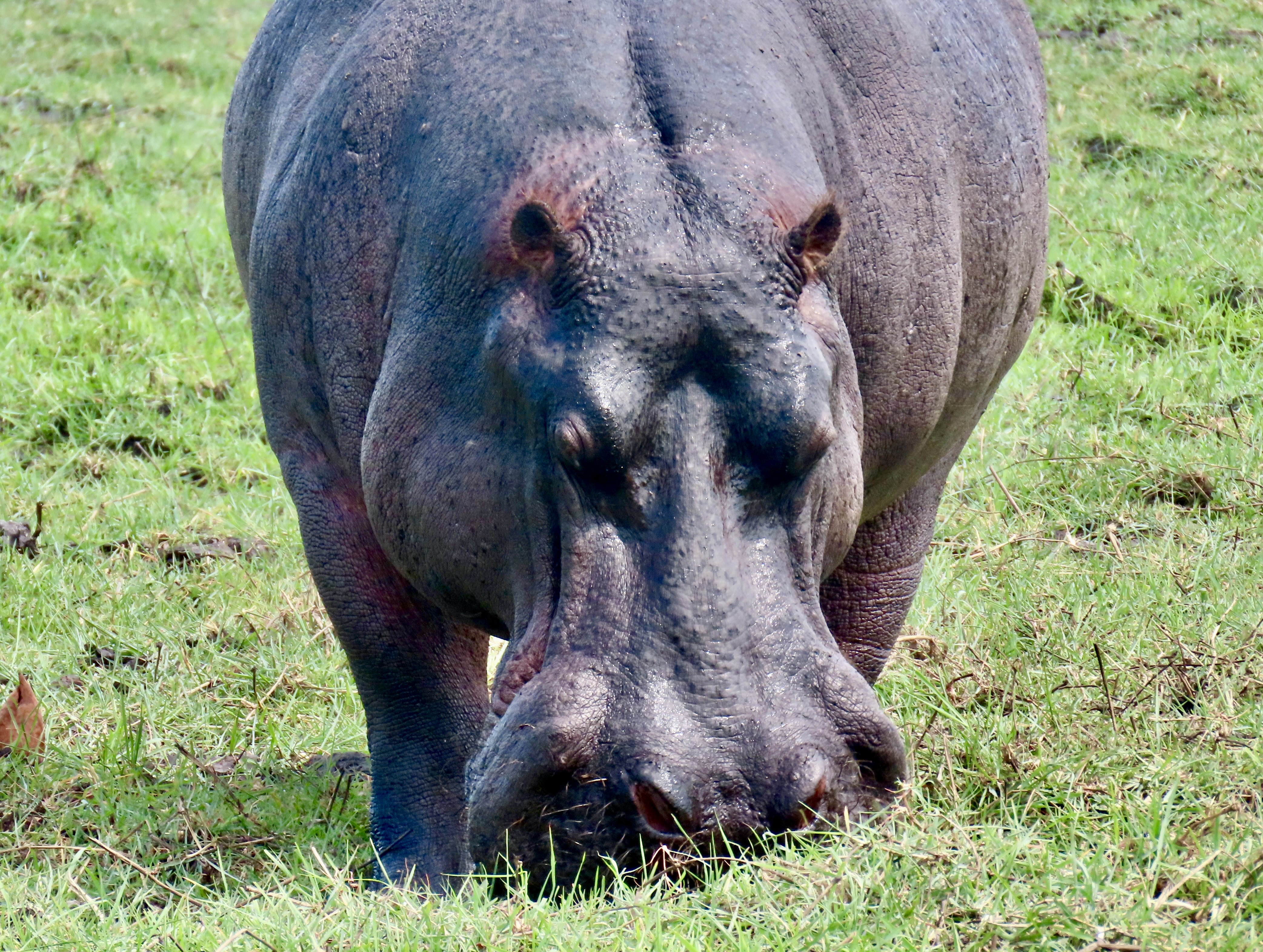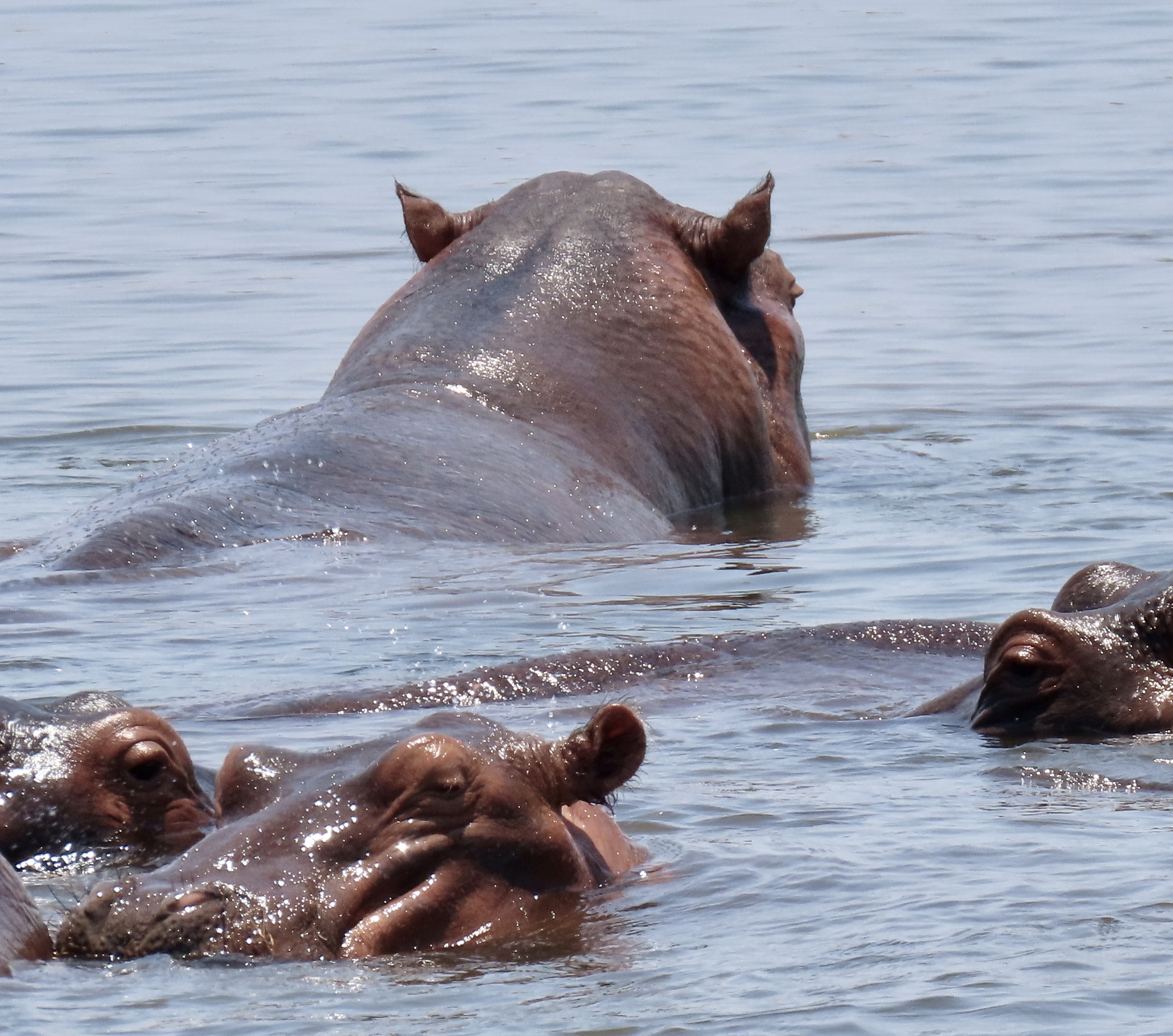 My new camera with its super long lens provided plenty of opportunity to get up close and personal with hippos. You could count the whiskers on this guy’s snout. Hippos spend around 16 hours a day in water. Their nose, eyes and ears are all on top of their heads. This allows them to be able to see, hear and breath while being close to submerged— keeping cool and protecting their skin.This is a common photo of hippos in water including males, females, and babies. They like to hang out together in groups of 10-30 known by such names as schools, pods, sieges or bloats. My favorites are the last two. If you were surround by these guys you would definitely feel like you were under siege. As our boat on Lake Kariba in Zambia approached this group of hippos, they were sinking under the water, a normal tactic.These hippos at Lake Kariba provided a photo op. “Okay, everyone, line up. And stop mooning the camera!”The sun was setting on this big fellow when we took our first boat trip on the Chobe River in Botswana. I’d say ‘bloat’ works here. An average female tips the scales at 3000 pounds while a big male can weigh up to 9000.Groups are normally dominated by a large male who is in charge of protection— and mating, which is mainly carried out in the water due to the weight factor. The gestation period is eight months. Moms give birth to one baby weighing 30-50 pounds. The babies can actually nurse under water.Hippopotamus is derived from ‘water horse’ in ancient Greek. Can you imagine trying to ride one? You would probably drown. They can’t swim. Their size and density makes them sink. But they are ideally suited for travel under water and can stay down for five minutes at a time. They actually walk or run along the bottom. Flaps over their noses and ears close automatically when they go under. A special lid covers their eyes. This fellow, BTW, is probably asleep. Hippos can sleep under the water for up to ten hours, automatically rising every five minutes or and so and sucking in air while continuing to snooze. Great whiskers.This was my favorite shot of hippos in the water. Is it a two headed four eared hippo? Grin. Huge odds are not… But I sure couldn’t imagine how they managed to arrange themselves this way. Going for a ride? Breeding? Maybe.The literature emphasizes that hippos stay in the water during the day and come out to graze at night. Fortunately, everywhere we went that included hippos, a few were out happily stuffing themselves on grass. They average around 80 pounds a night/day, traveling some 6 miles (10K) to get their fill. When out in the day, their skin exudes a protective layer that serves as sunblock. A pair of hippos grazing along with oxpeckers. (The birds peck off insects but they also peck holes in the hippos and drink blood. Hmmm, friend or foe?) I’m assuming this is a pair. Males tend to mate for life but are polygamous.Peggy and I took lots of close-ups of the hippos grazing along the river in Chobe National Park, Botswana. Check out the big tusks. They are used for fighting, not grazing.Any large African animal, be it hippo, elephant, Cape buffalo or giraffe, has a coterie of birds that follow along and catch insects the animals stir up.The little guys seem fearless. Is it grabbing an insect from under the hippo’s foot?We liked this head shot.Males are very territorial. It’s one of the things that make them so dangerous. And they have a unique way of marking their territory. They use their tails to fling poop. That’s what is happening here. The tail is moving so fast, it’s a blur. Remember the old statement, “When shit hits the fan.” You don’t want to be around. Hippos can actually fling their stuff for 10 meters, almost 33 feet. Be you man or beast, you might become toast (or possibly a pancake) if the hippo decides you are invading its territory. And they can run up to 30 miles per hour for a short distance, i.e. probably far enough.Imagine being on top of this small hill at Lake Kariba photographing a few tons of hippos as they come charging over. Fortunately, my telephoto lens allowed me to be a long way off.This hippo skull was beside a small road we were following into Matusadona National Park at Lake Kariba. Note the tusks.The park ranger who was taking us on the tour into the park, got out of our safari vehicle to demonstrate how far a hippo can open its jaw.Peggy captured the phenomena on the Chobe River. From a humorous perspective, it appears junior is getting a lecture on his behavior. “Next time you go near that crocodile, I’ll let him eat you!” And look how long the hippo is! A large male can grow up to 16 feet.This is the ultimate picture of a hippo opening its jaws and declaring a territorial challenge, or yawning. Everyone who goes on safari wants to capture one. Believe me, we tried. Our last opportunity was when we were on the Zambezi River outside of Victoria Falls. Unfortunately, we were on the wrong side of the boat. One of our tour group was glad to share.