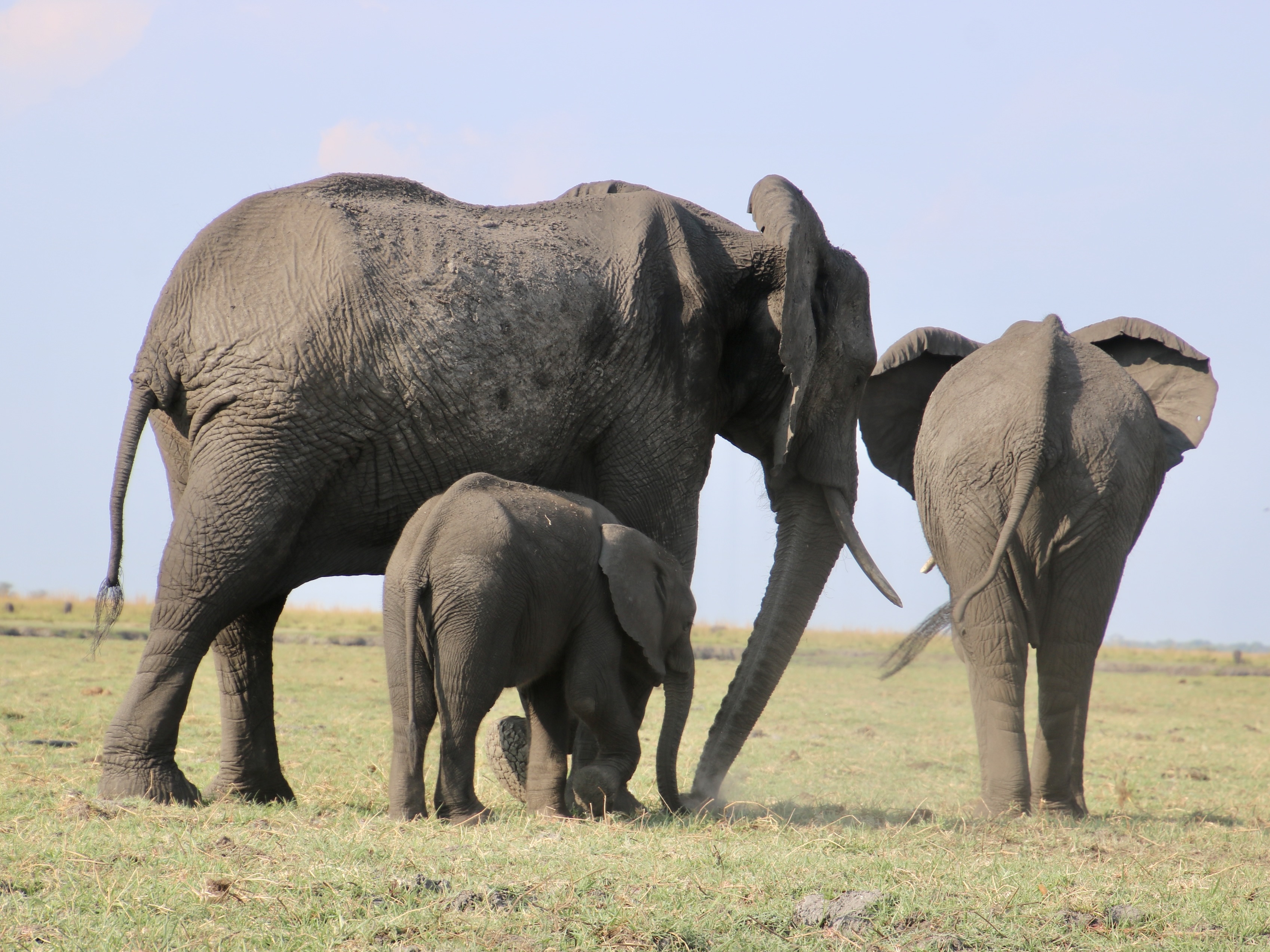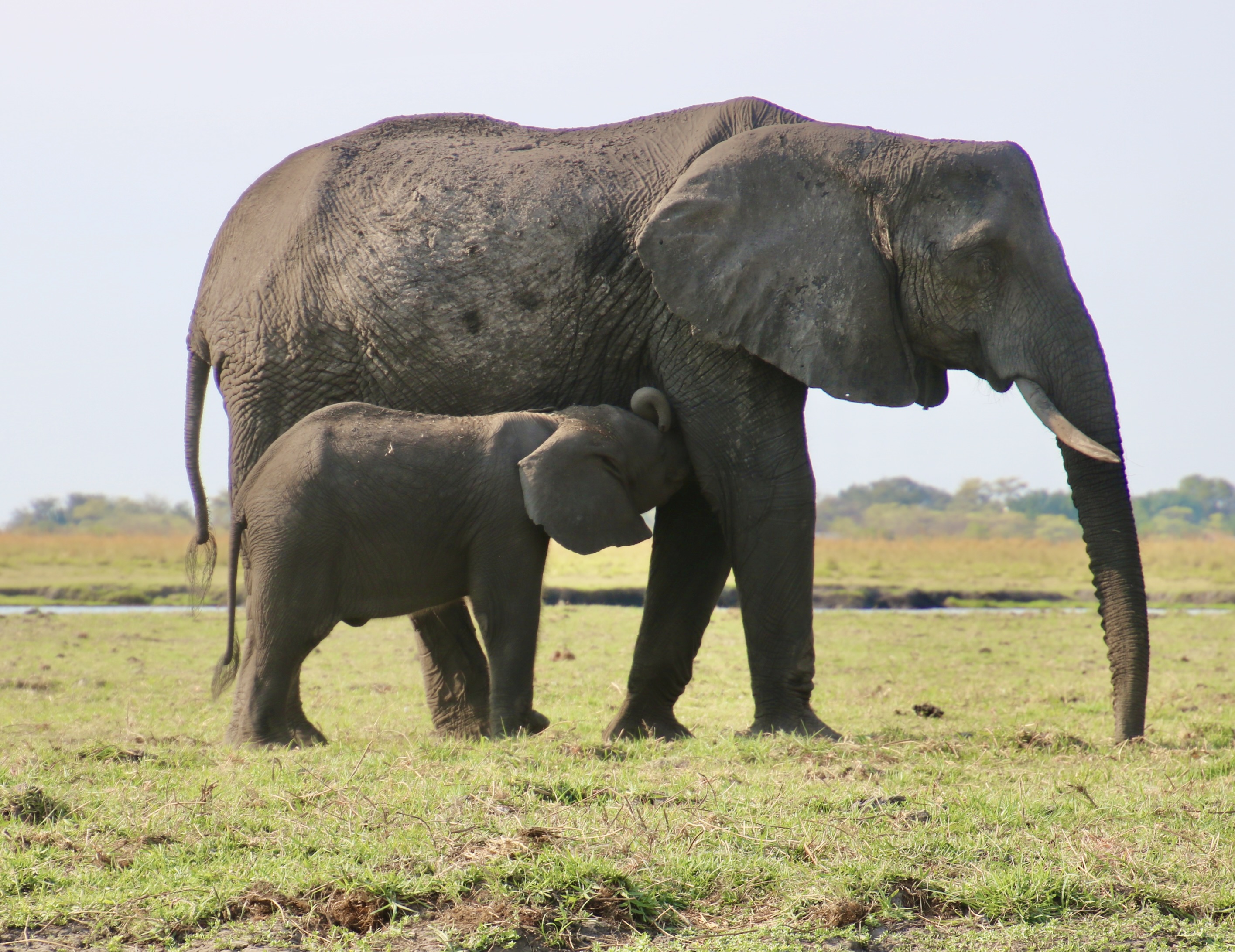 I’d say more than a baby bump. This female in Hwange National Park must be very close to giving birth. I expect it will be a stretch.Another family makes its way along the Chobe River in Botswana. Mom, a teenager and baby in Chobe National Park, Botswana. The baby is about to go for the gold: Mama’s milk.This is a case where the ever useful trunk has to be shoved out of the way.A close up. Momma is feeding herself at the same time. She is stuffing grass in her mouth with her trunk. Babies nurse exclusively for six months, and then off and on for a couple more years as they adjust to regular food. One way they learn what’s good to eat is to shove their trunk into their mother’s and aunt’s mouths to sample what’s on the menu. Some calves will continue to nurse on occasion right up to the time the mom delivers another baby! (When I was a young kid, we had a tomcat that continued to nurse long after he was bigger than his mom. I thought it was perverse and would throw cold water on him. Poor fellow.)An elephants mammary glands are located between their front legs, or ‘arms,’ like they are on humans and other primates.A final family portrait.There is one other grouping of elephants known as a clan, where many families and bond groups join together during dry season in areas where water and food are more readily available. The clan can number up to a hundred or more elephants and even includes bulls. This is along the Chobe River in Botswana. We were lucky to be there at the end of the dry season when everyone was still hanging out. After the rainy season starts, the families disperse throughout the National Park.