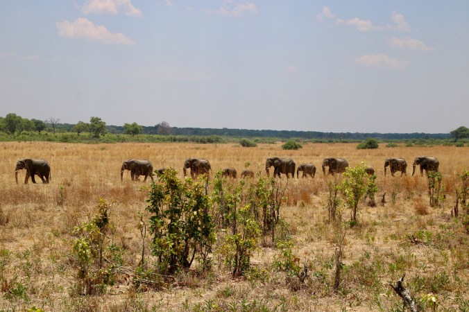 A family of elephants, consisting of the matriarch, her sisters, kids and grandkids, head for a water hole in Hwange National Park, Zimbabwe.