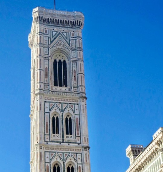 Giotto’s bell tower.A close up of the top of Giotto’s bell tower. (Photo by Peggy Mekemson.)Looking up at Giotto’s bell tower.