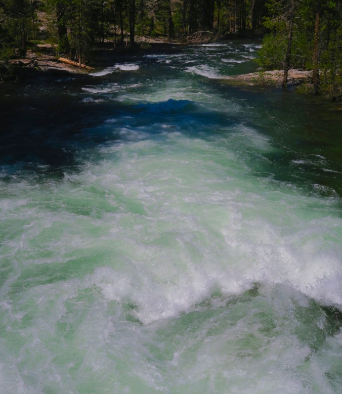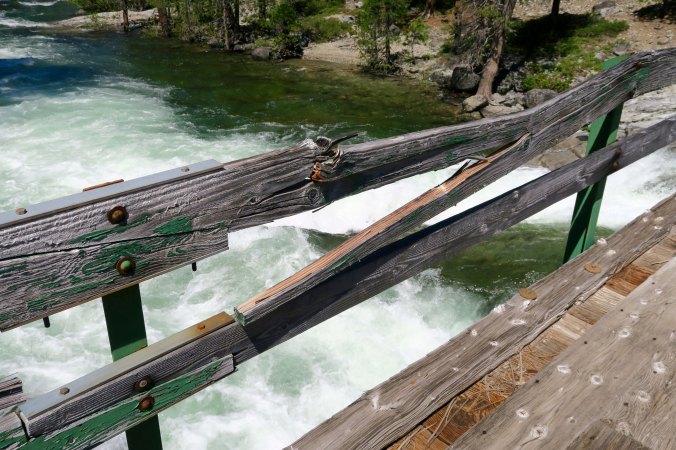 I captured this photo from the bridge. One of the challenges of backpacking early in the season is the amount of water flowing in the streams. Great caution is required when no bridges are available, which is usually the case in the Sierras. It is best to cross early in the morning before the sun begins to melt the snow.