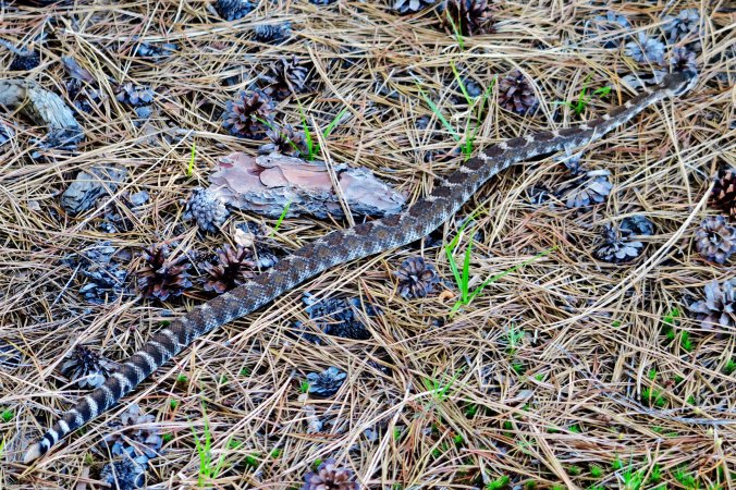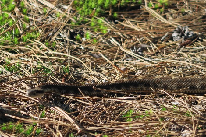 I was in my five o’clock spot under a lodgepole pine when a movement caught my eye. I looked up from my Baldacci book and saw a Diamondback Rattlesnake slithering toward my tree through the pine needles. An ugly pit viper had dropped by for a visit! Keeping a close eye on my guest, I quickly pulled out my camera. The Diamondback kept coming. When it was about 10 feet away I said, “Ahem, Ms. Snake, do you see me? Do you even have a clue I am here?” (It might have been a male, but how in the heck do you tell the sex of a snake? I looked it up, actually, since I knew you would want to know. Male snakes have a couple of tiny penises under the skin inside their cloacal opening (vent under their tail.) You shove a snake probe up there. It goes up farther for a male than a female. Now you are an expert. I don’t think my snake would have cooperated.)
