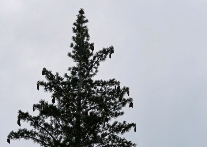 Her rattles were pointed up in the air, ready to start buzzing. The circles on the tail and diamond shapes above them identified the rattlesnake as a Diamondback. The pinecones are from a Lodgepole Pine.