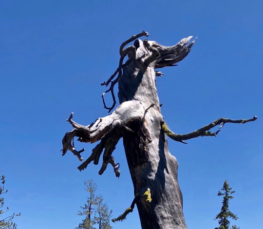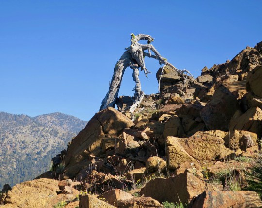 We were fortunate to leave Sonora Pass when we did. Peggy had been watching a worrisome cloud of smoke. It had grown from a small, seemingly insignificant plume to covering a third of the sky. The Donnell fire located a few miles farther to the west on Highway 108 was being pushed by winds and had jumped the highway. Bones and I had experienced the winds up on the trail around Sonora Peak. I estimated that they were gusting close to 50 miles per hour. Bones had put his pack down to take a photo and watched it be blown along the ground. He scurried to retrieve it. So much for the photo-op. I’d had to lean into the wind to keep my footing, not particularly pleasant on a narrow, high-pass trail with steep drops. But it wasn’t boring.
