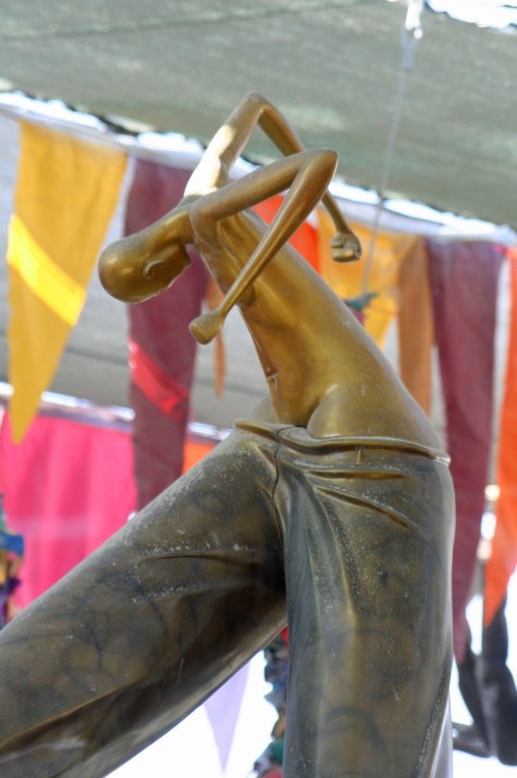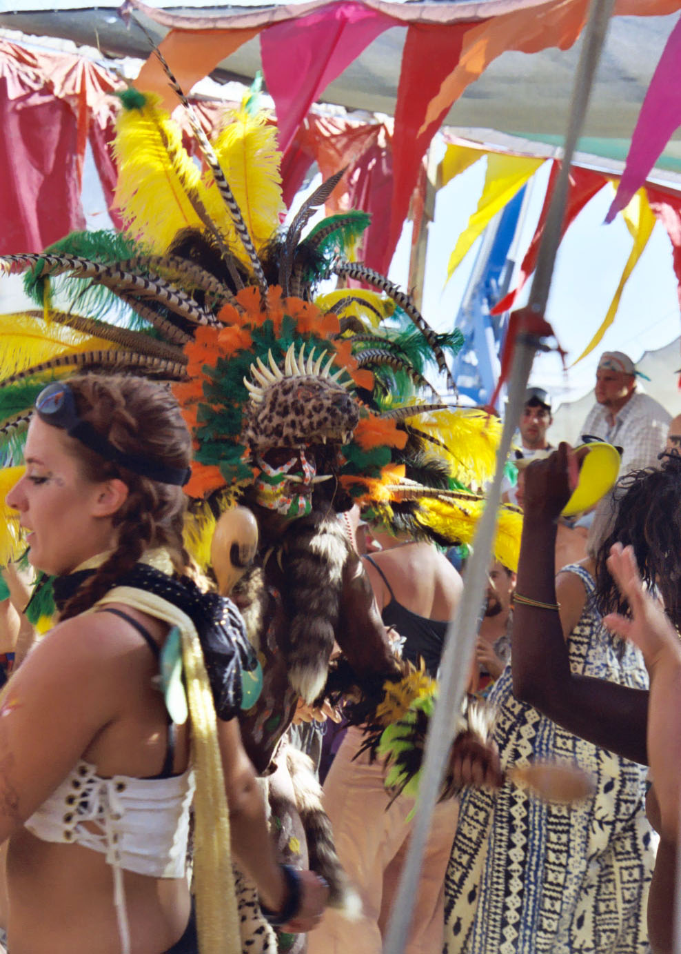 A beautiful, semi-clad black woman moves to the music and a mysterious shaman peers out from behind a painted, bone in nose face. His feather headdress dazzles the eyes, as does the large fan of a clown painted woman. A beautiful girl draped in damask white skillfully plays her flute with closed eyes. A naked man painted silver holds an animated conversation with a tattooed lady.
