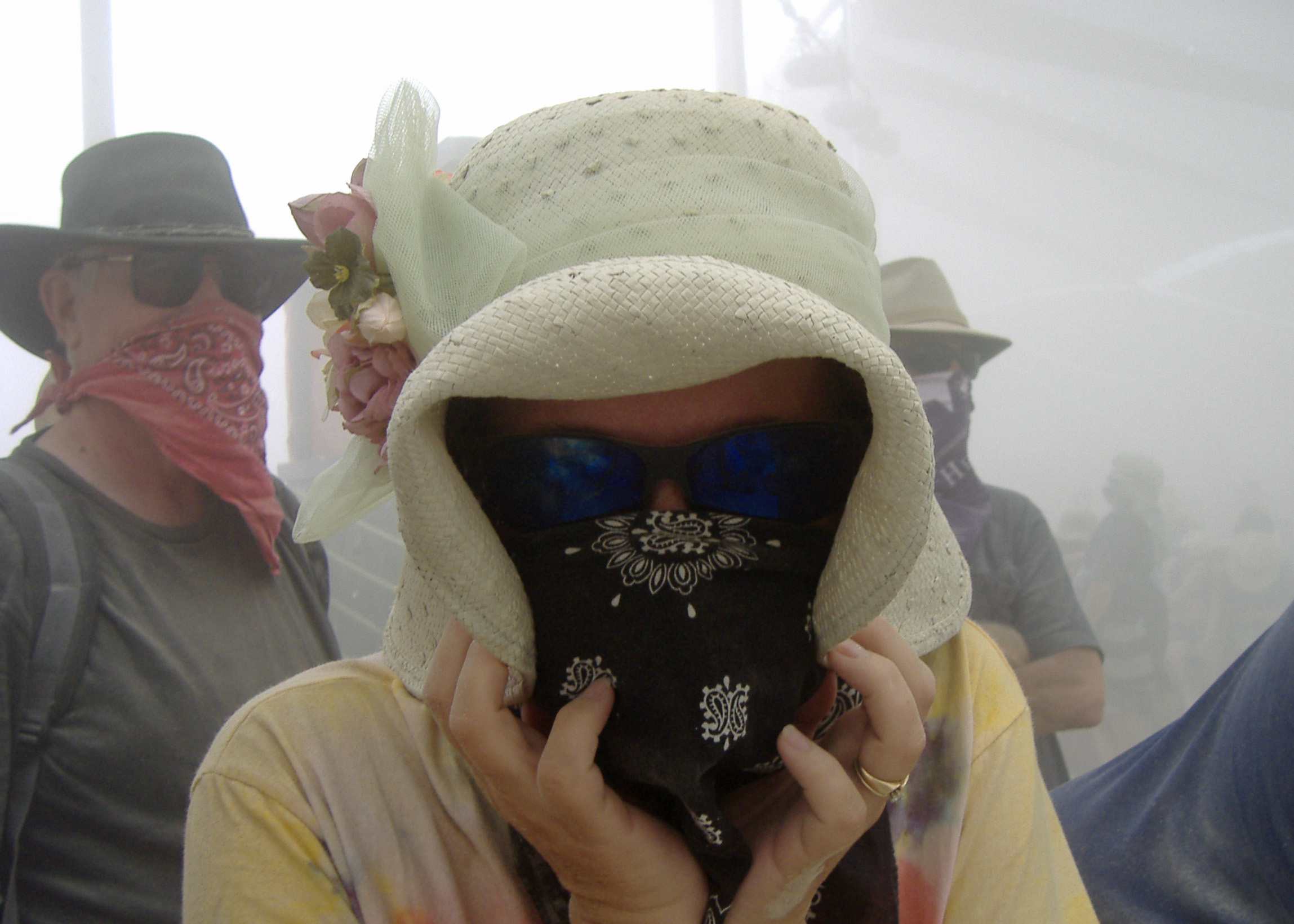 Dust storms can drastically reduce visibility, not to mention get in your eyes, nose, ears, vehicles, etc. Luna, aka Peggy my wife, bundles up against a dust storm as it roars through Center Camp. Photo by Ken Lake