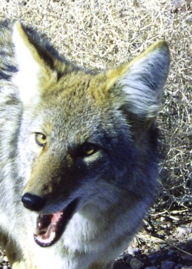 A coyote went “wafting like dust through creosote brush.” I took this photo at Death Valley National Park.