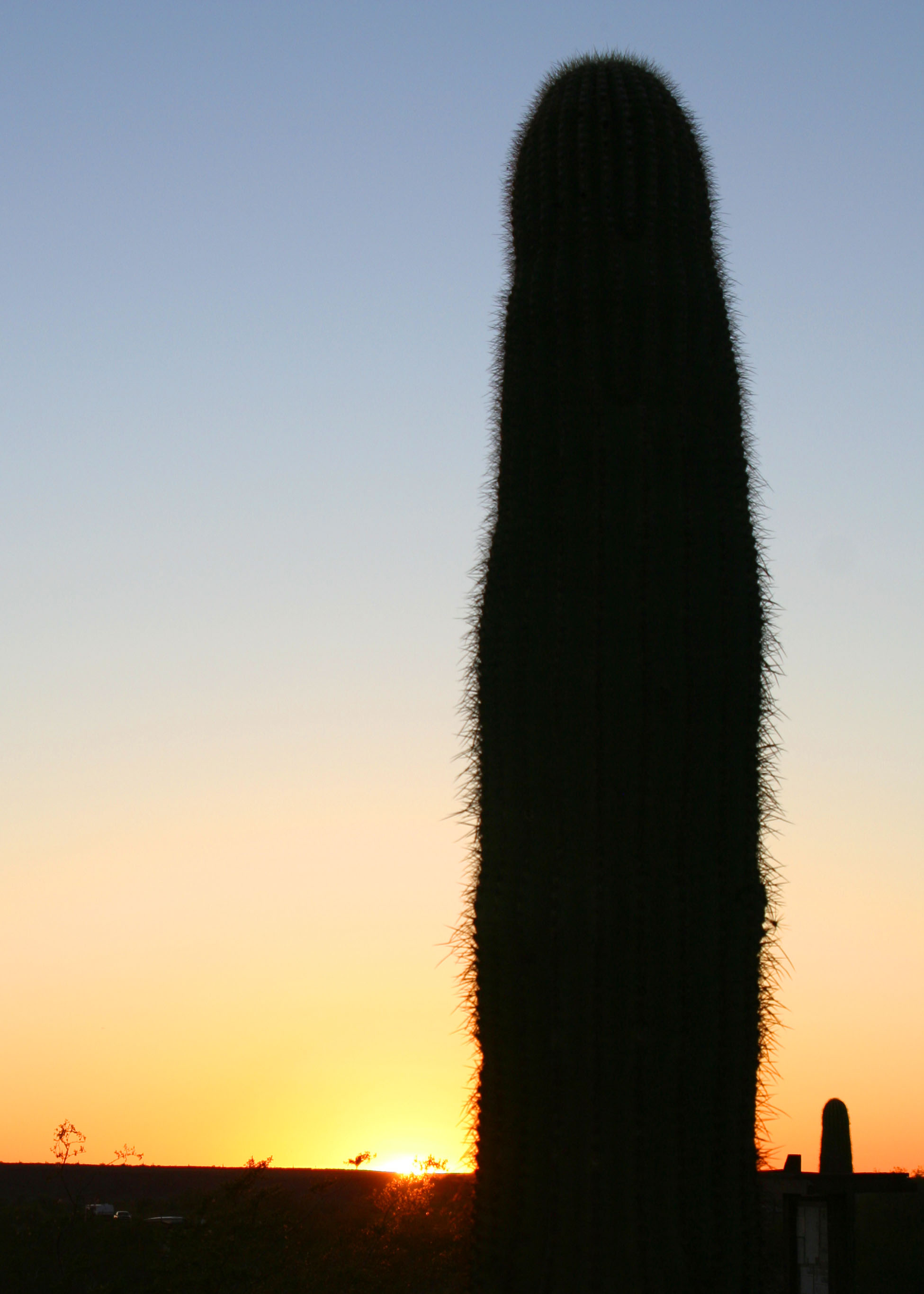 An “armless” saguaro at Organ Pipe National Monument is outlined by the sun’s setting rays.