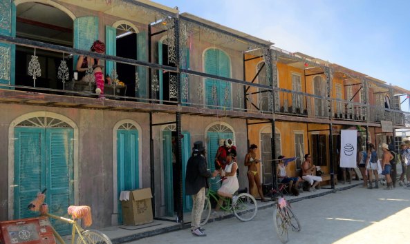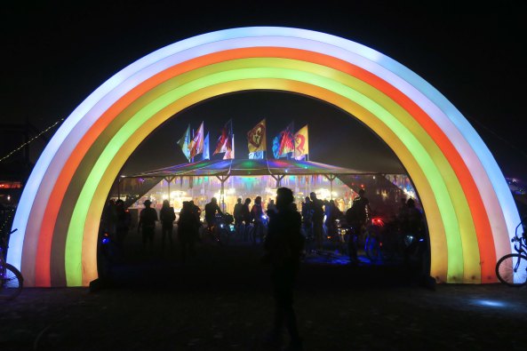 The Center Camp Cafe is always a center of activity at Burning Man. This year it was set off by a rainbow arch.