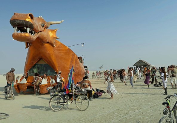As I’ve noted before, my primary reason for going is to see the art. It’s located everywhere. Even with a bike, it’s difficult to see it all— and I always miss pieces. This year, I had to skip the first four days because of forest fires threatening our home. I only had three days to cover what I normally do in seven. I was on the bike a lot. My tail was complaining loudly by Sunday. (For those of you who have been following the saga of the burning forest, we are out of the woods, so to speak. Level 1, 2, and 3 evacuation notices have been dropped.)