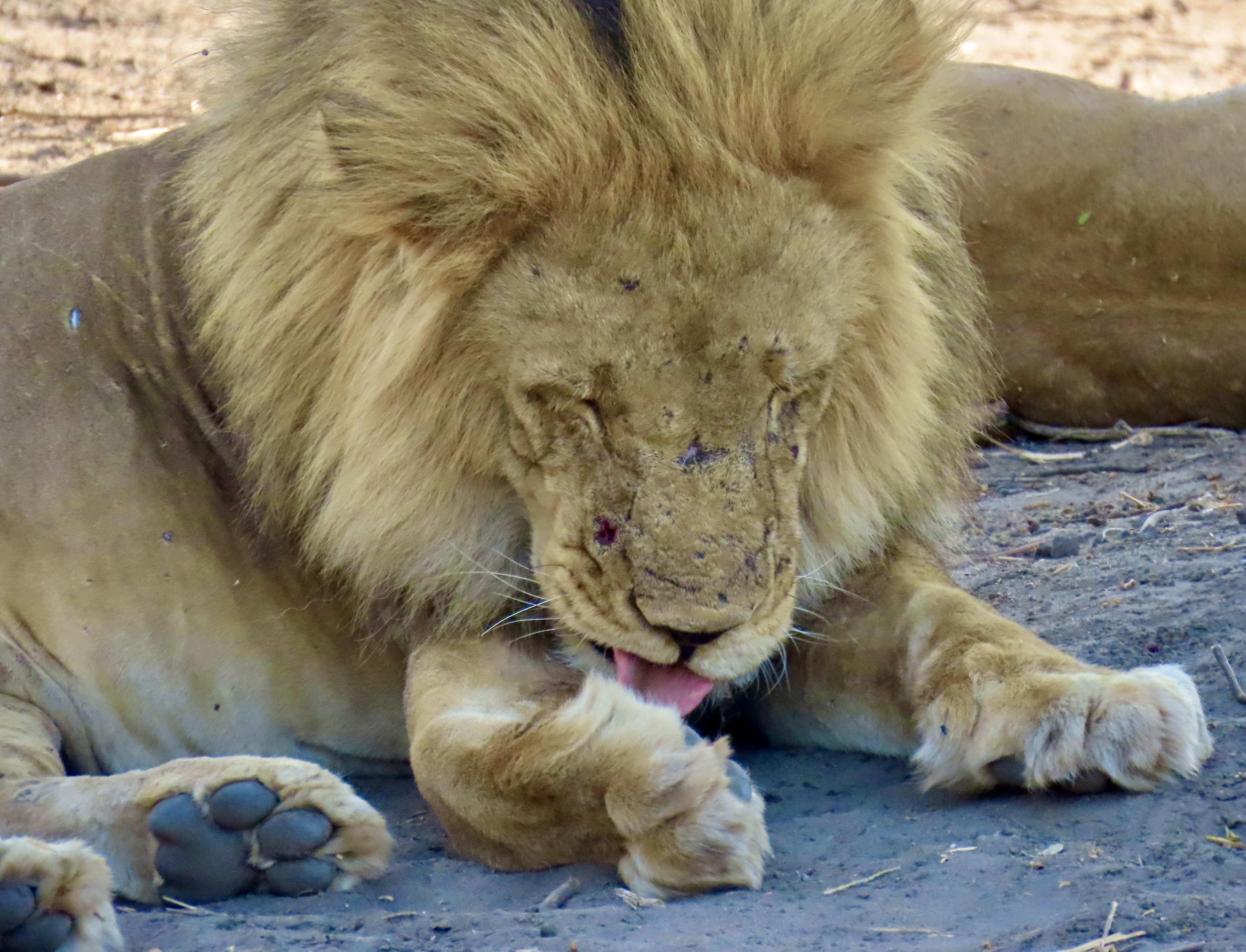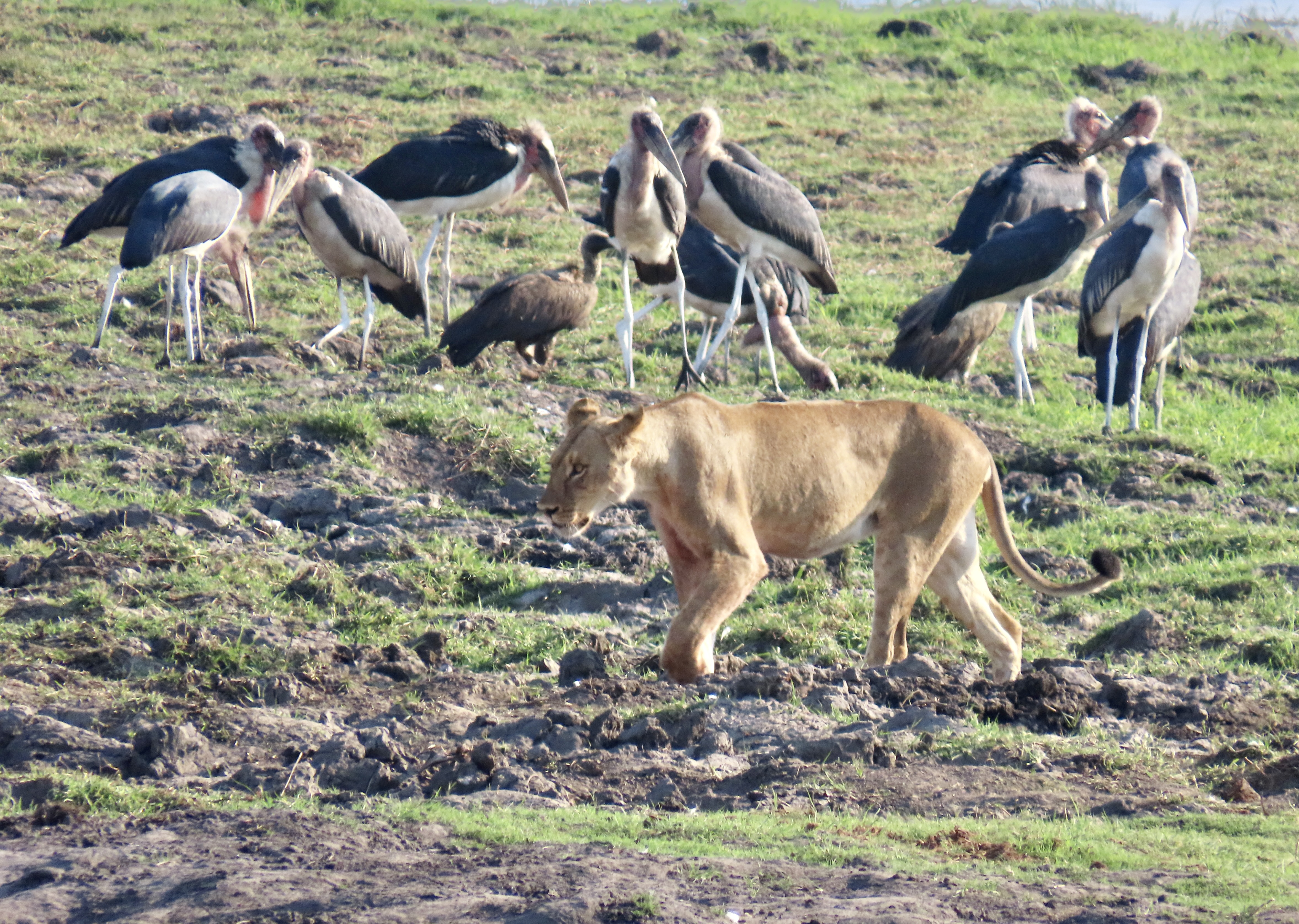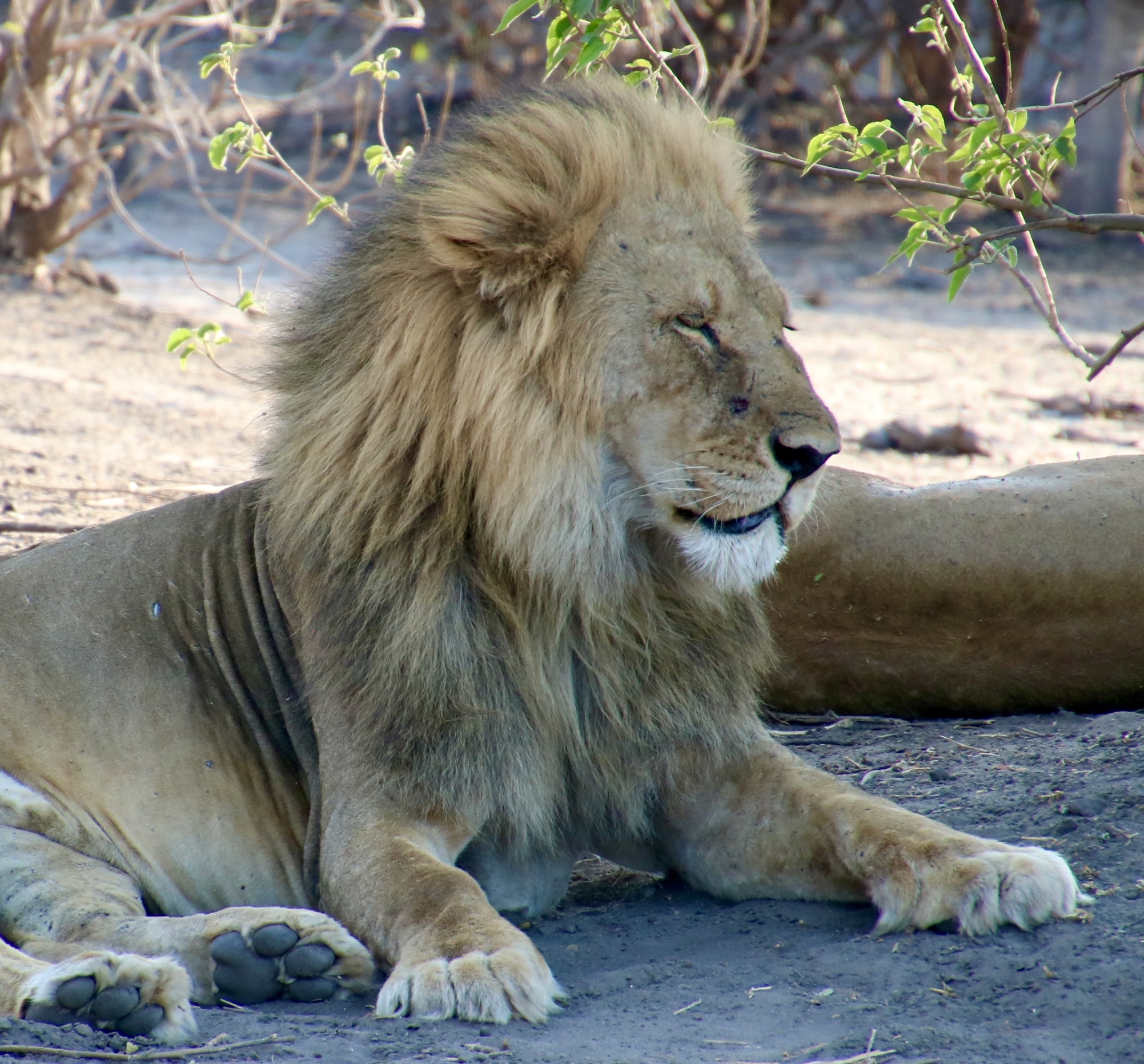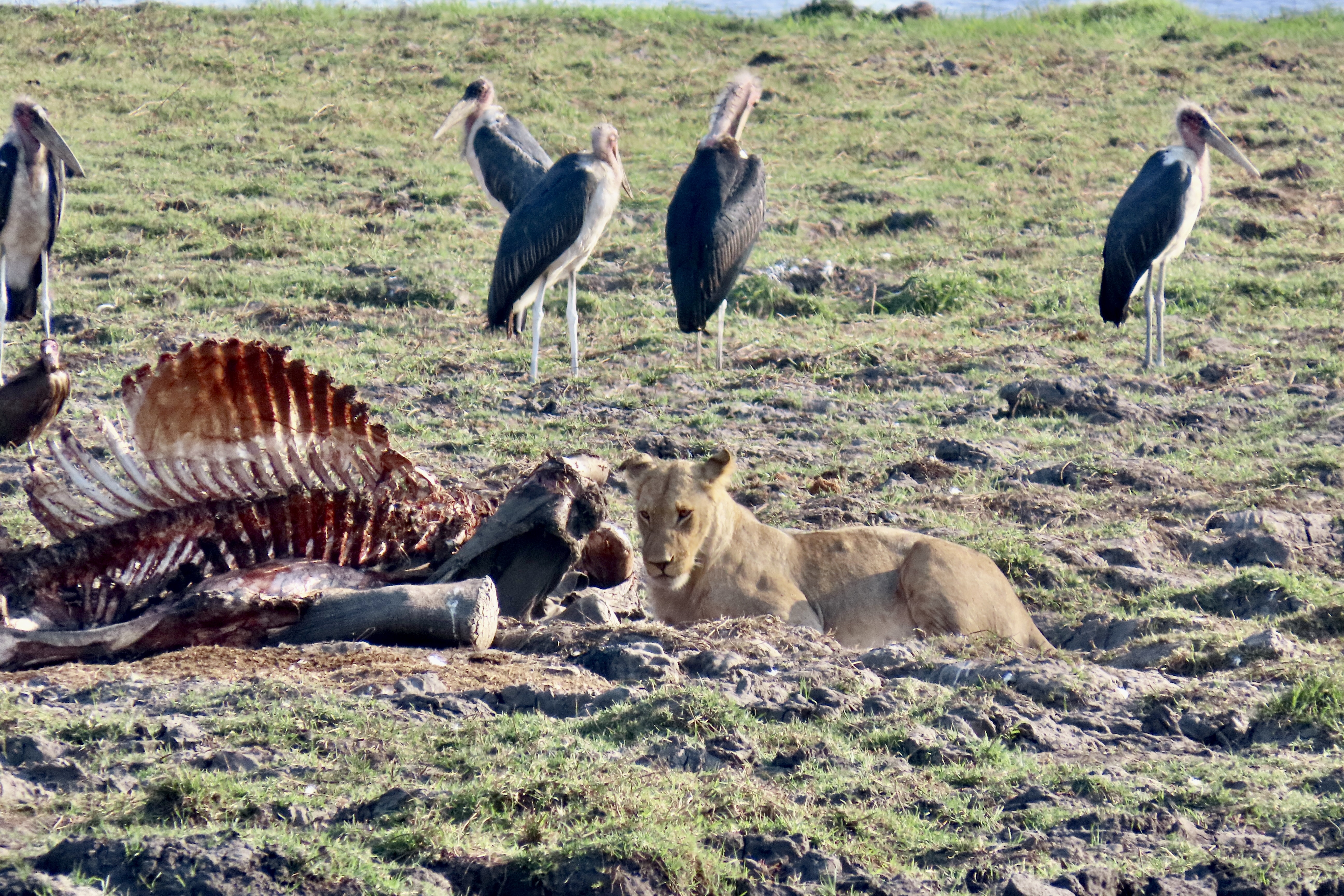 Female lions are excellent hunters. This photo suggests one of the reasons why. In addition to impressive teeth, they can run up to 50 miles per hour and weigh upwards to 350 pounds. We had just watched this lioness hunting. Her yawn suggested that perhaps it was nap time.Shortly after we took this photo, she made a brief dash after something we couldn’t see and she didn’t catch.Settling down (before the yawn), she was still on high alert.Checking in various directions…Which included eyeing us!We came across a lion that was working its way through a young elephant in Chobe. Malibu storks waited patiently for the lion to leave.Another lion invited herself to the meal…Check out the ears on the lion that had been enjoying its meal. If you have a cat, you know that means “I don’t think so.” A lightning fast paw may follow.So she stalked off past another safari vehicle that had also stopped to watch the action. Is that a hungry look she is focusing on the occupants?Which brings us to this magnificent fellow that I have already introduced in another post. He was about to give himself a bath. Note the size of his paws.Like any cat, it started with his tongue!First, he had to get his washcloth wet, i.e. lick his paws.He was quite thorough. And washed each side of his face. I thought this could have been titled: “Oh no, not another blog about me!” A close up…And then he washed the other side…Finally, he was ready for his portrait.