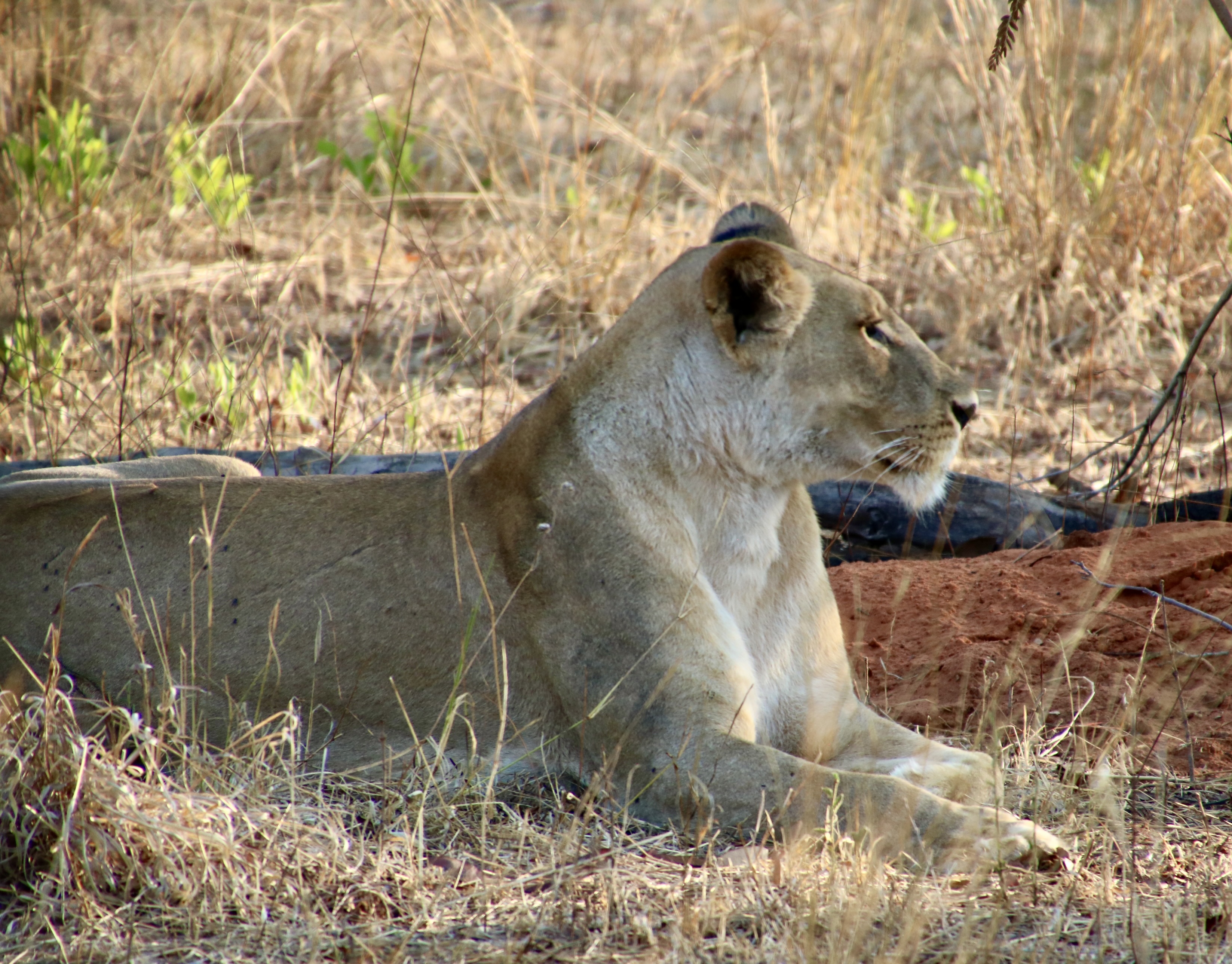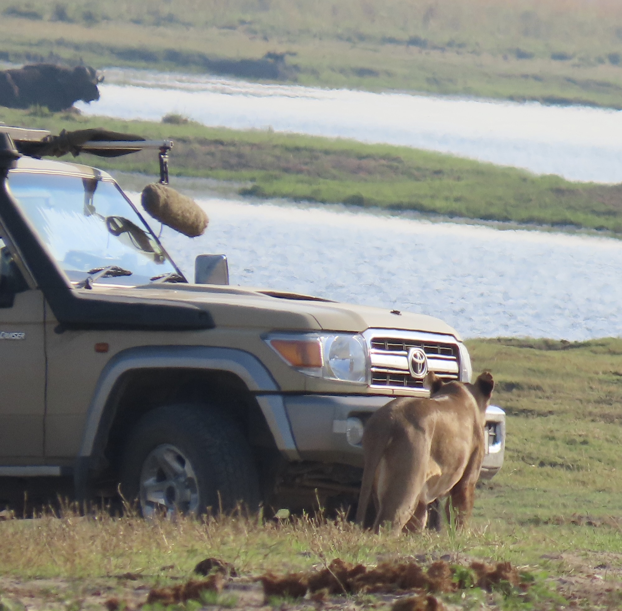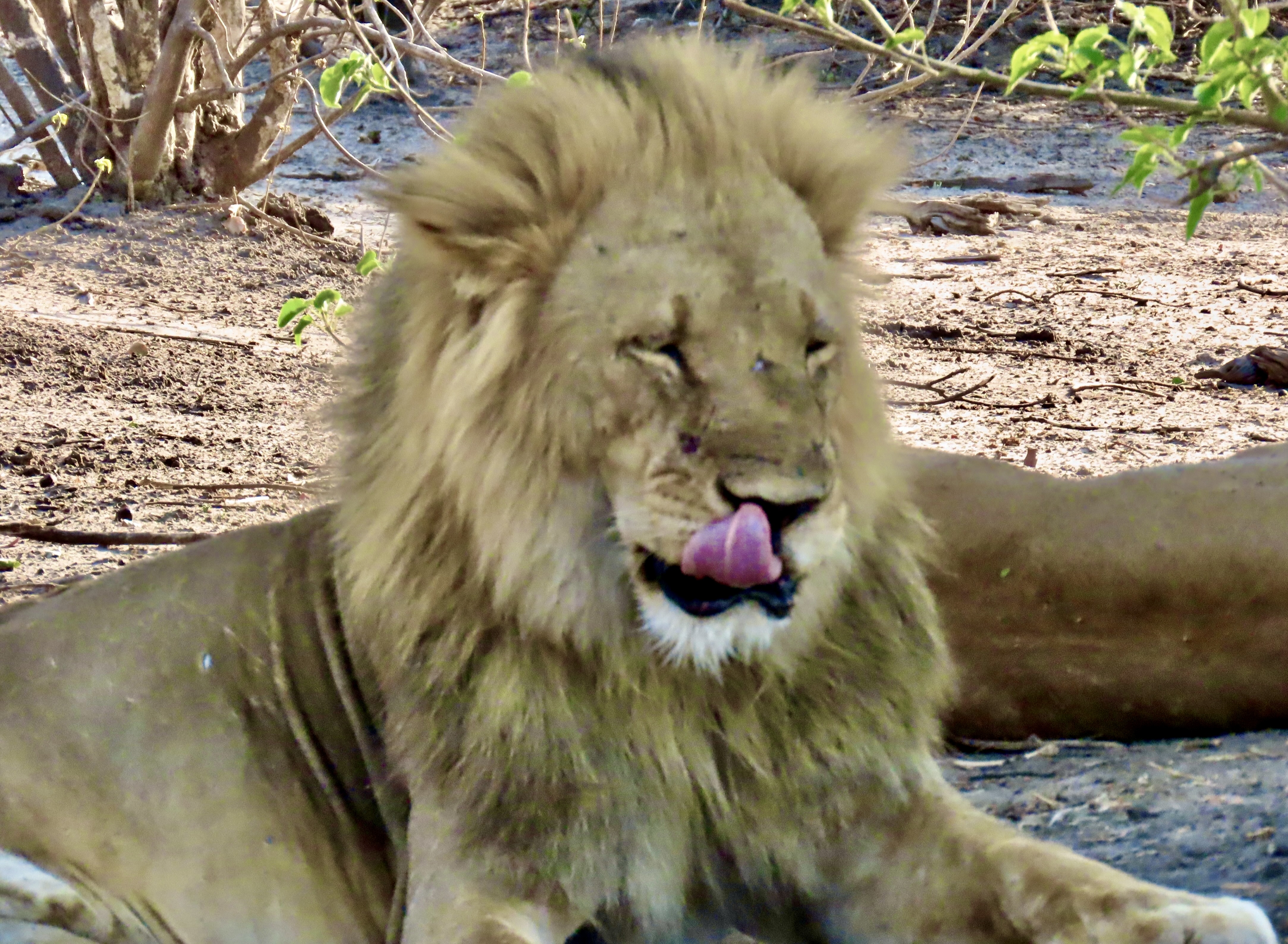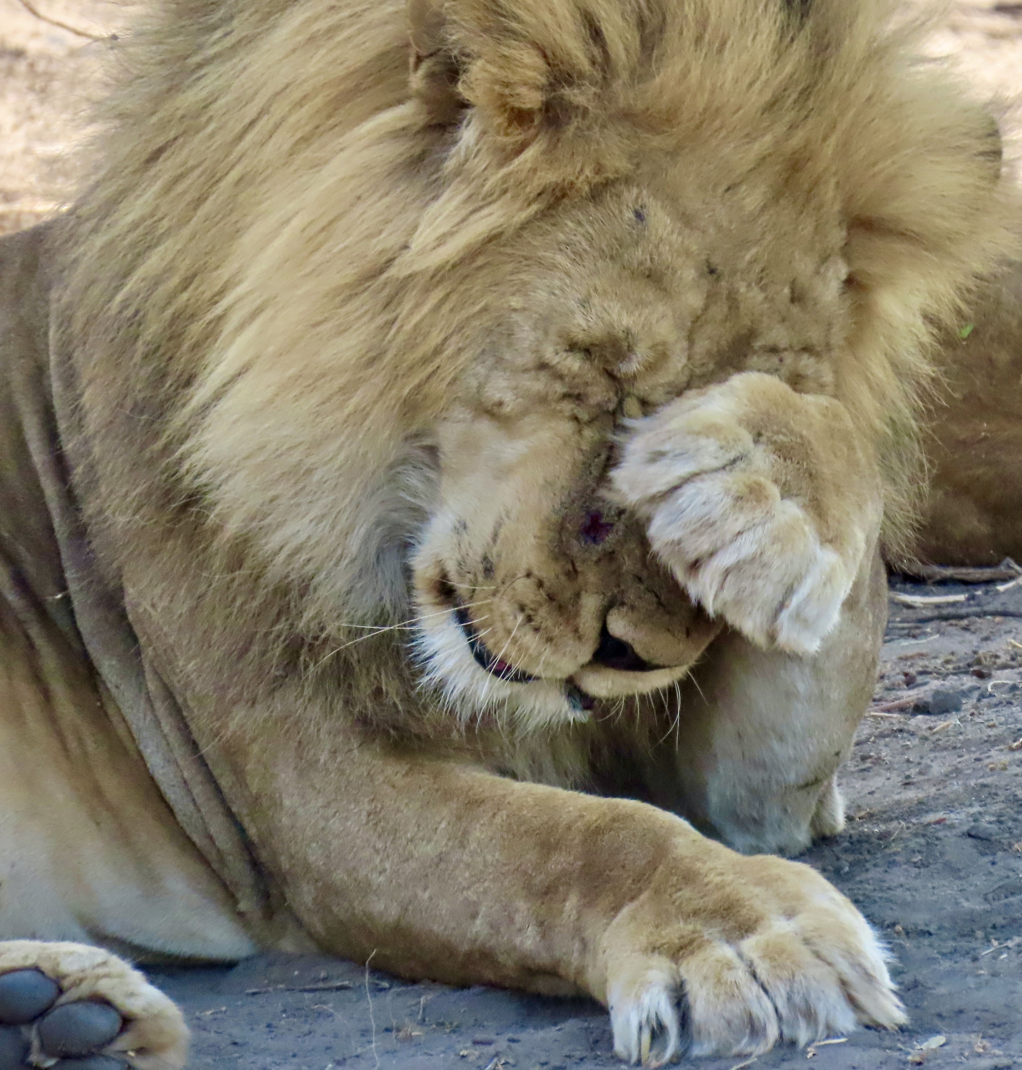 Female lions are excellent hunters. This photo suggests one of the reasons why. In addition to impressive teeth, they can run up to 50 miles per hour and weigh upwards to 350 pounds. We had just watched this lioness hunting. Her yawn suggested that perhaps it was nap time.Shortly after we took this photo, she made a brief dash after something we couldn’t see and she didn’t catch.Settling down (before the yawn), she was still on high alert.Checking in various directions…Which included eyeing us!We came across a lion that was working its way through a young elephant in Chobe. Malibu storks waited patiently for the lion to leave.Another lion invited herself to the meal…Check out the ears on the lion that had been enjoying its meal. If you have a cat, you know that means “I don’t think so.” A lightning fast paw may follow.So she stalked off past another safari vehicle that had also stopped to watch the action. Is that a hungry look she is focusing on the occupants?Which brings us to this magnificent fellow that I have already introduced in another post. He was about to give himself a bath. Note the size of his paws.Like any cat, it started with his tongue!First, he had to get his washcloth wet, i.e. lick his paws.He was quite thorough. And washed each side of his face. I thought this could have been titled: “Oh no, not another blog about me!” A close up…And then he washed the other side…Finally, he was ready for his portrait.