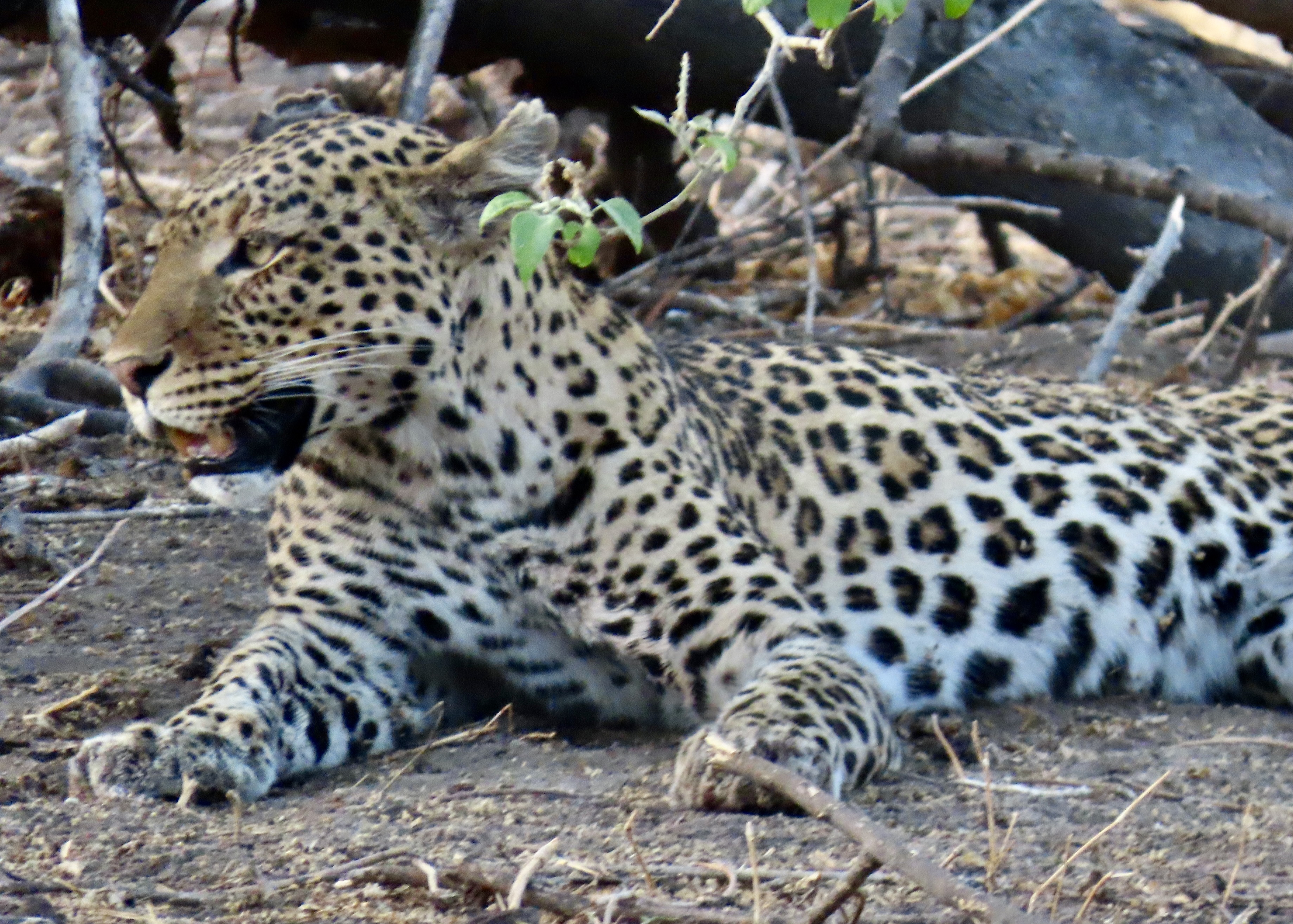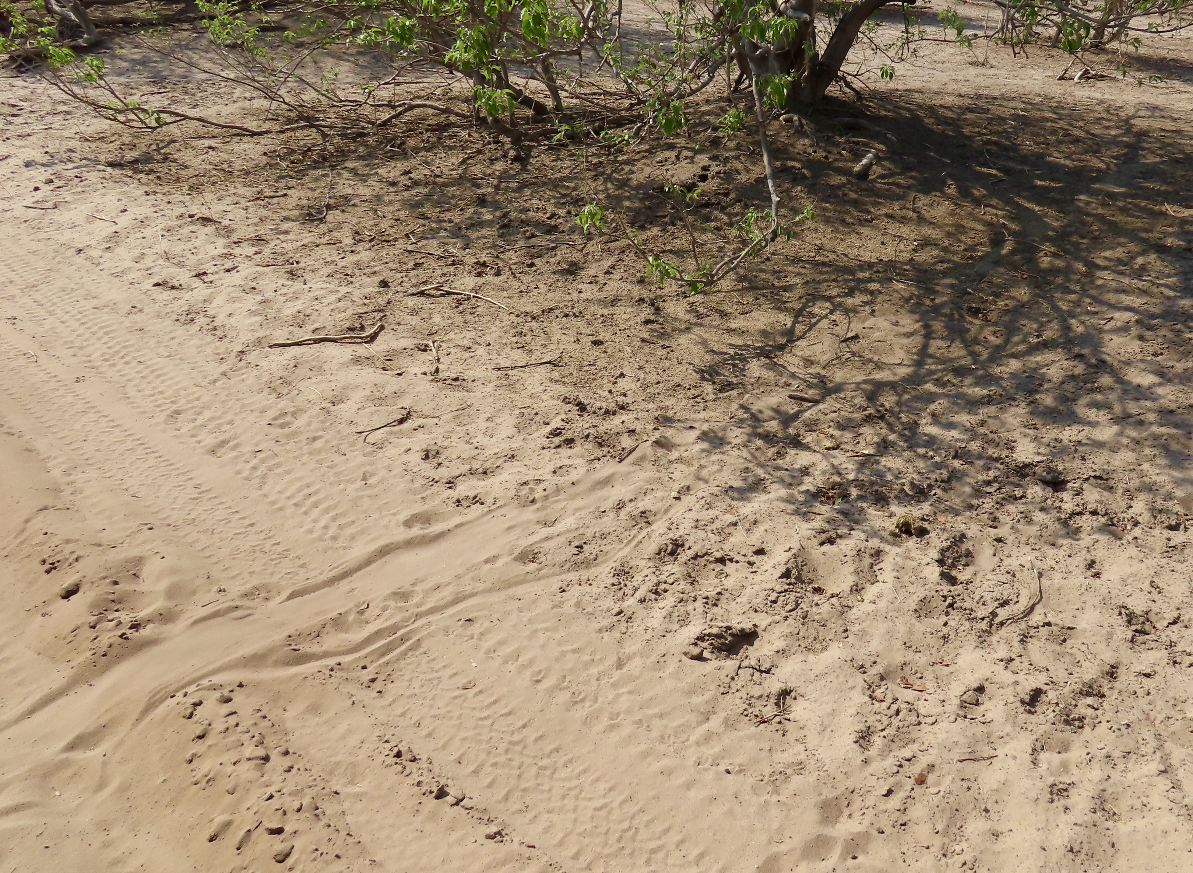 We were driving down one of the roads through Chobe National Park when we came across these interesting tracks. Our guide explained that a leopard had killed an antelope (probably an impala) and dragged it across the road. The fact that there were no tire tracks over the trail suggested it was very recent. We stared into the bush to see if we could spot the leopard and its meal. No luck. In fact, we would be lucky to see a leopard on our trip at all, the guide noted.The next evening as we were heading out of the park, he got a call and told us he had a treat, not explaining what. It turned out that a leopard had been spotted. We found it quite striking.It didn’t seem particularly bothered by our presence, but it did roll over and face away from us…A final shot. Next post: The striking fish eagle and a visitor from our trip up the Nile a year ago, the Egyptian goose.
