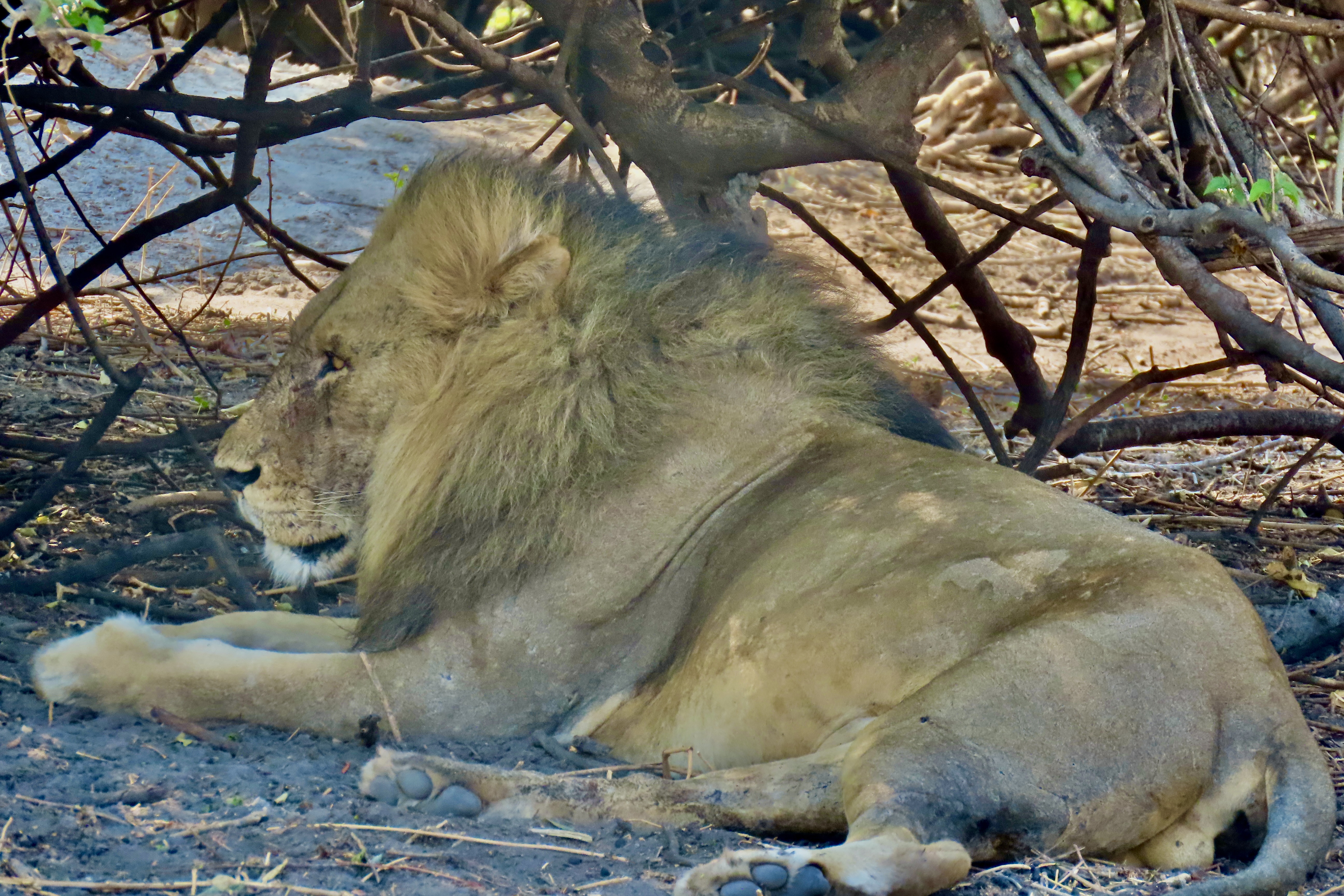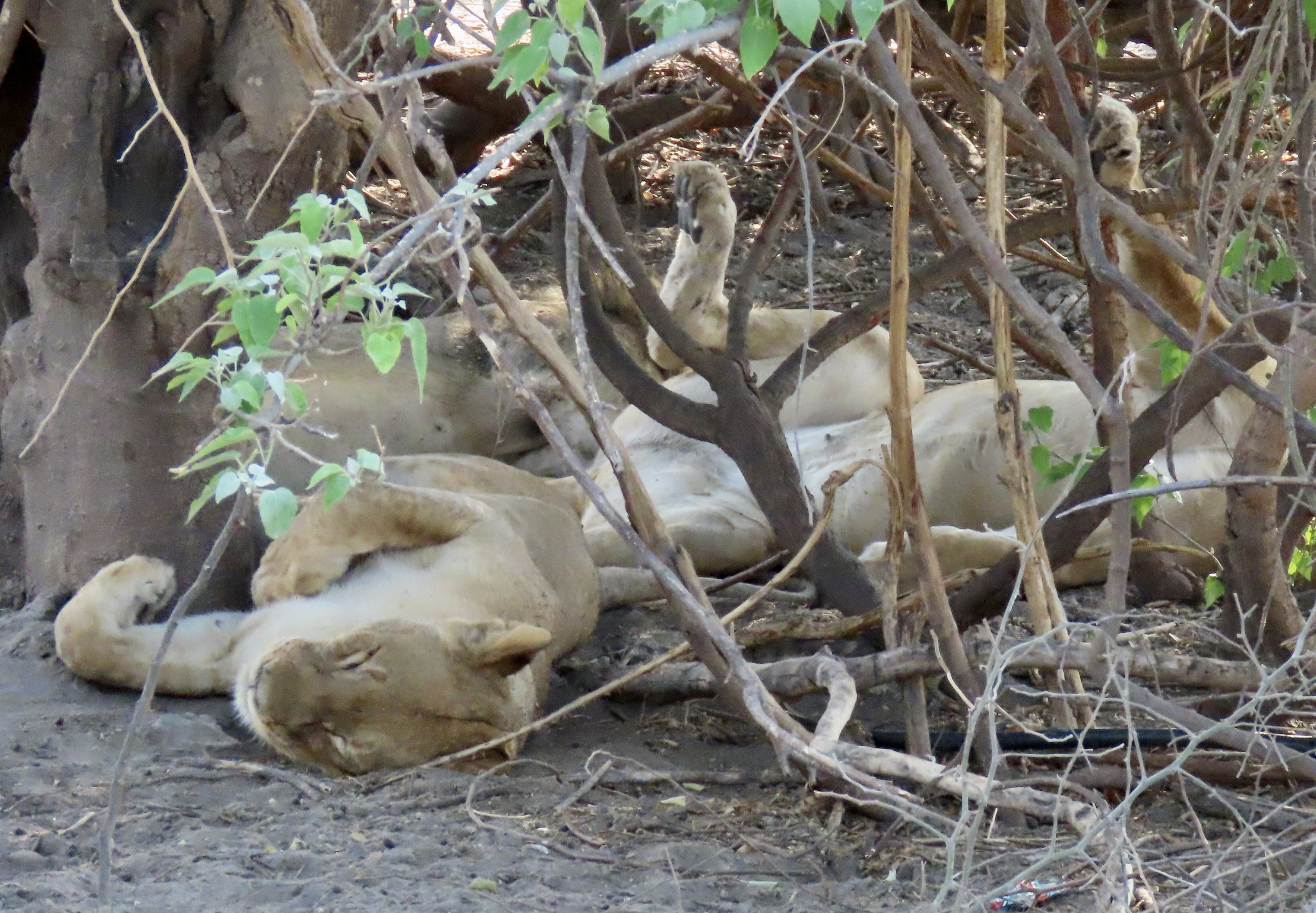 Nap time. Just like the cats that hang out in our homes, lions like to sleep: A lot, up to 20 hours a day. We came upon these females snoozing away in their amusing poses in Chobe National Park, Botswana. The whole pride was scattered out underneath the trees, including a large male.