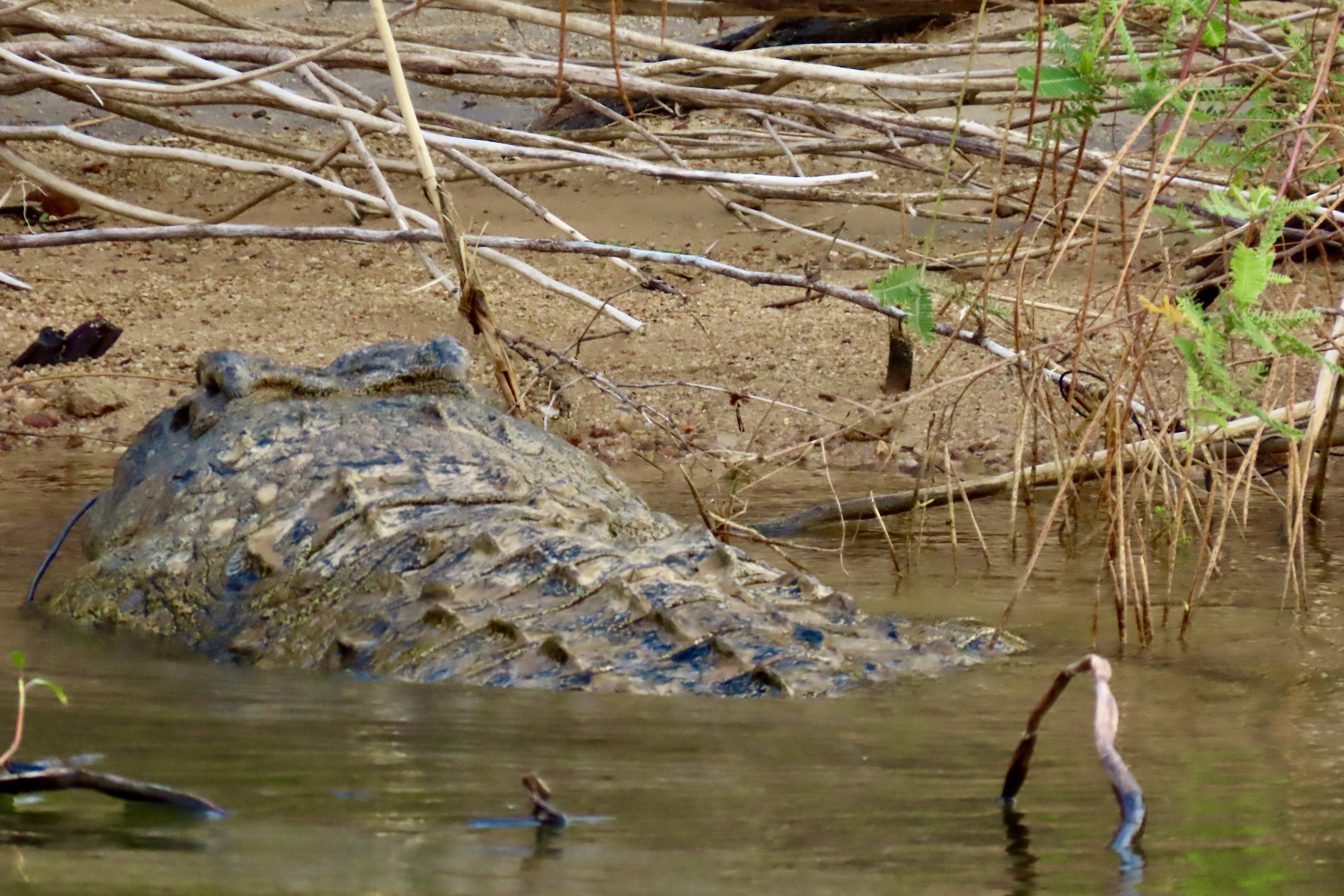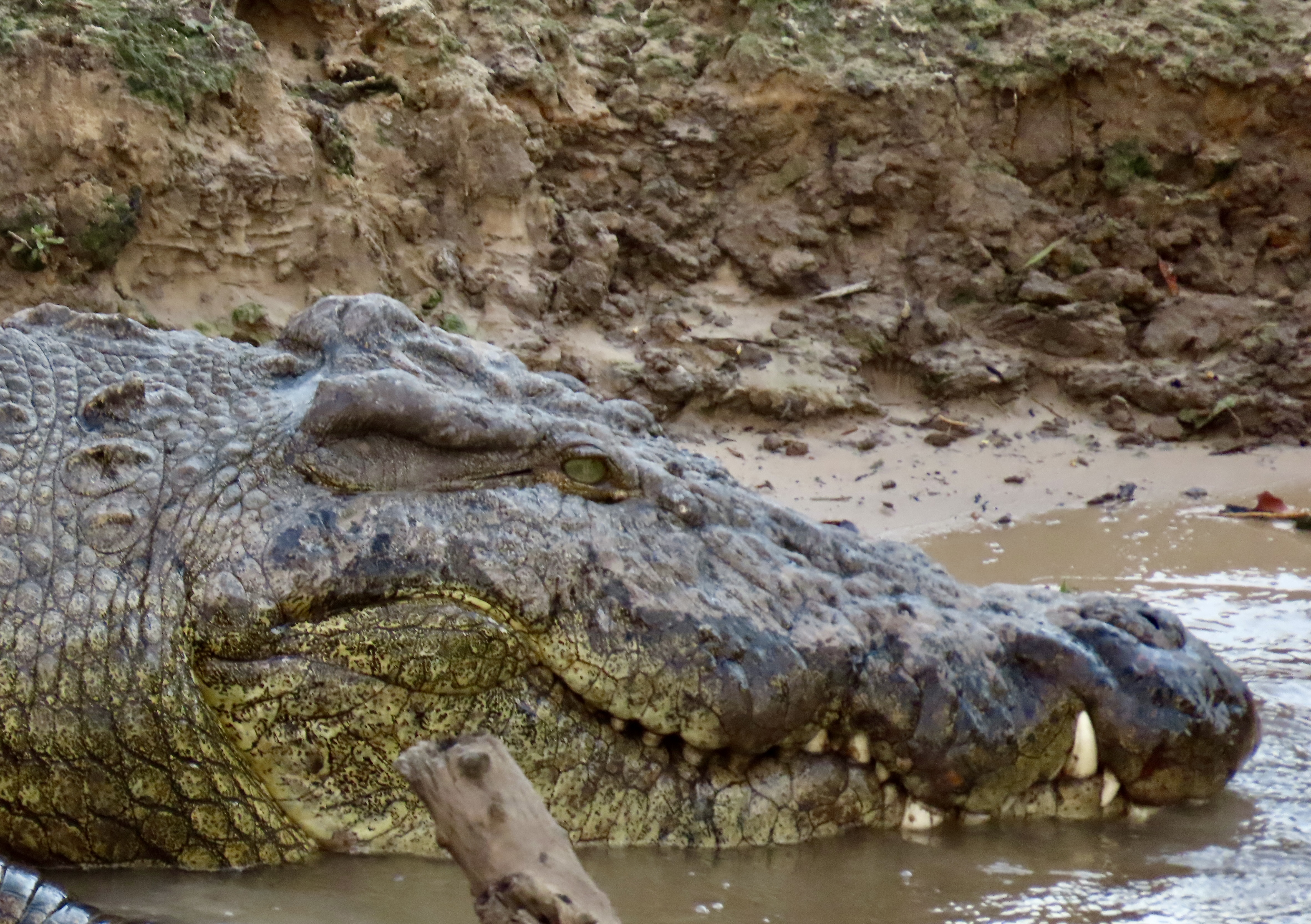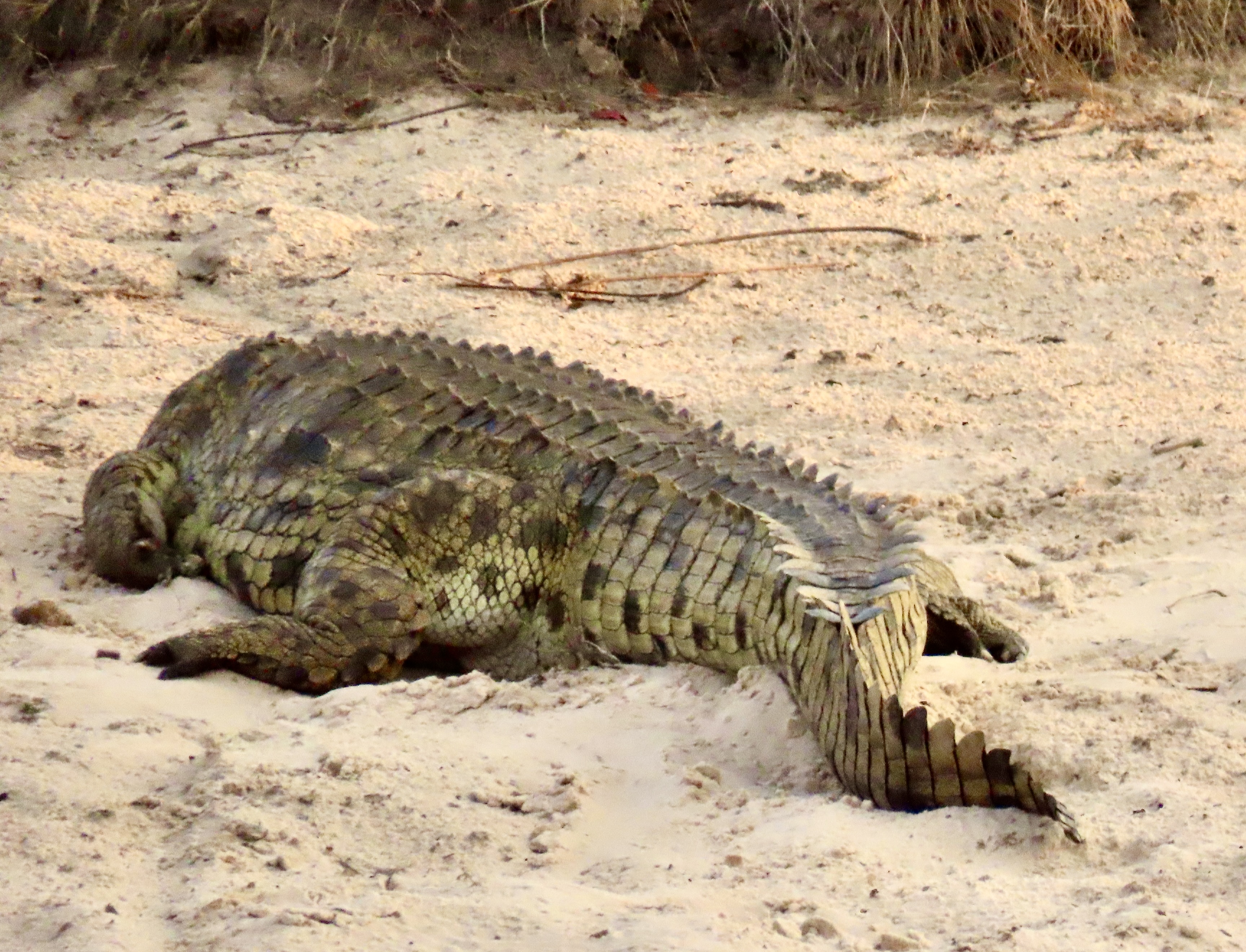 This is the crocodile I featured above, enjoying the sun on the banks of the Chobe River. A dead Cape buffalo that it may have been helping devour was behind it. (Not in the photo.)Not quite what I would classify as a toothy grin. Here’s an interesting fact. Crocodiles can go through 4000 teeth in a lifetime. They are able to replace each of their 80 teeth up to 50 times.This youngster from Chobe National Park that I featured before shows just how many teeth a crocodile has in its mouth. The purpose wasn’t to show us its teeth, however, its mouth was open to help it cool down. It’s called mouth gaping.We found this monster in Lake Kariba in Zimbabwe. It was probably guarding a clutch of 25-80 eggs. The female digs a hole in the sand and buries the eggs where they will incubate for 80-90 days. She can actually hear them peep when they are ready to hatch. She then digs them up and rolls them around in her mouth to help them hatch. The male may help in this process. They then carry them down to the water where they continue to guard them, ferociously, if necessary.Swimming in Lake Kariba is highly discouraged. A possible confrontation was about to take place here in the lake. Males are very territorial. I thought the water level perspective on the two crocodiles was interesting.We were at a small watering hole in Hwange National Park admiring giraffes when the water in the pond suddenly erupted. It was impossible to tell what was making all of the ruckus.And then it became obvious. Two crocodiles were biting it out! “One of the crocodiles took down a Kudu earlier today,” our guide explained to us. “It is protecting its kill.”We saw a number of crocodiles on an evening trip up the Zambezi River near Victoria Falls, including this one. Peggy thought it was quite colorful. And toothy. Another interesting fact about crocodiles is they have very weak jaw muscles for opening their mouths. You could hold this fellow’s mouth closed with one hand. Closing is something else. A crocodile has one of the strongest bites of any creature in the world and is capable of exerting up to 5000 pounds of pressure per square inch! I’m thinking that this is something one might want to consider when deciding to experiment with holding its mouth closed.The colorful tail of the crocodile above. A crocodile uses its tail to propel itself through the water at up to 22 miles per hour. The feet serve as rudders.Another tail shot of a different crocodile on the Zambezi River.We thought this was a fun shot of a crocodile sleeping on the banks of the river.I’ll conclude with this final head shot. You won’t want to miss Monday’s post on the ostriches and penguins of South Africa.