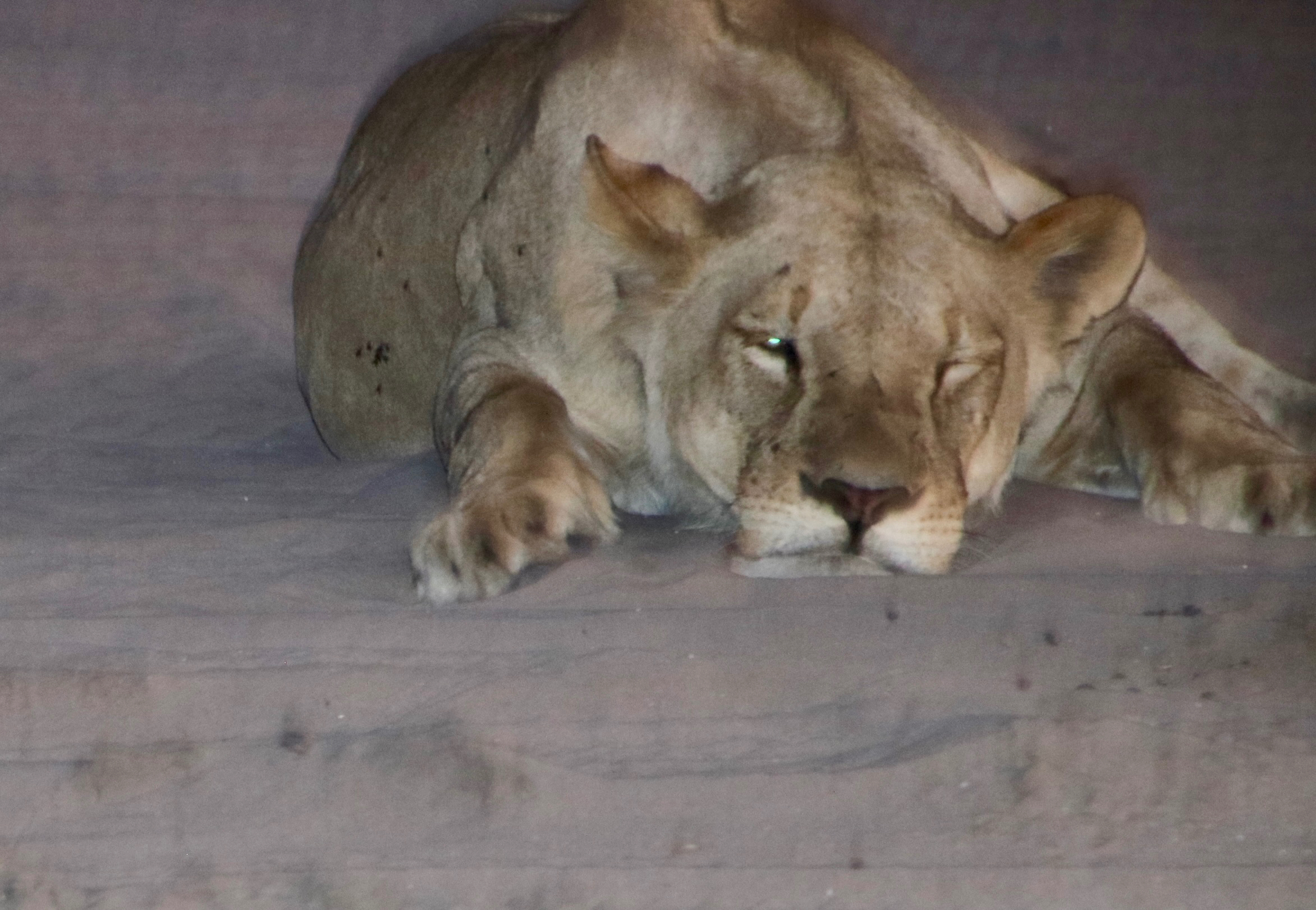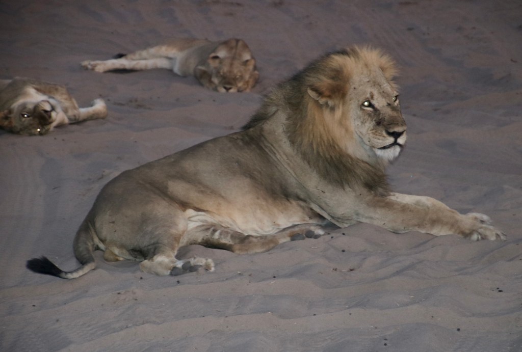 This was one of the males that was responsible for protecting the pride. We often hear how lionesses do most of the hunting and ‘bring home the bacon’ (warthog), to the king of the jungle. This is true, but one look at this male persuaded us that his life as protector was far from easy. Check out the large scar running down his side! He earned his food.The sun was going down when we came on the pride sleeping in the sand, obviously taking advantage of its warmth. There were at least 10 lions enjoying the last rays.There were two males with the pride. This one seemed to be saying, “Mind if I join you?” Note the female’s swishing tail. More cat language.Apparently the answer was yes.The setting sun lit up the lions’ eyes. Peggy and I were thinking, “These are kitties we do not want to disturb.”