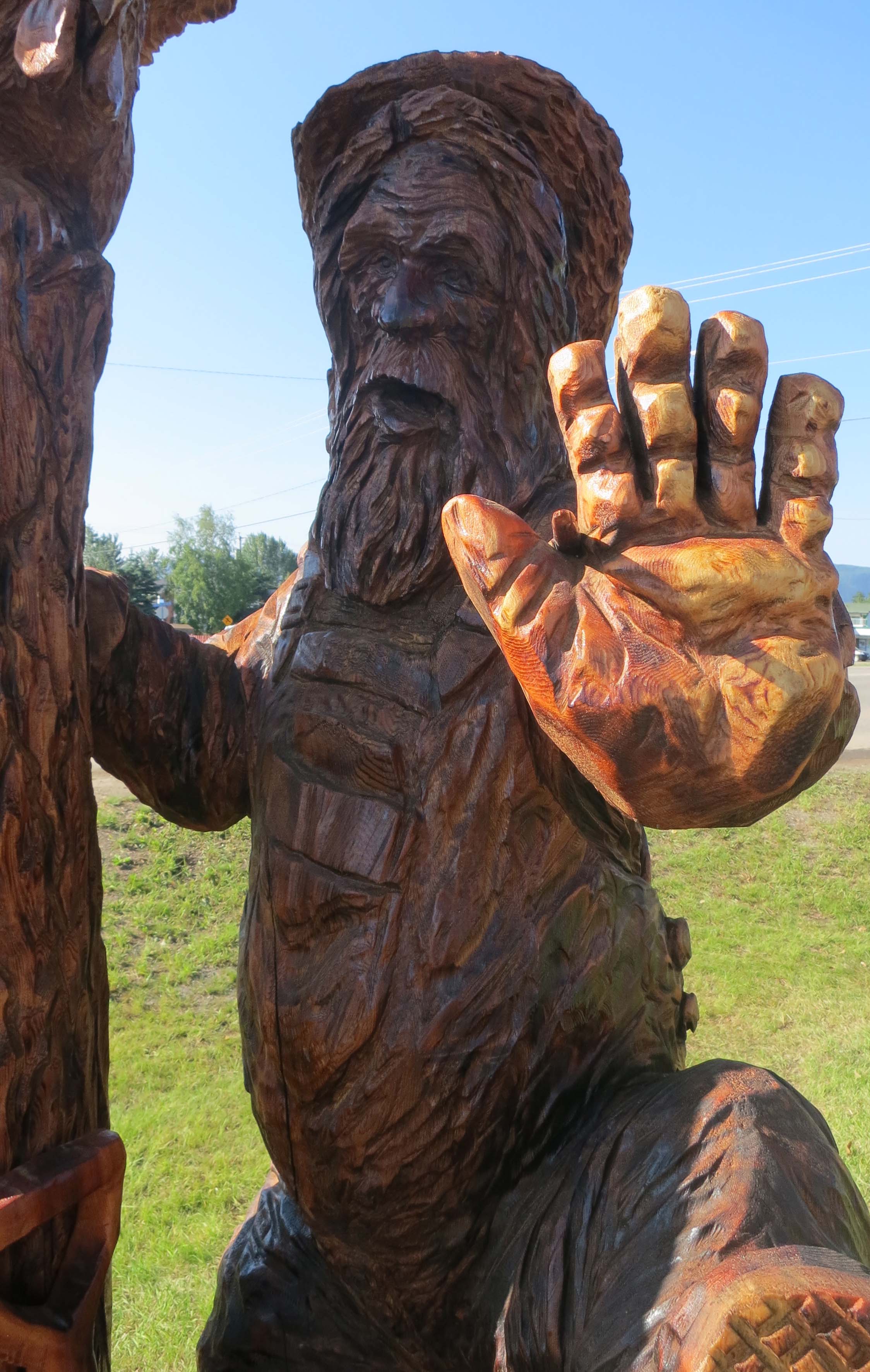 This sign, featuring an orca, grizzly and salmon, welcomes visitors to Telegraph Cove. Also note the impressive drift wood. We were to find some on our trip. (Photo by Peggy Mekemson.)