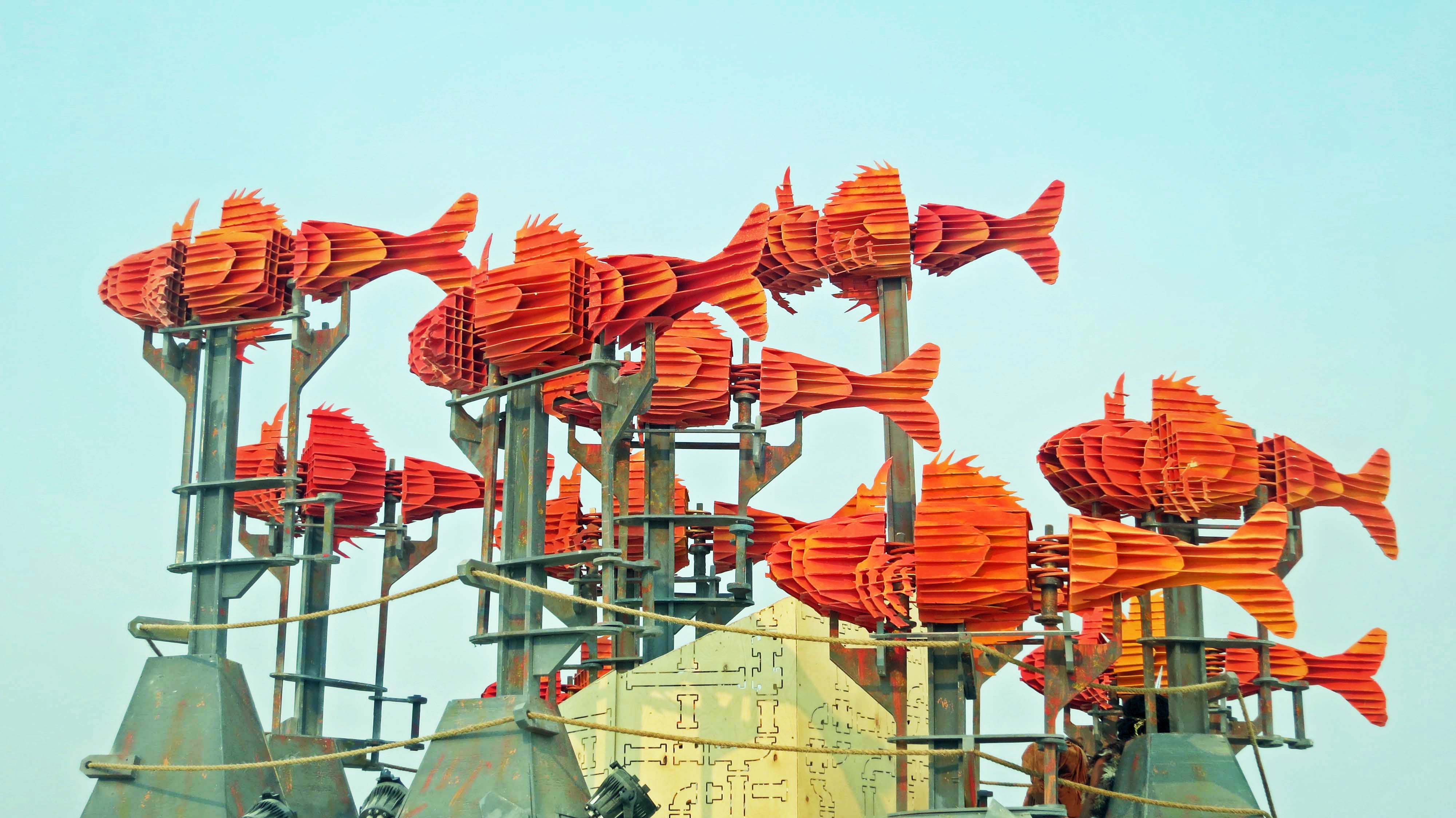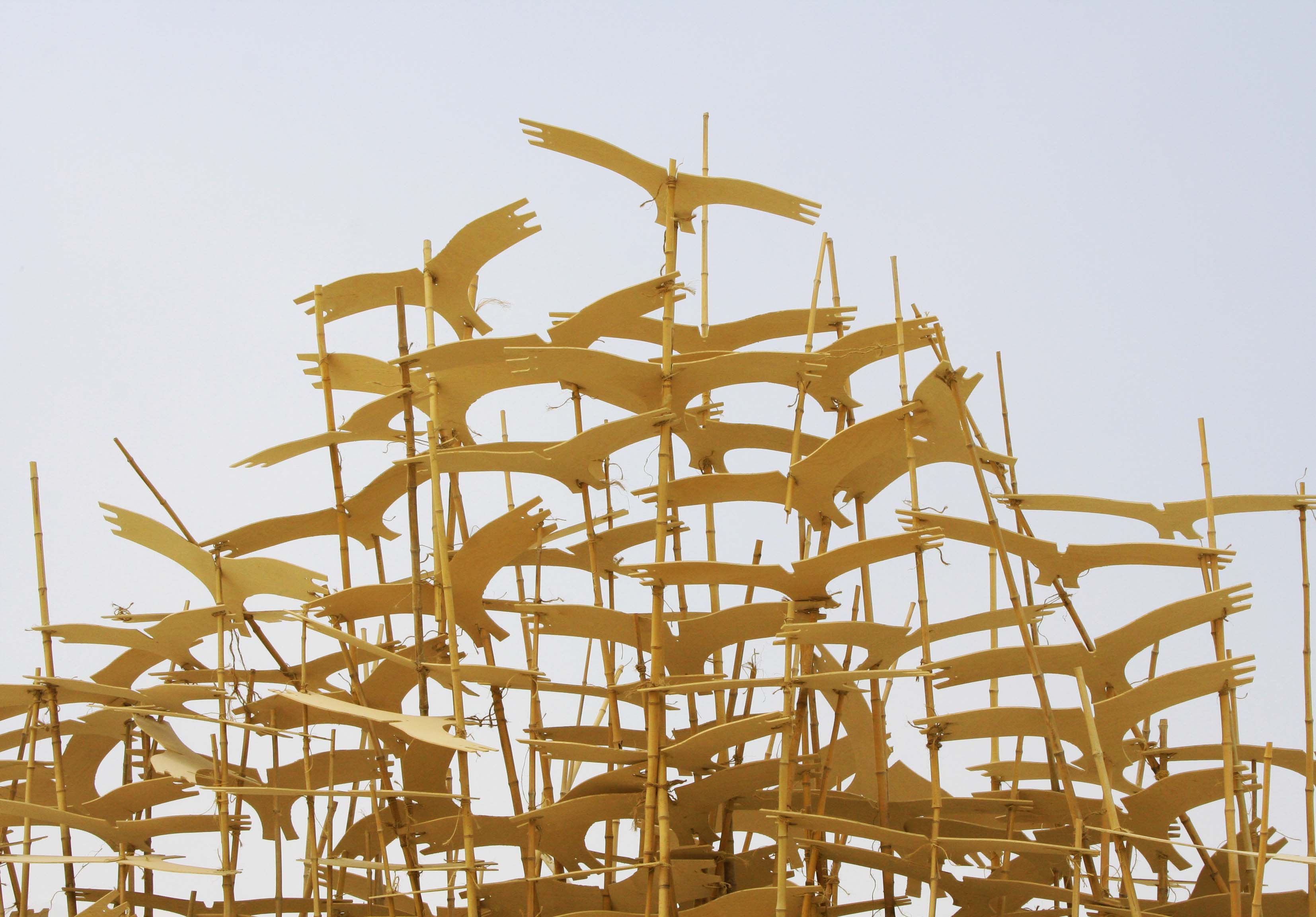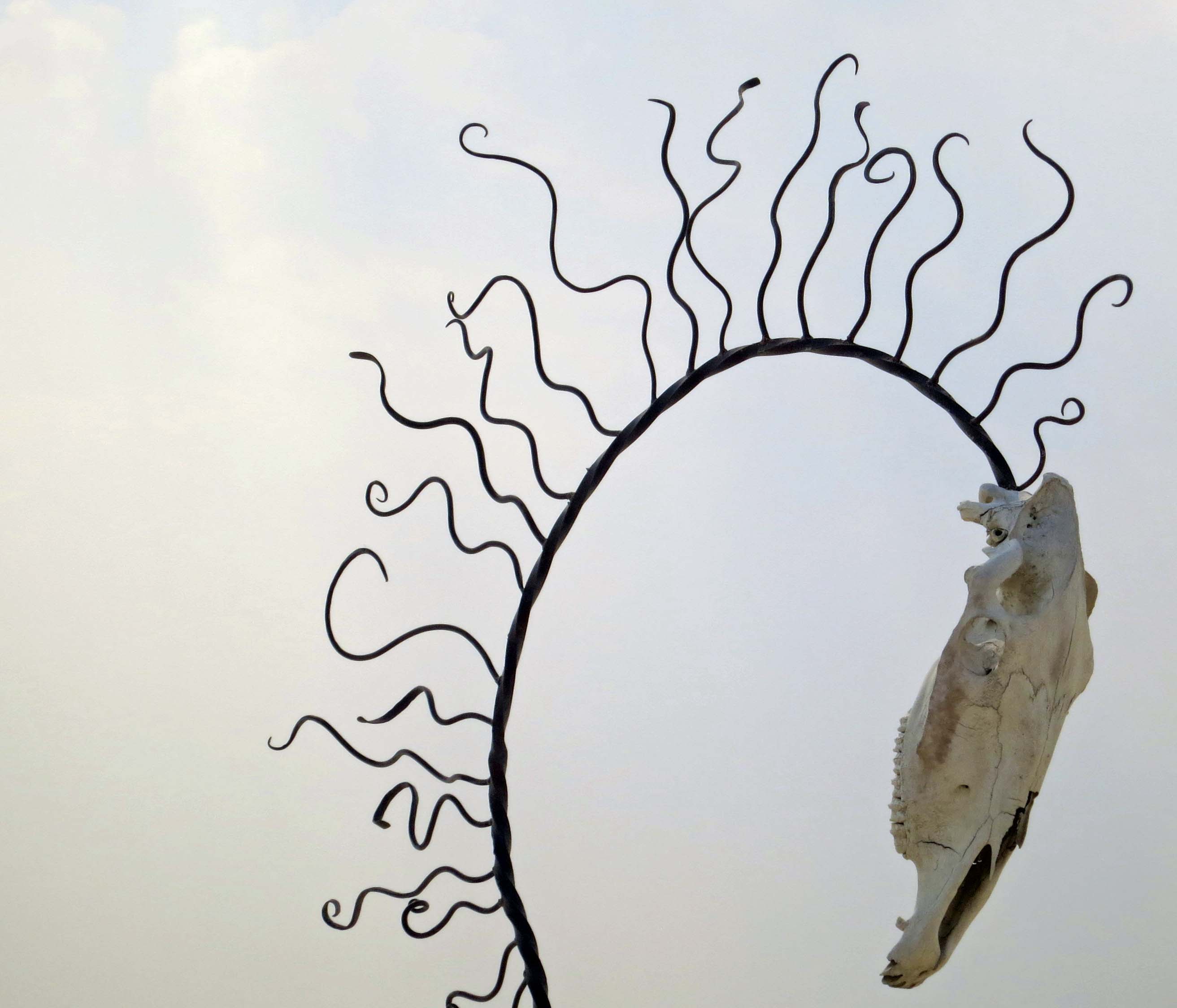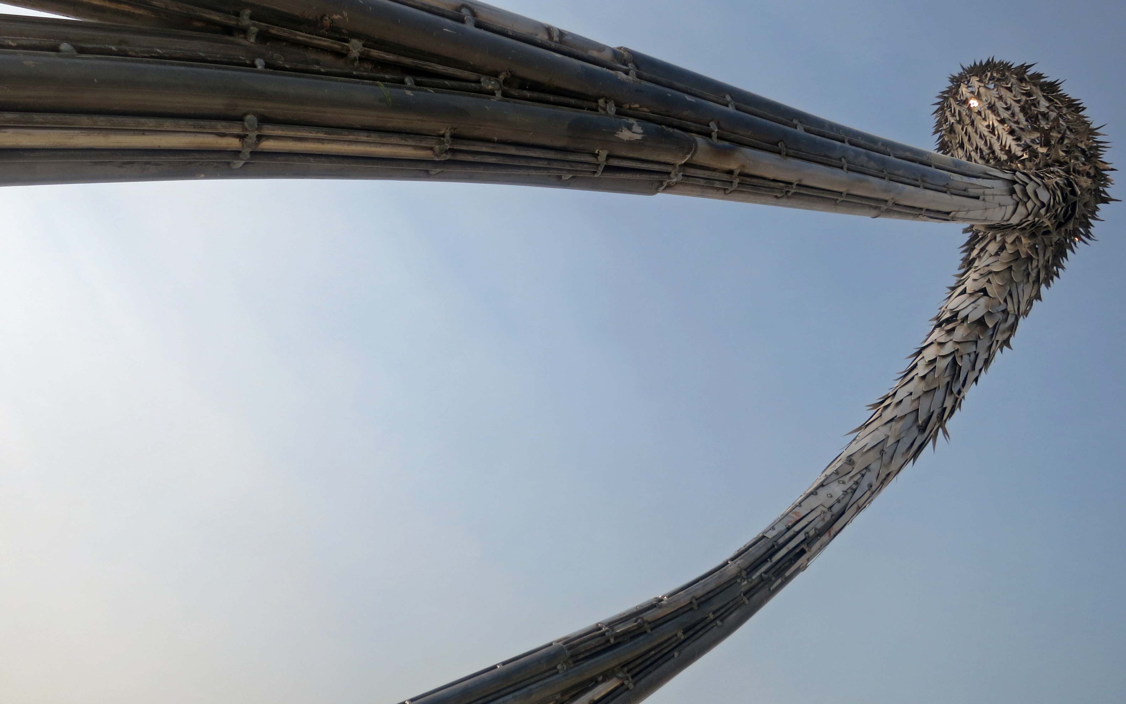 A tail’s-eye view of Coyote during the day. Need a wire brush? One person rests in Coyote’s belly while another climbs up the sculpture.
