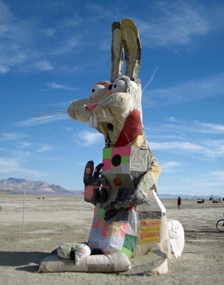 There is entertainment galore. Twirling fire is big at Burning Man. As is creating magic with hula hoops. If you want to see something truly sensuous, watch a talented hula hooper. The Center Camp Café always has something going on, both planned and impromptu. One moment you might be listening to a lecture on physics and the next surrounded by several hundred large rabbits, or at least people wearing rabbit ears. But you can be anywhere in Black Rock City or out in the Playa and find entertainment.