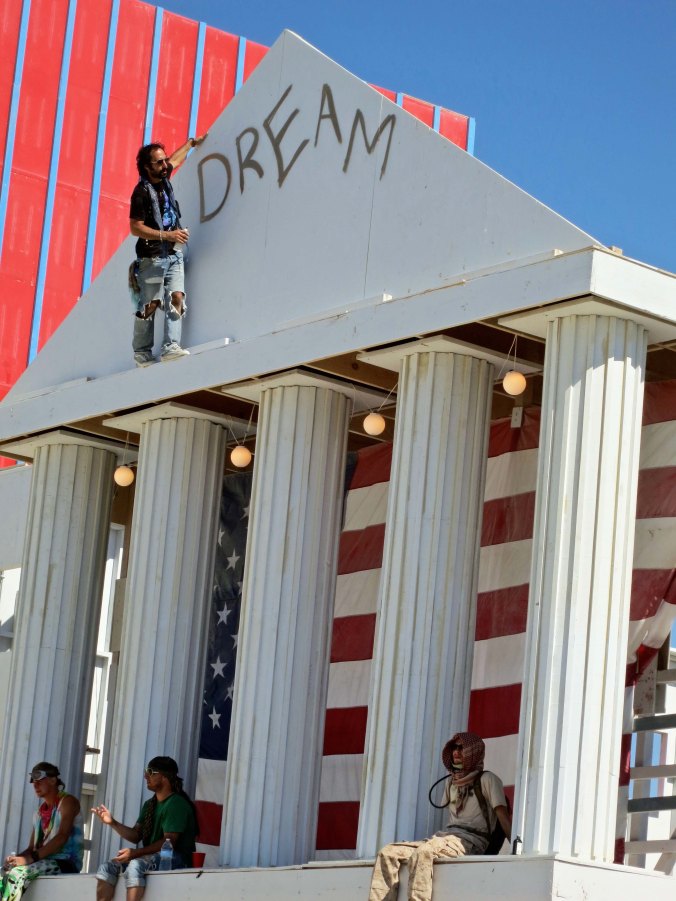 There are other things to do at Burning Man besides look at art, of course. For example, you can party 24/7 for a week if that’s your thing. Bars ‘gifting’ free booze are located on almost every corner. You can also dance the night away, or day. I saw people dancing country along the 6th street route I followed into Center Camp, and I could have gone elsewhere to learn to Tango, had I been so inclined. The most common music, however, is the type that goes thump, thump, thump in the night, industrial strength stuff. World renown DJs come to Burning Man to play it for free. The music will keep you awake if you allow it. I have a very loud, battery operated fan that serves as a wonderful noise maker in addition to keeping me cool, however. Let it thump away. (The secret of sleeping through the desert heat, BTW, is to wear a wet T-shirt and let evaporation do its thing. It also works for daytime naps. The fan speeds up the evaporation and makes it cooler.)