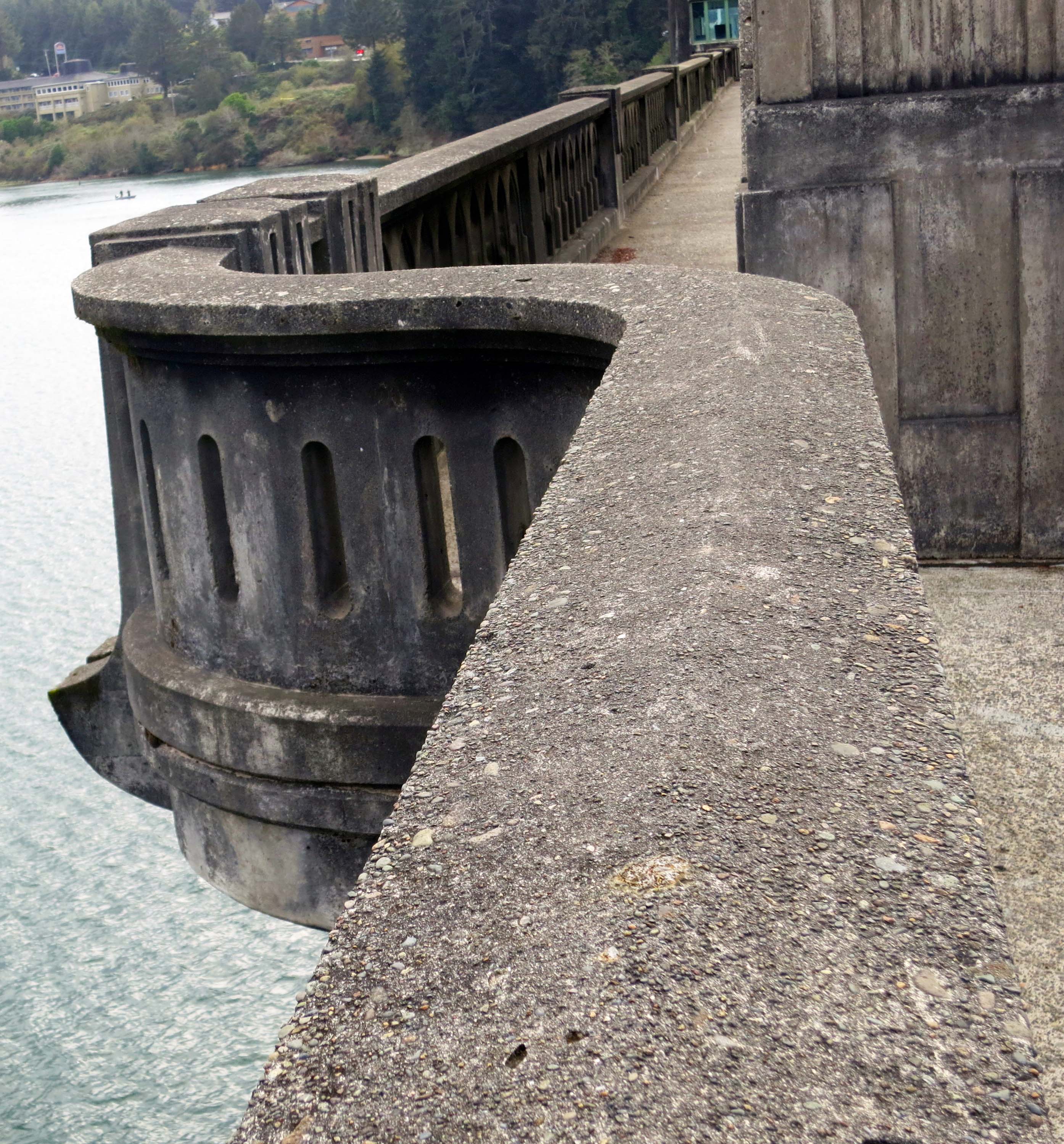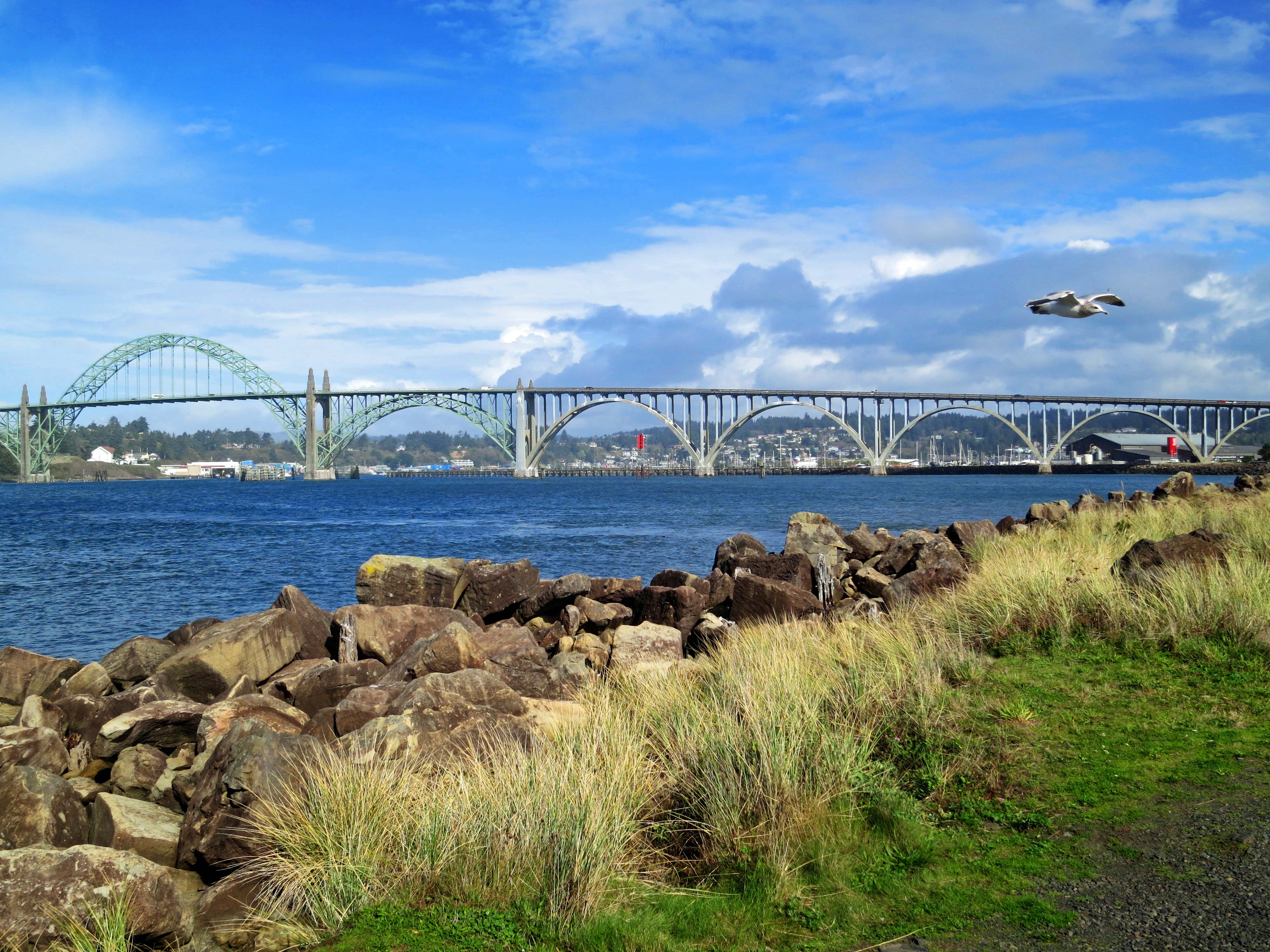 I spent the night at a delightful campground next to the Florence Marina. This gave me the opportunity to walk over to the Siuslaw Bridge and spend time admiring it. The bridge was built under Franklin Roosevelt’s New Deal Public Works Administration during the Great Depression. It was one of hundreds of projects across the nation designed to put Americans back to work. Both Peggy’s dad in Pennsylvania and my dad in Iowa benefited from this program. Some 140 men worked on the Siuslaw Bridge. It was opened March 31, 1936.