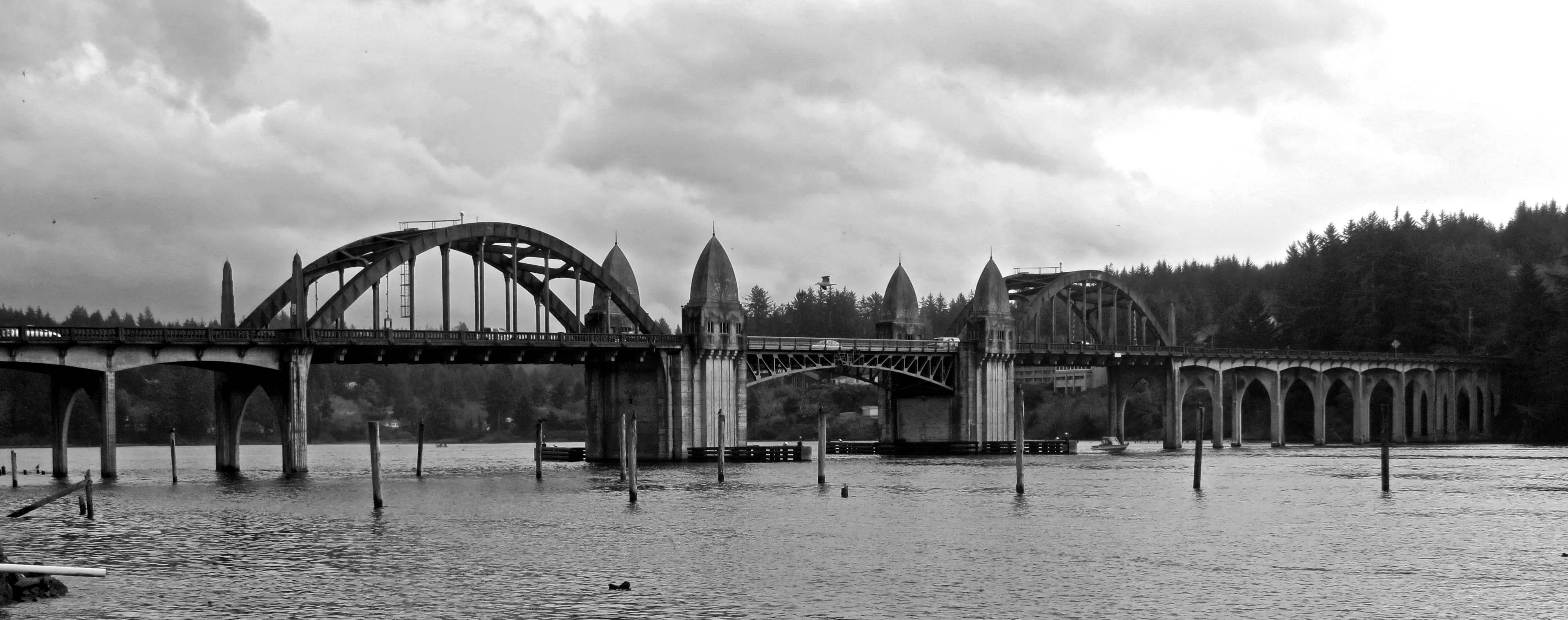 Last Monday I posted a story and photos on the Cape Creek Bridge designed by Conde McCullough. Today I am going to feature two more of his bridges: the Yaquina Bay Bridge near Newport, and the Siuslaw Bridge near Florence. I first became aware of these two beauties when I used to visit my dad who managed a hotel on the coast for my brother in the late 70s. Marshall later sold the place, an action for which I have never quite forgiven him. Neither have I forgiven my cousins who had the luck of growing up in Newport.