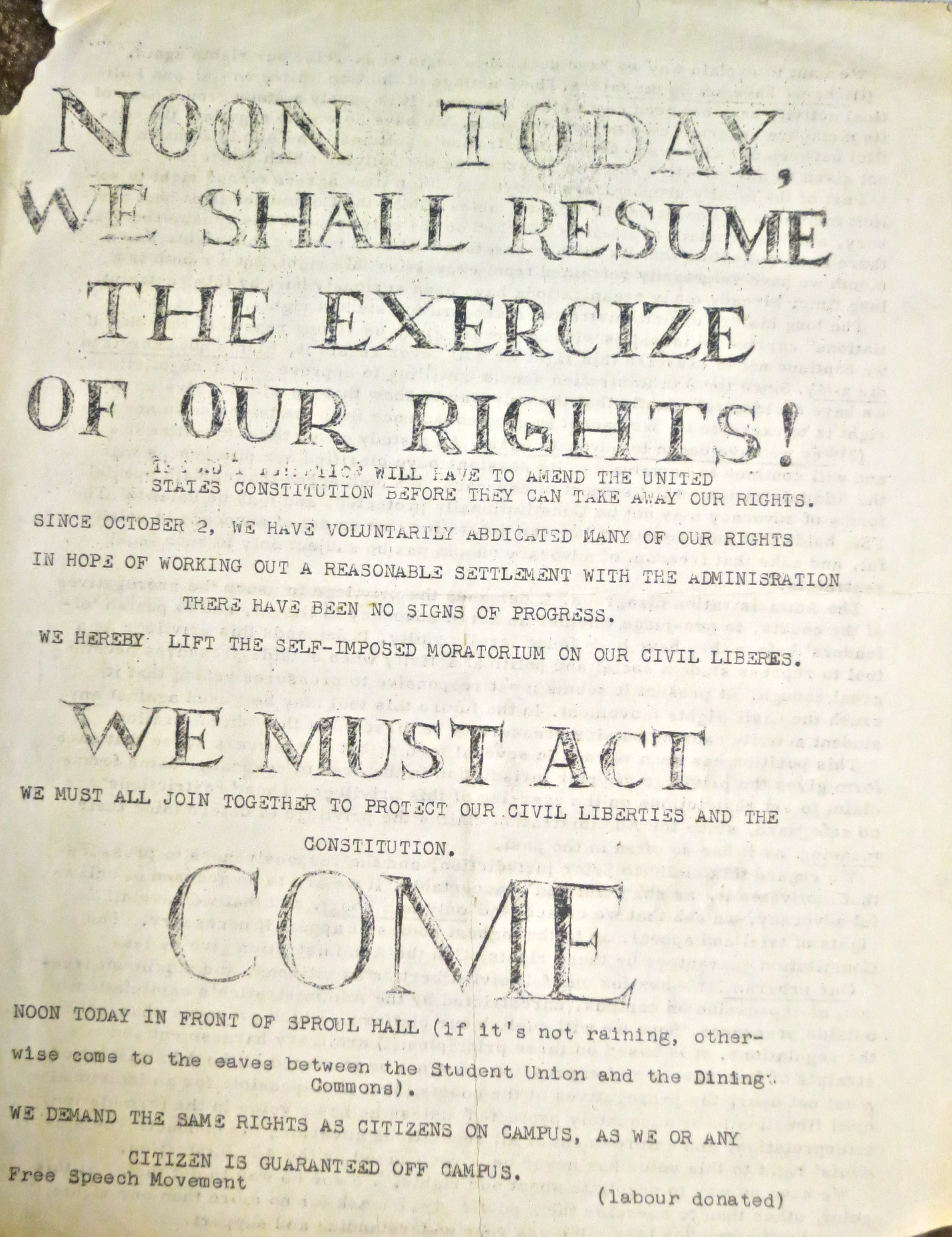 Hastily run off mimeograph sheets such as this one kept students up-to-date on what was happening with the Free Speech Movement. It seems terribly quaint in the age of the Internet and cellphones.
