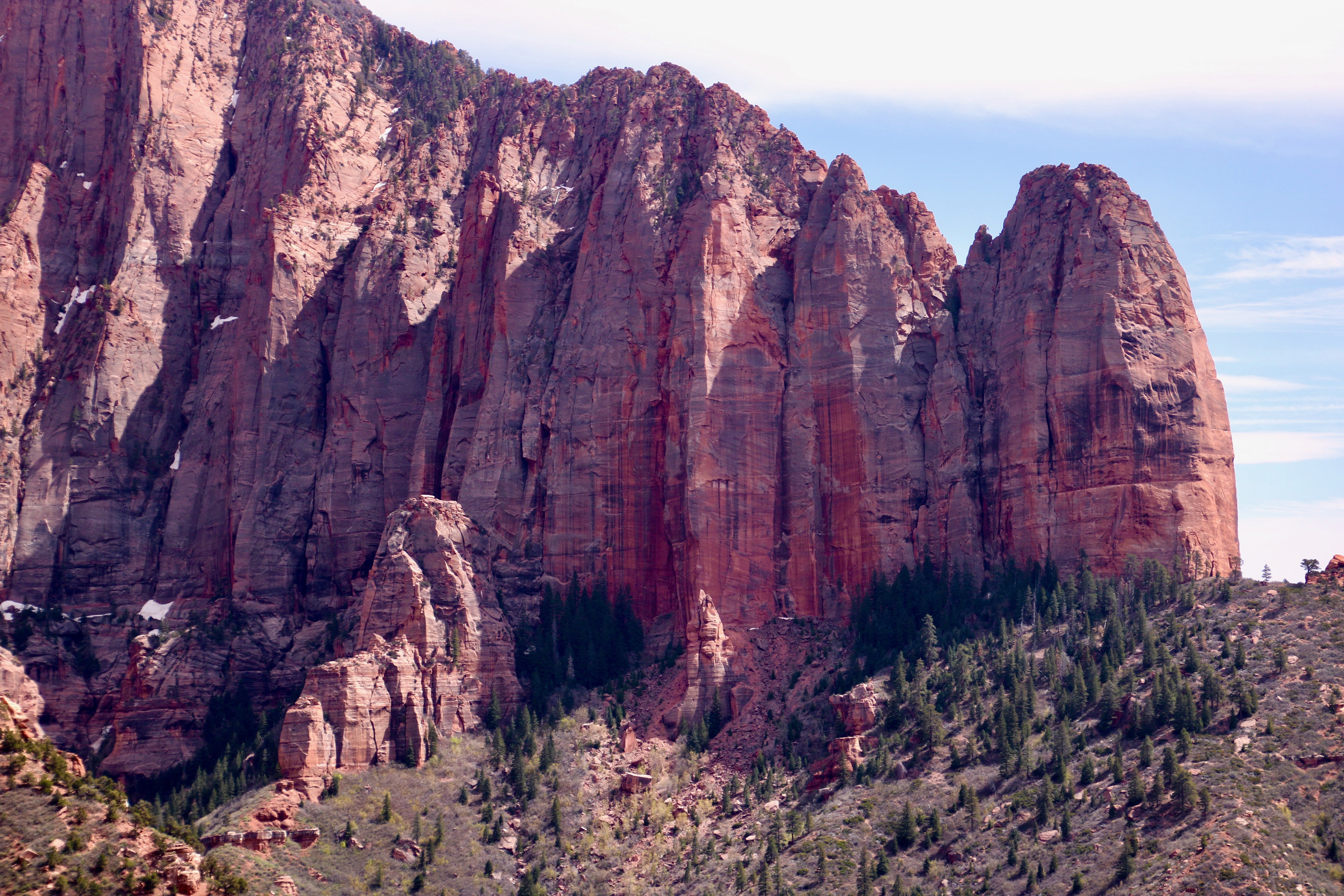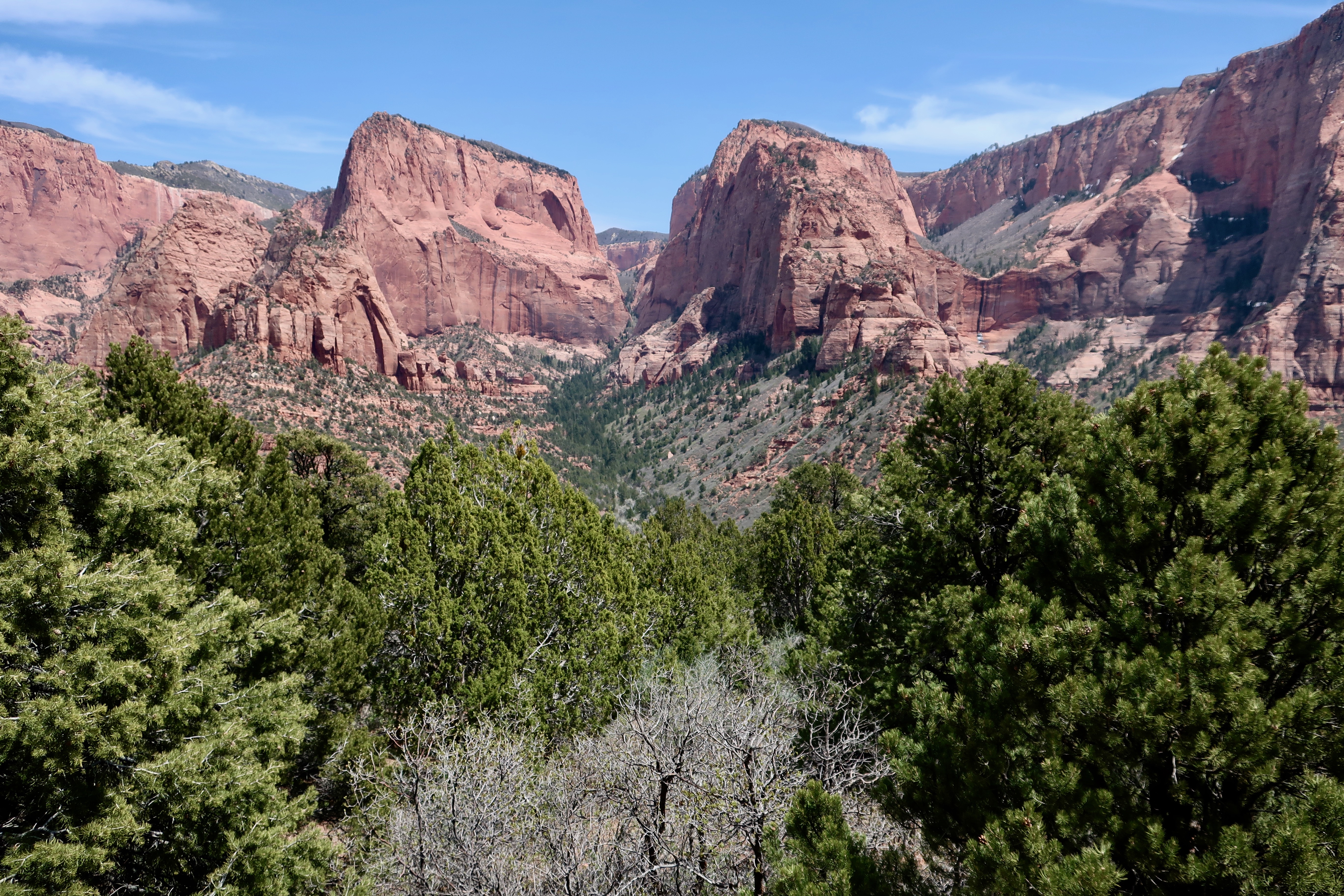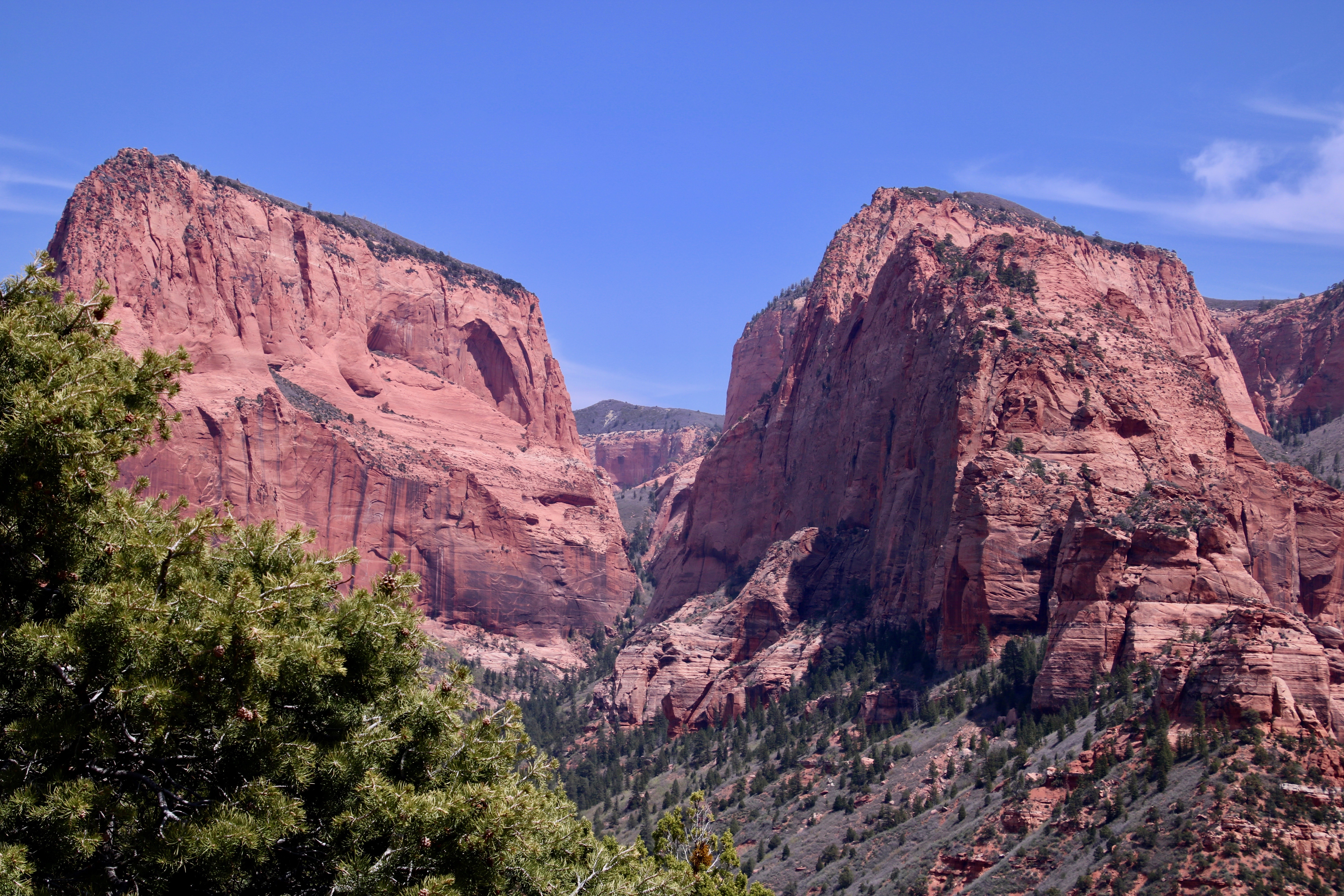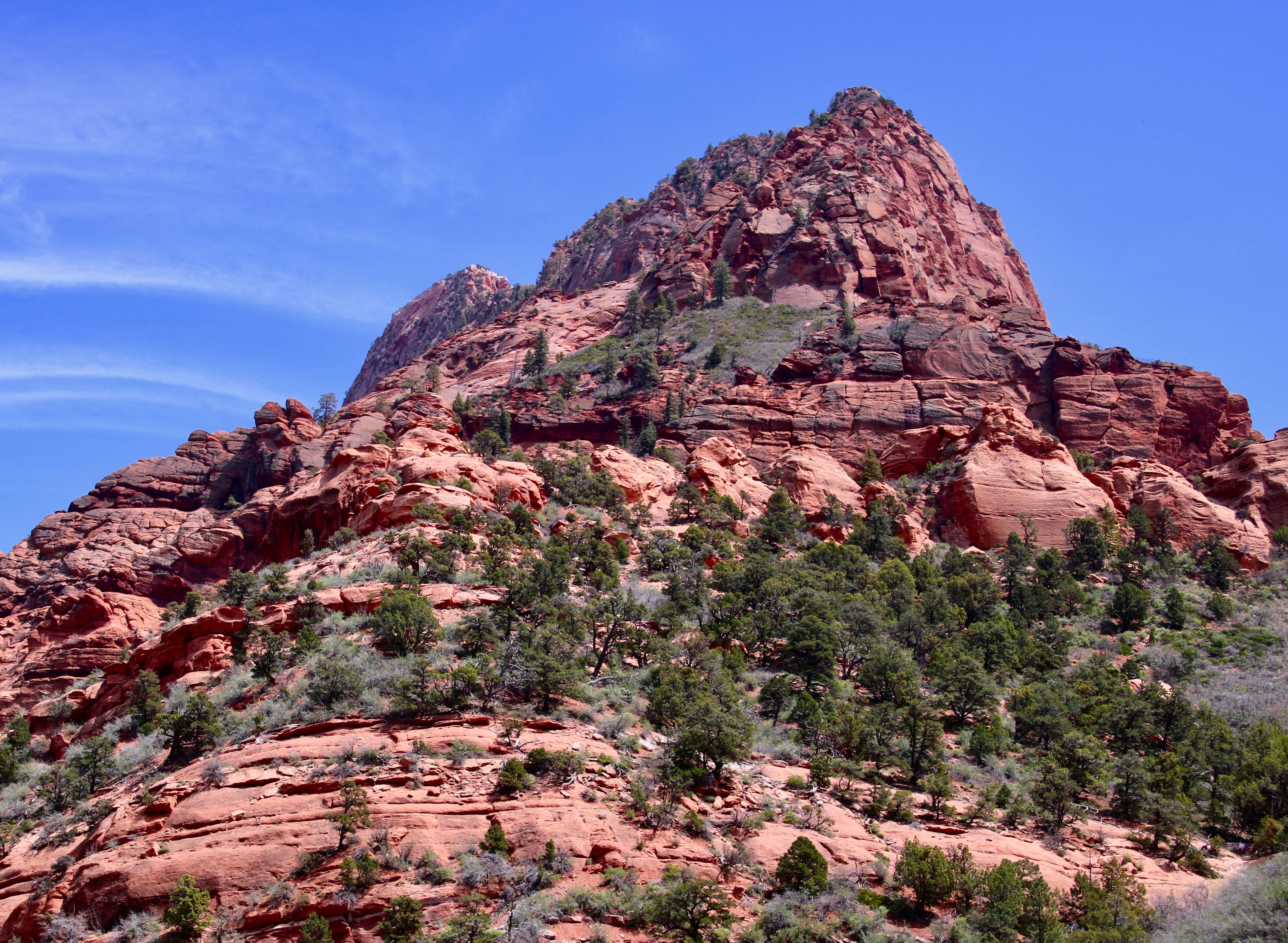 The curvy five-mile drive climbs a thousand feet. It can be accomplished in a relatively short amount of time, but— if you are like us— you will want to linger and admire the fantastic views of towering Navajo Sandstone cliffs and deep finger canyons created by runoff from the plateau above. There are a number of pullouts along the way. Each one provides a different view or perspective and each is worth a stop. The following photos reflect what Peggy and I saw.