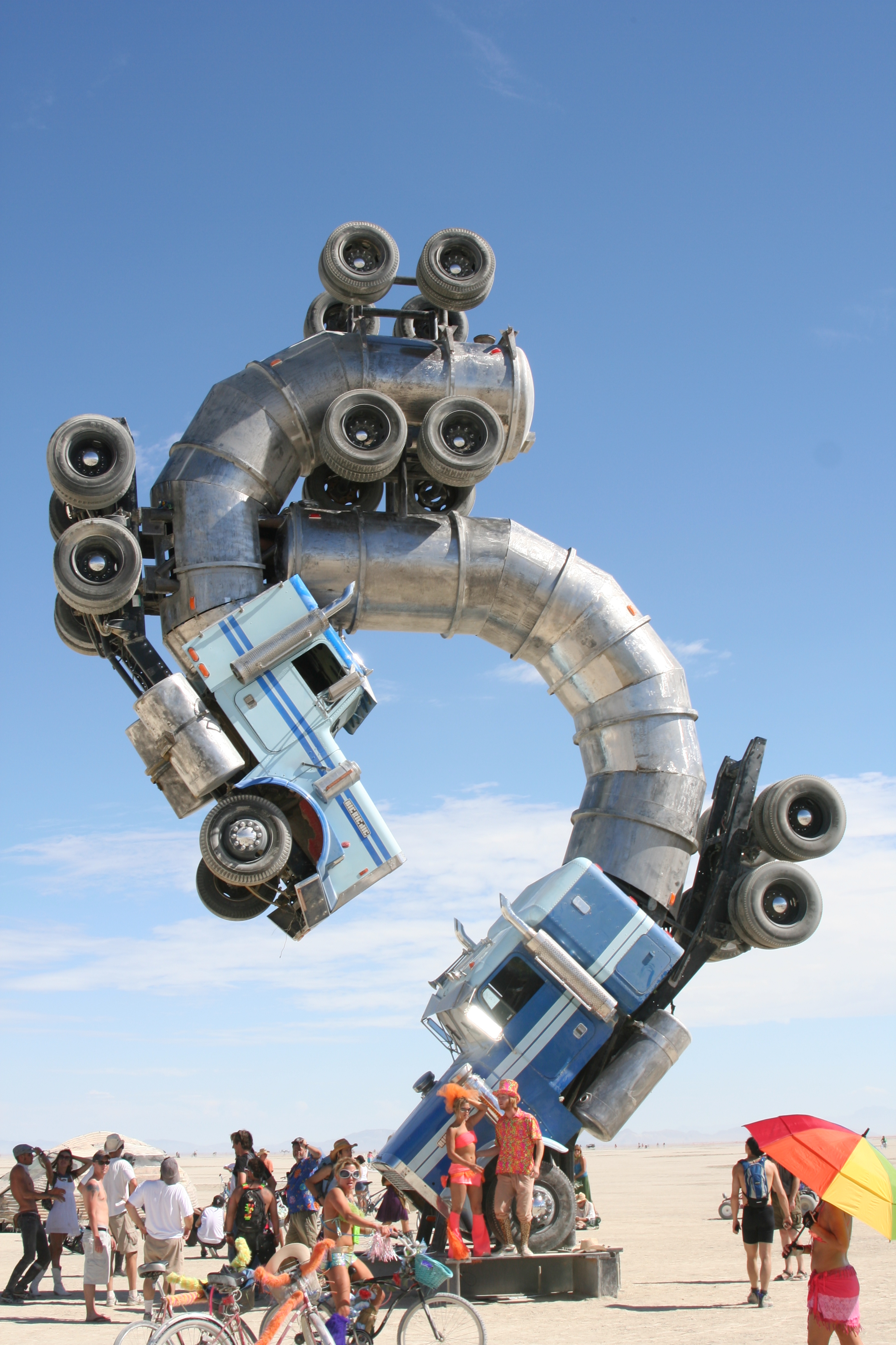 Fascinating at any time of the day, Burning Man becomes a surrealistic fantasy world at night. Fire breathing dragons and fire spouting art light up the sky. Dozens of creatively lit mutant vehicles cross back and forth across the Playa, as do thousands of light decorated bicycles. The glow stick industry must make a fortune. Even people become walking light shows. Dozens of venues along the Esplanade invite exploration. Watch a circus, see Godspell, climb on a giant teeter-totter, visit a maze or gyrate to music. Join a crowd watching a troupe of fire dancers work its magic on the Playa.