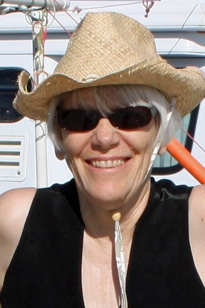 Dust storms can drastically reduce visibility, not to mention get in your eyes, nose, ears, vehicles, etc. Luna, aka Peggy my wife, bundles up against a dust storm as it roars through Center Camp. Photo by Ken Lake