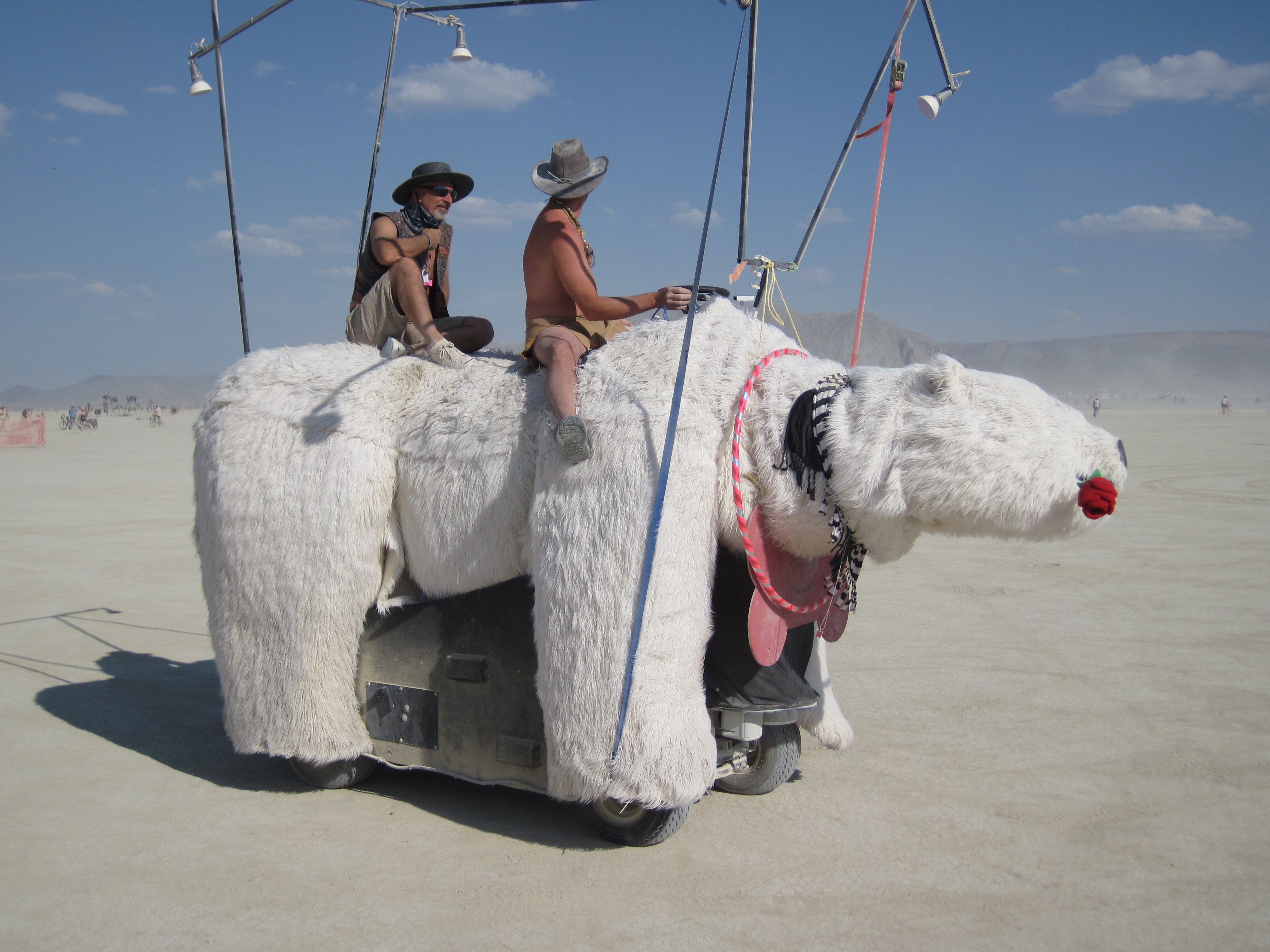 The Program lists a dozen ways to practice yoga and a few hundred ways to party. Or you can attend AA. You can write music, or cite poetry, or attend a film festival. Need a costume. You can pick one up for free. There are dozens of venues to view or practice fire art. Like to dance? There are opportunities ranging from the Tango to the Hokey Pokey. Lessons are provided. Parades go on 24/7. Dress up like a bunny or put on your little red dress and parade away.