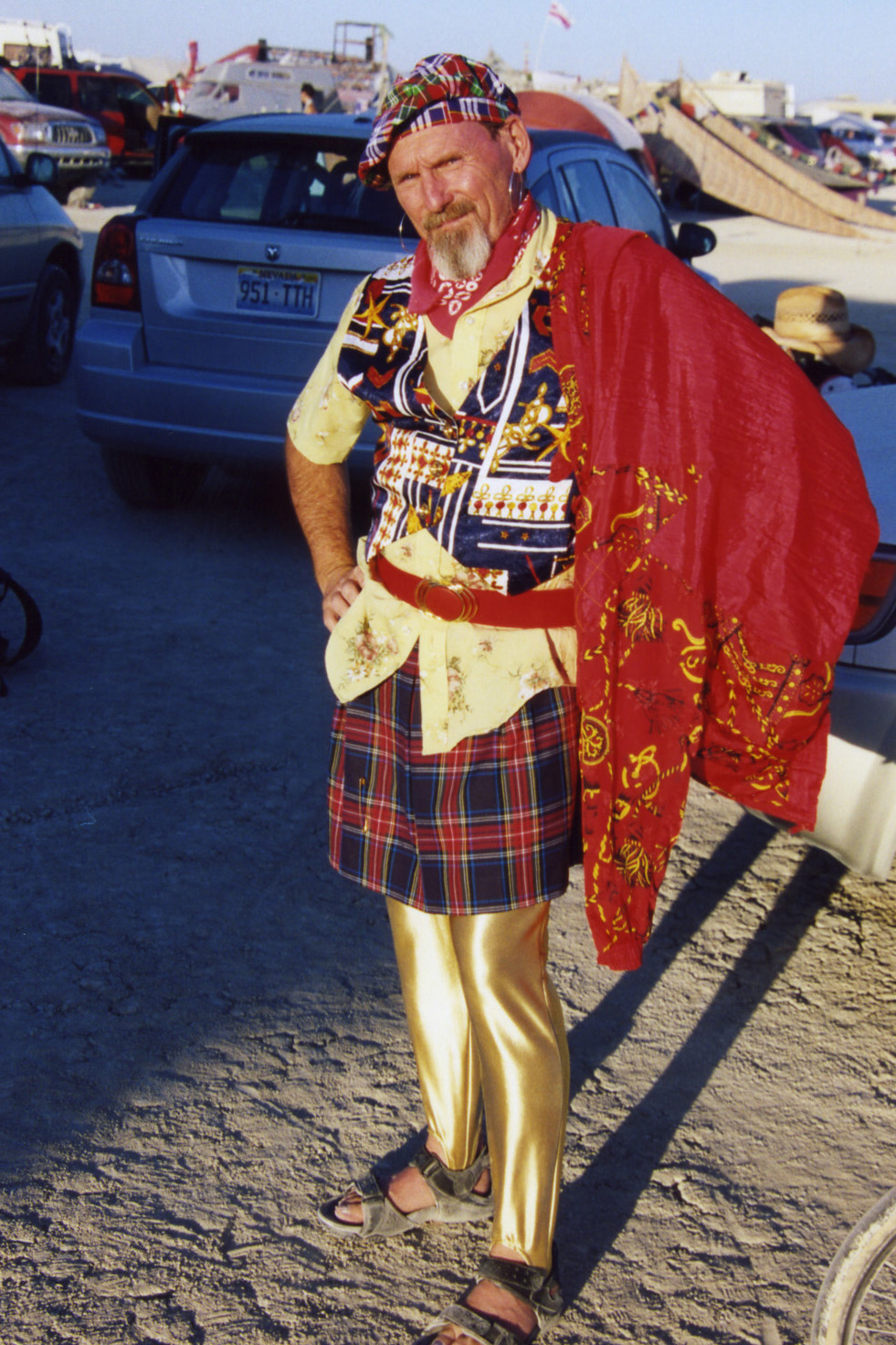 Outrageous costumes make people watching at Burning Man a number one activity. The guy ‘looking the wrong way’ helped make this photo. Note the platform shoes on the woman. She wears them well.